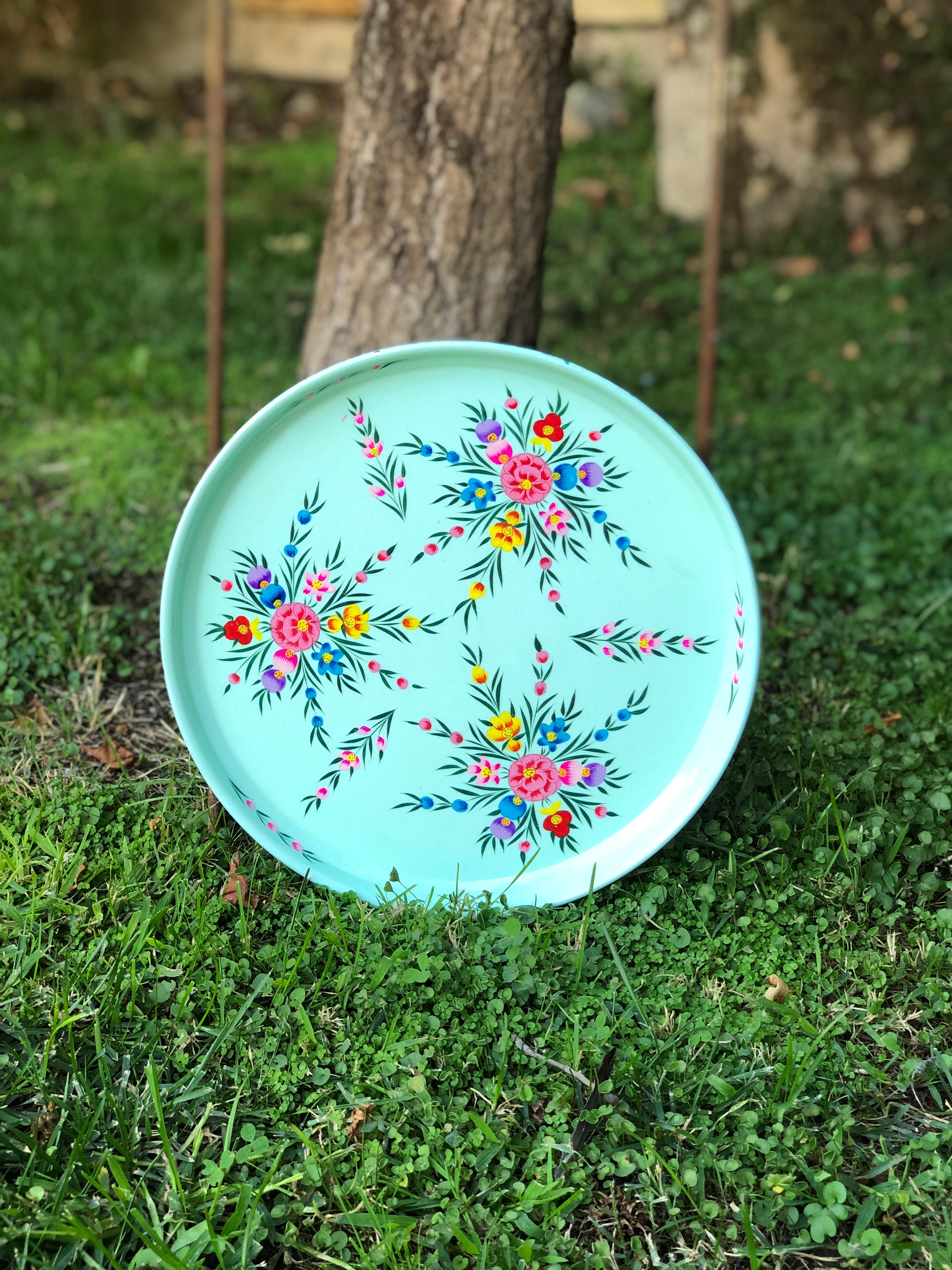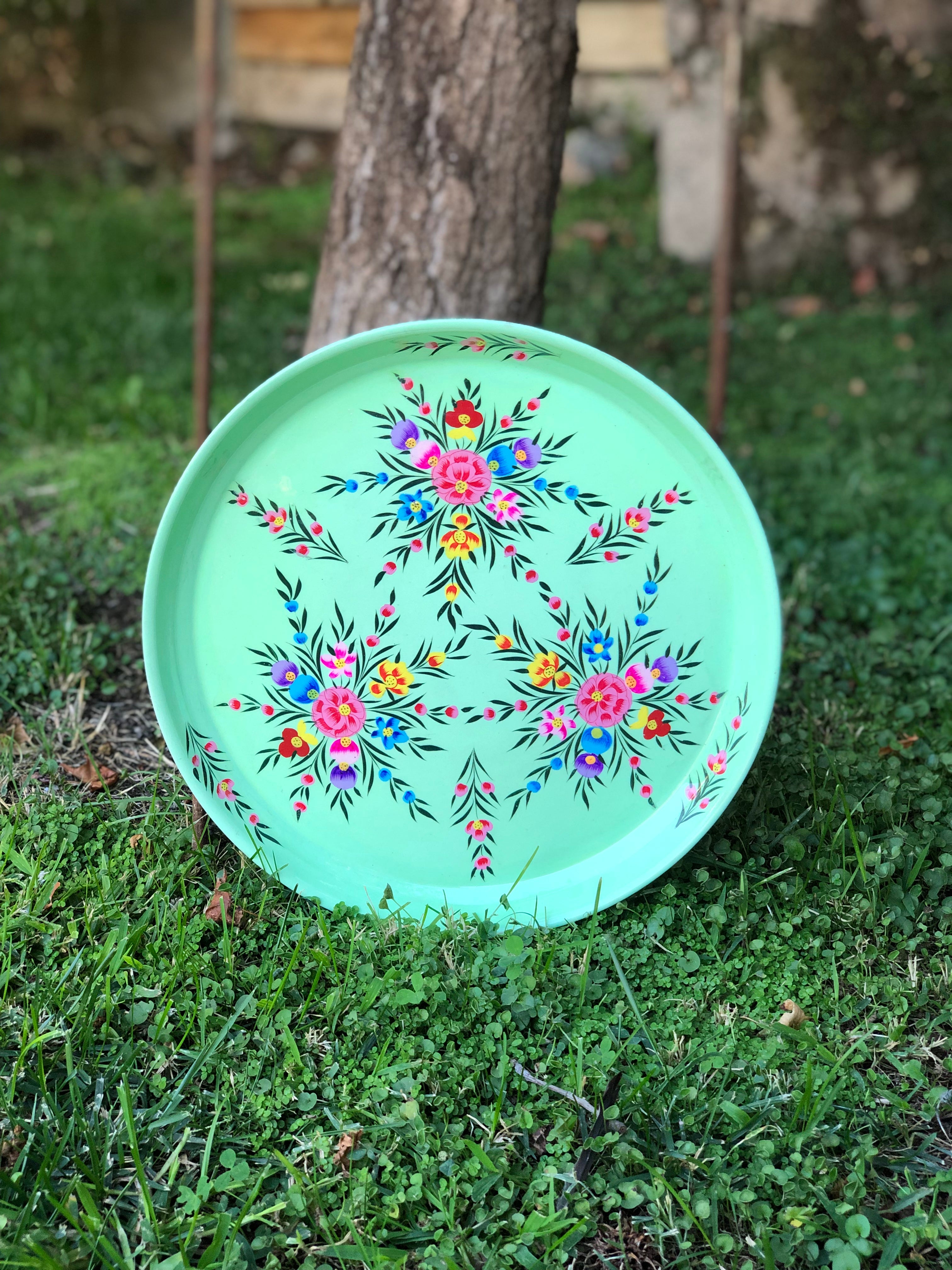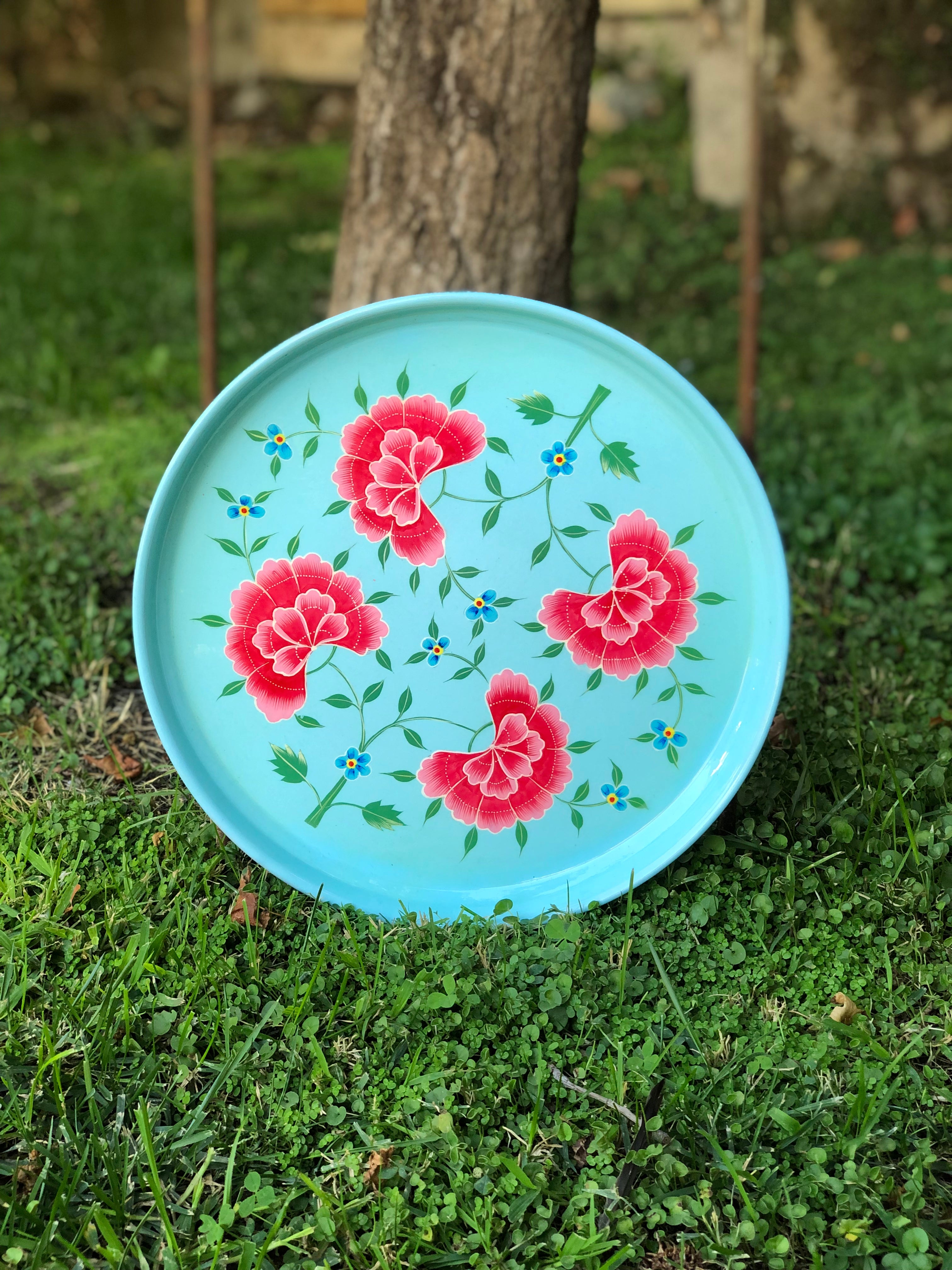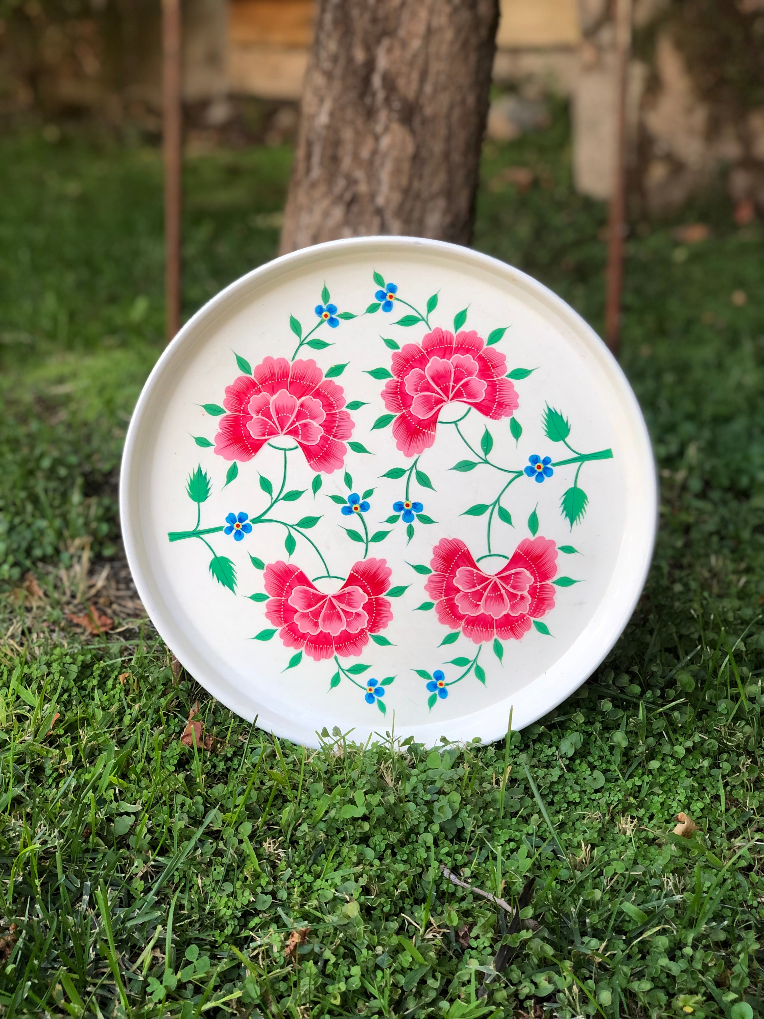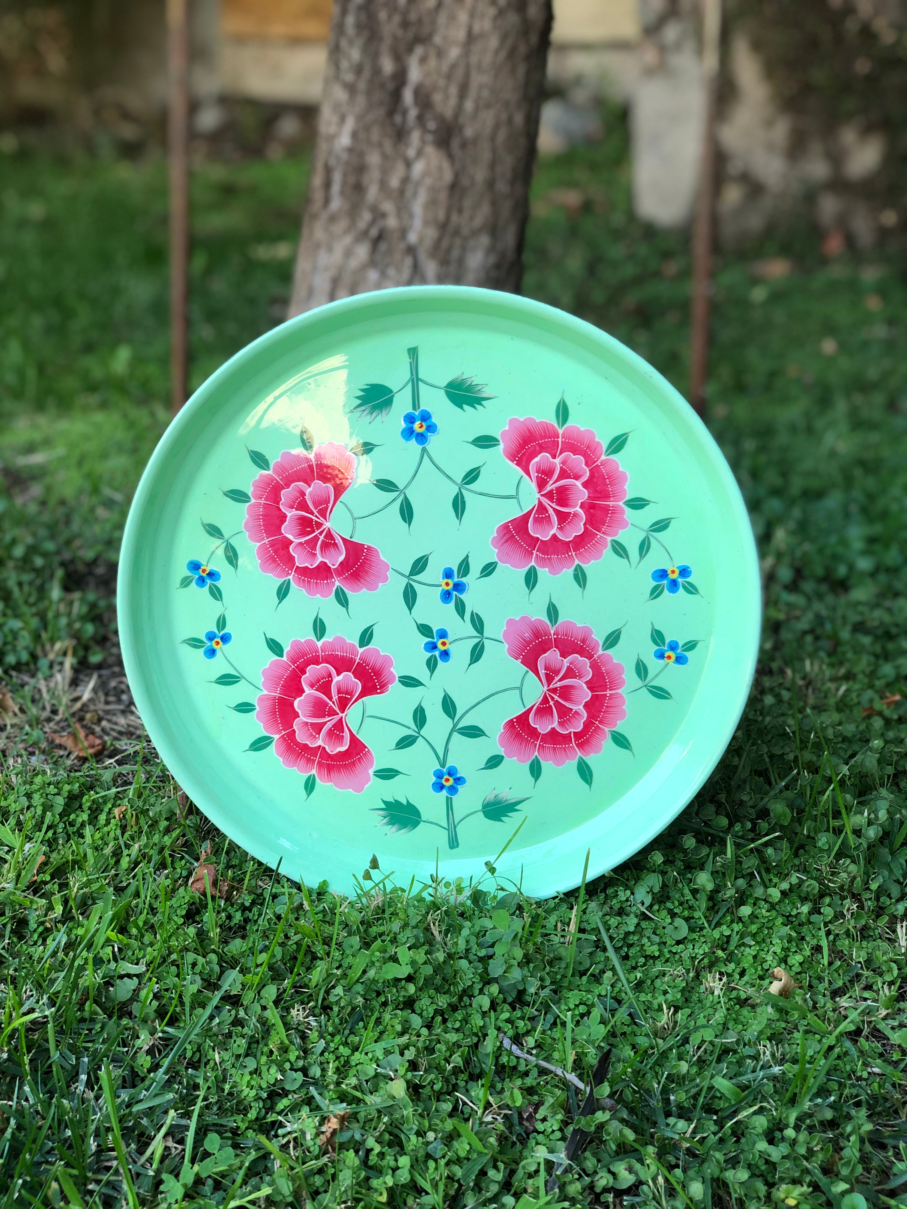 Bandejas redondas de acero inoxidable pintadas y esmaltadas en la India.