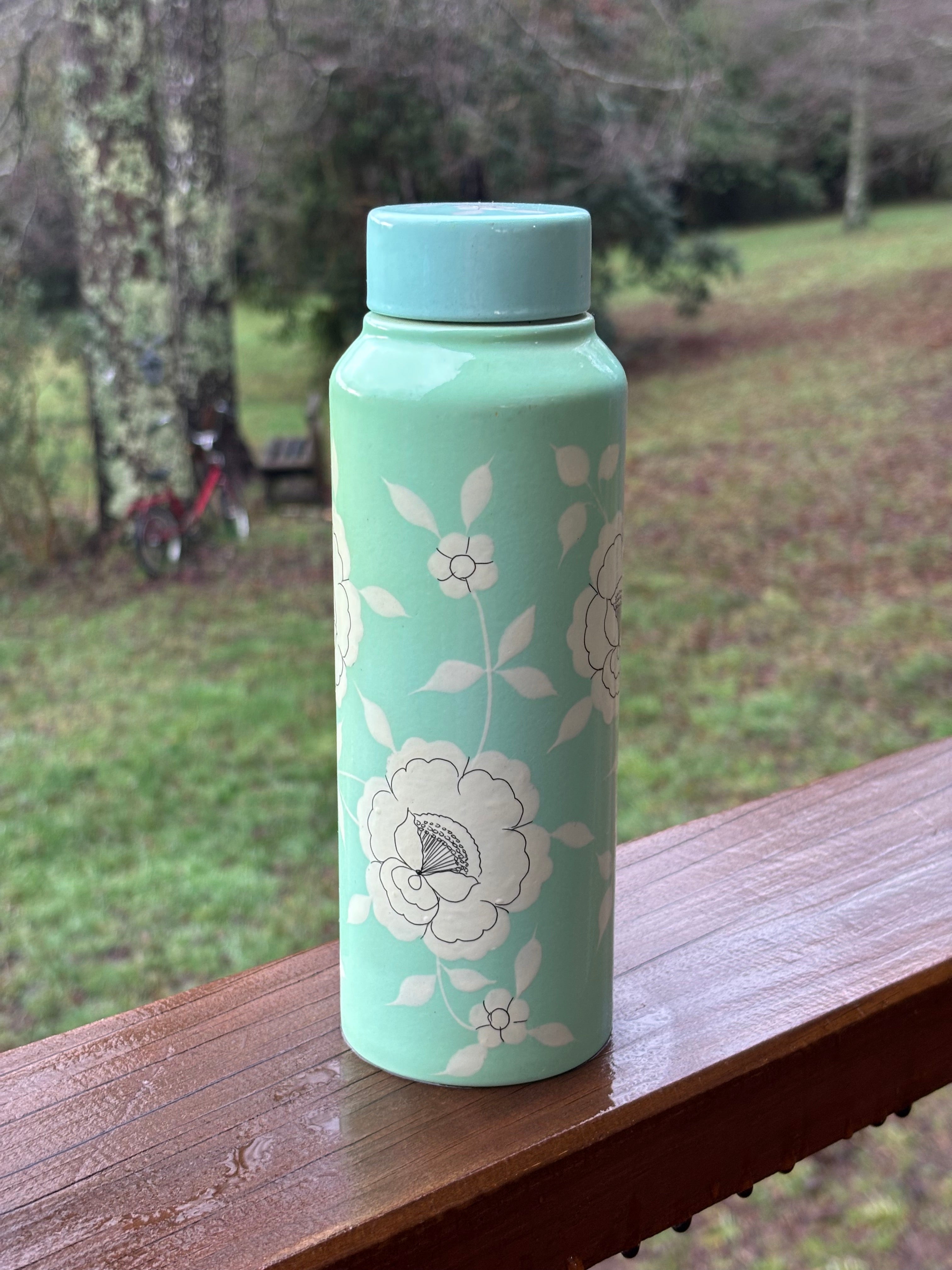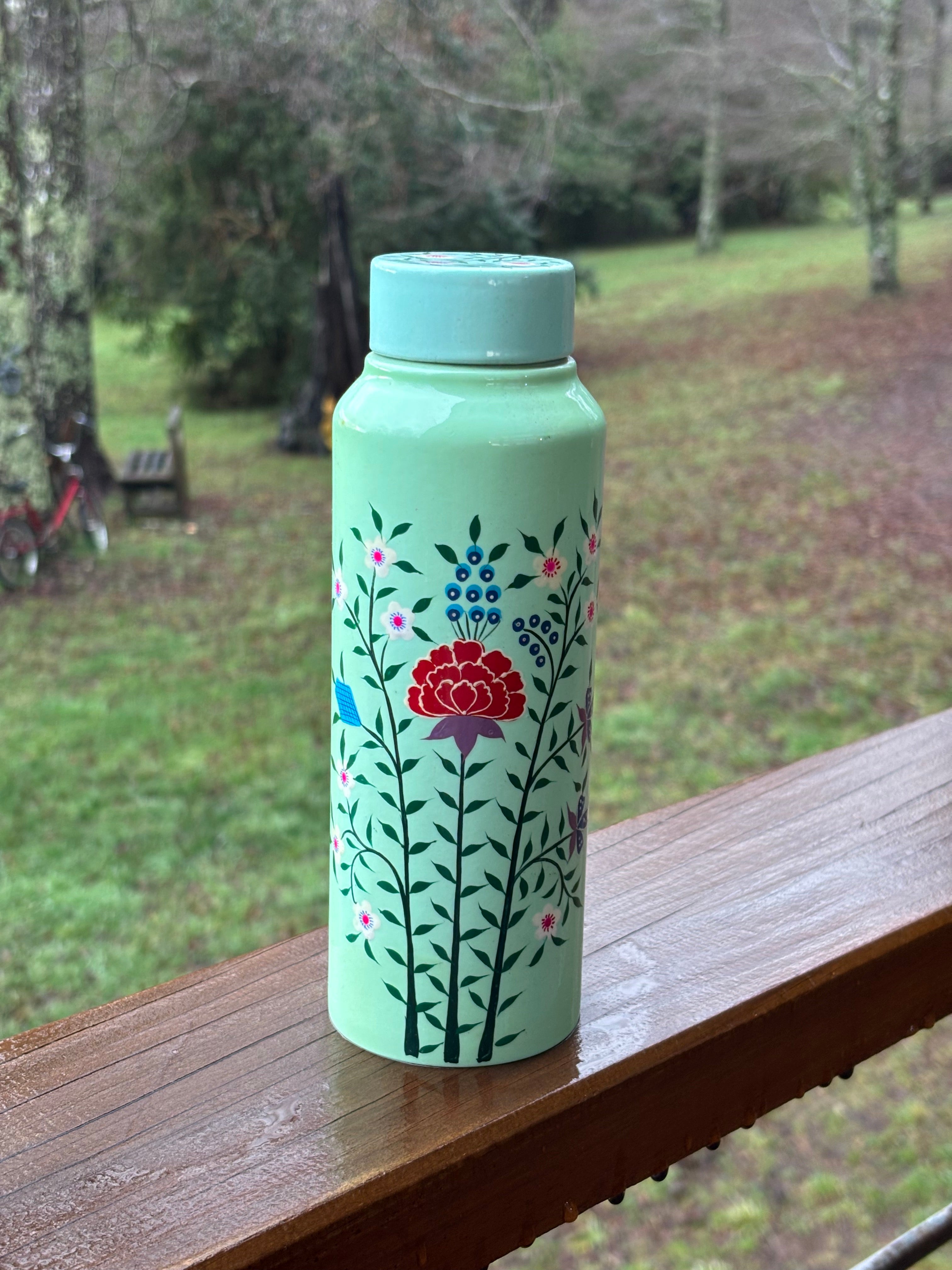 Botella de acero inoxidable pintada y esmaltada a mano por artesanos en la India.