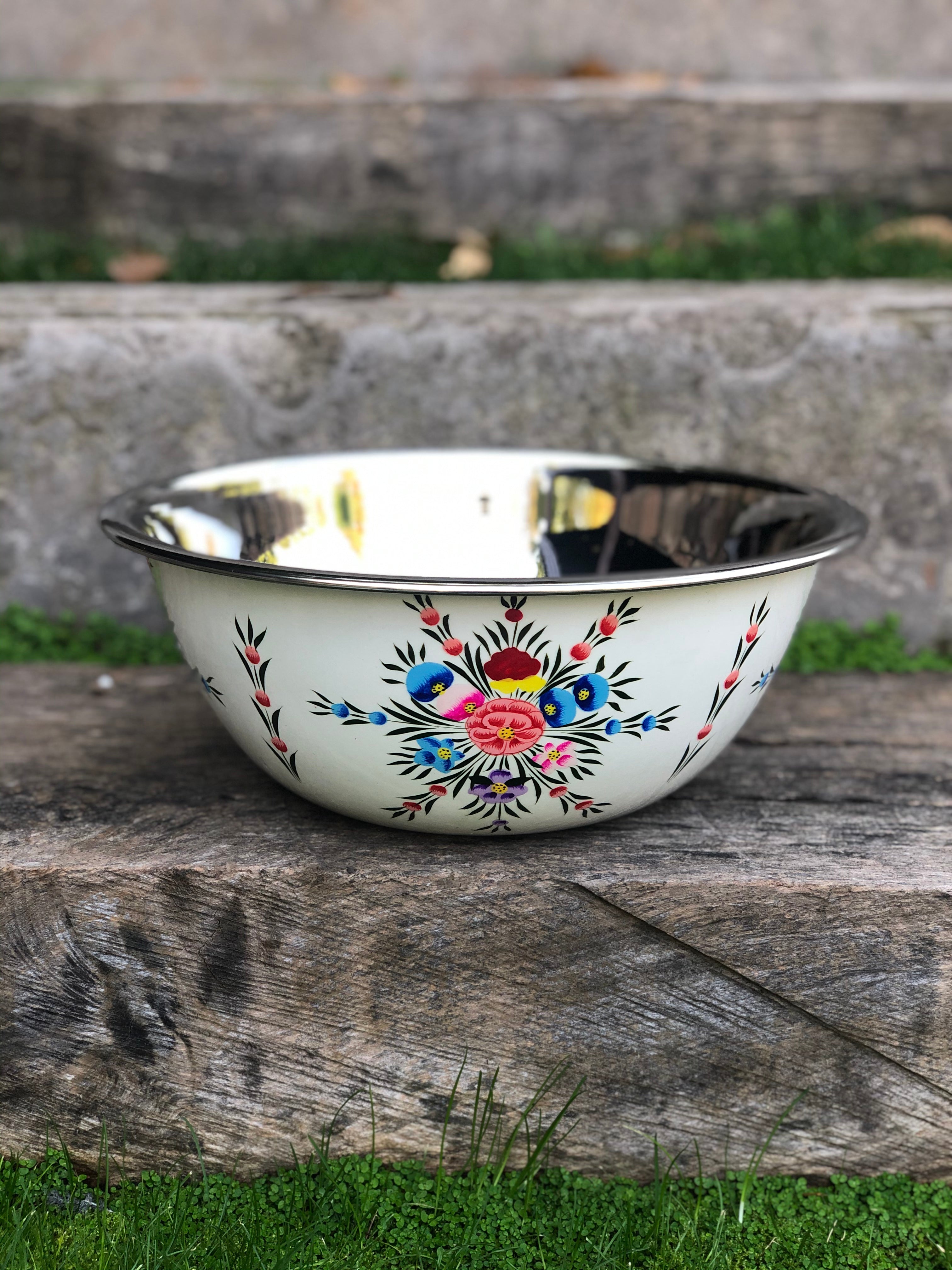 Bowls de acero inoxidable pintados a mano alzada con preciosos detalles florales por artesanos en la India.