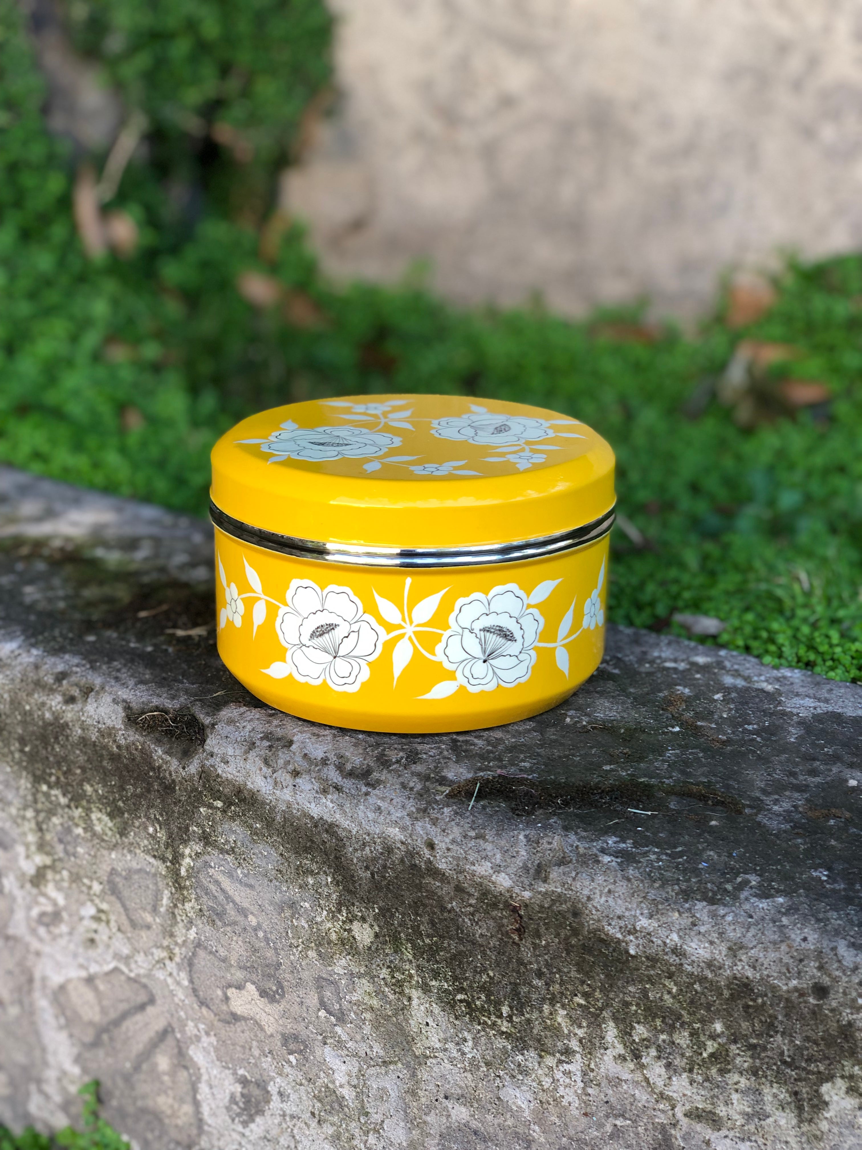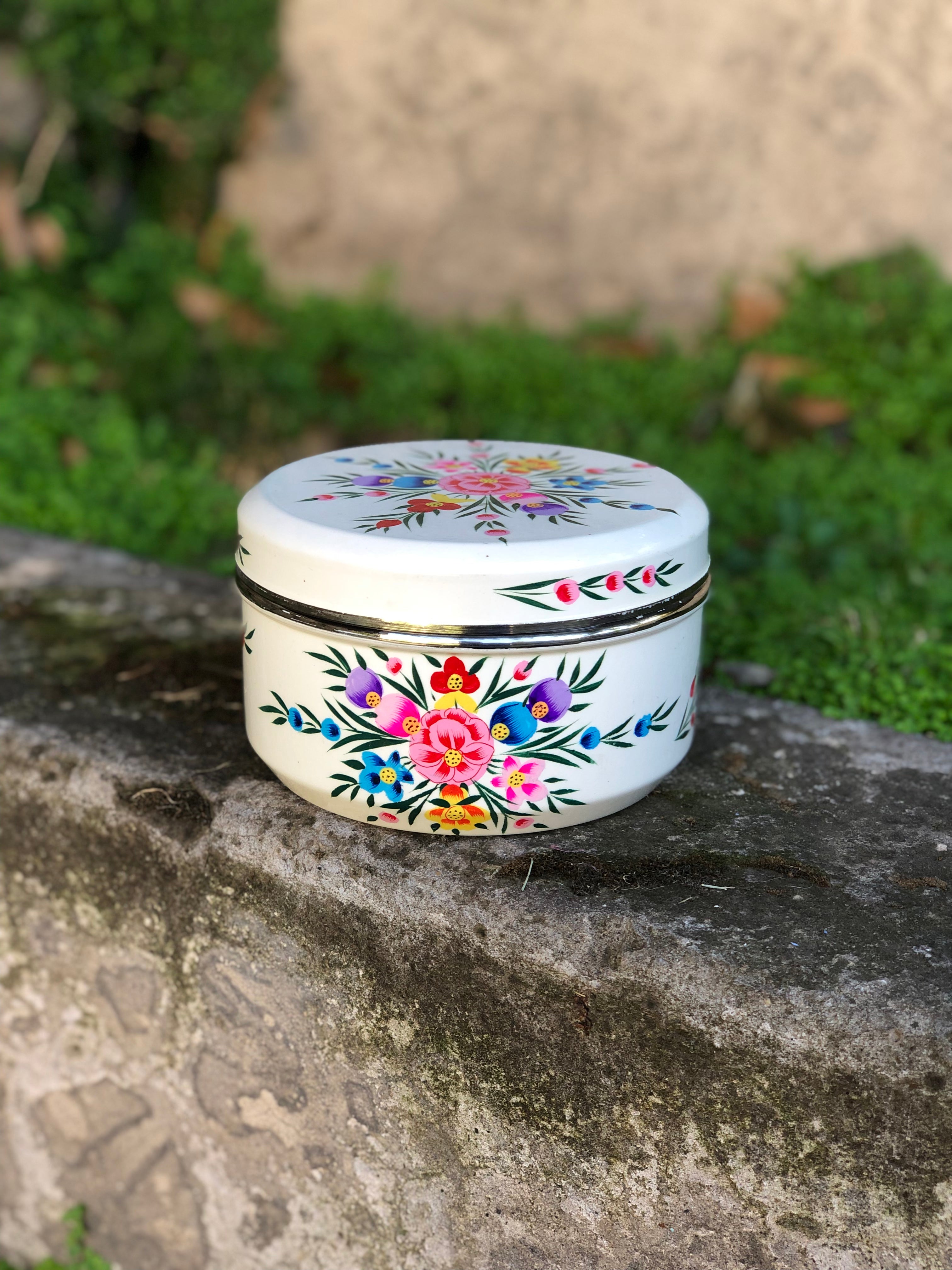 Cajitas redondas de acero inoxidable grueso y firme pintadas a mano y esmaltadas en la India.