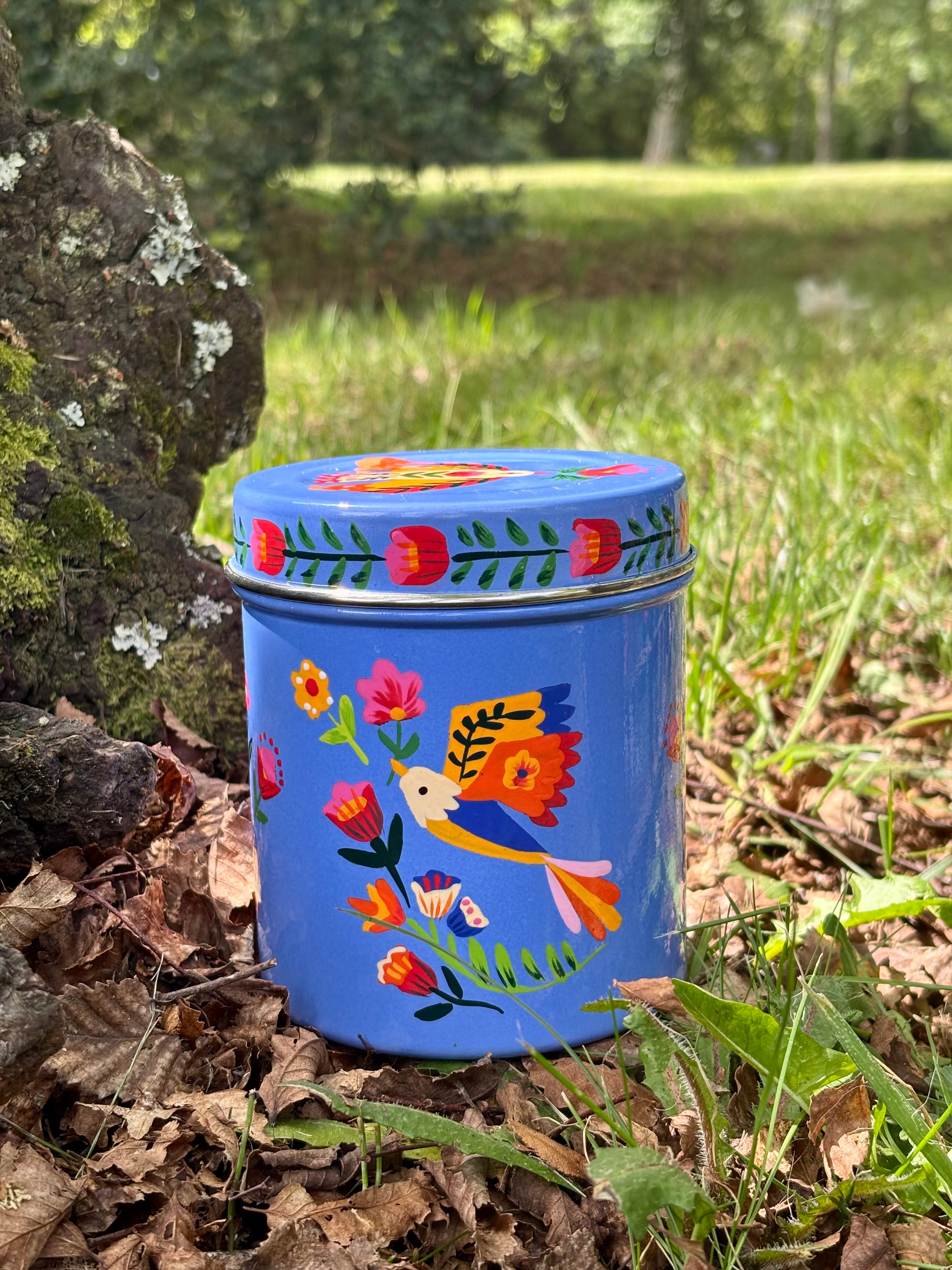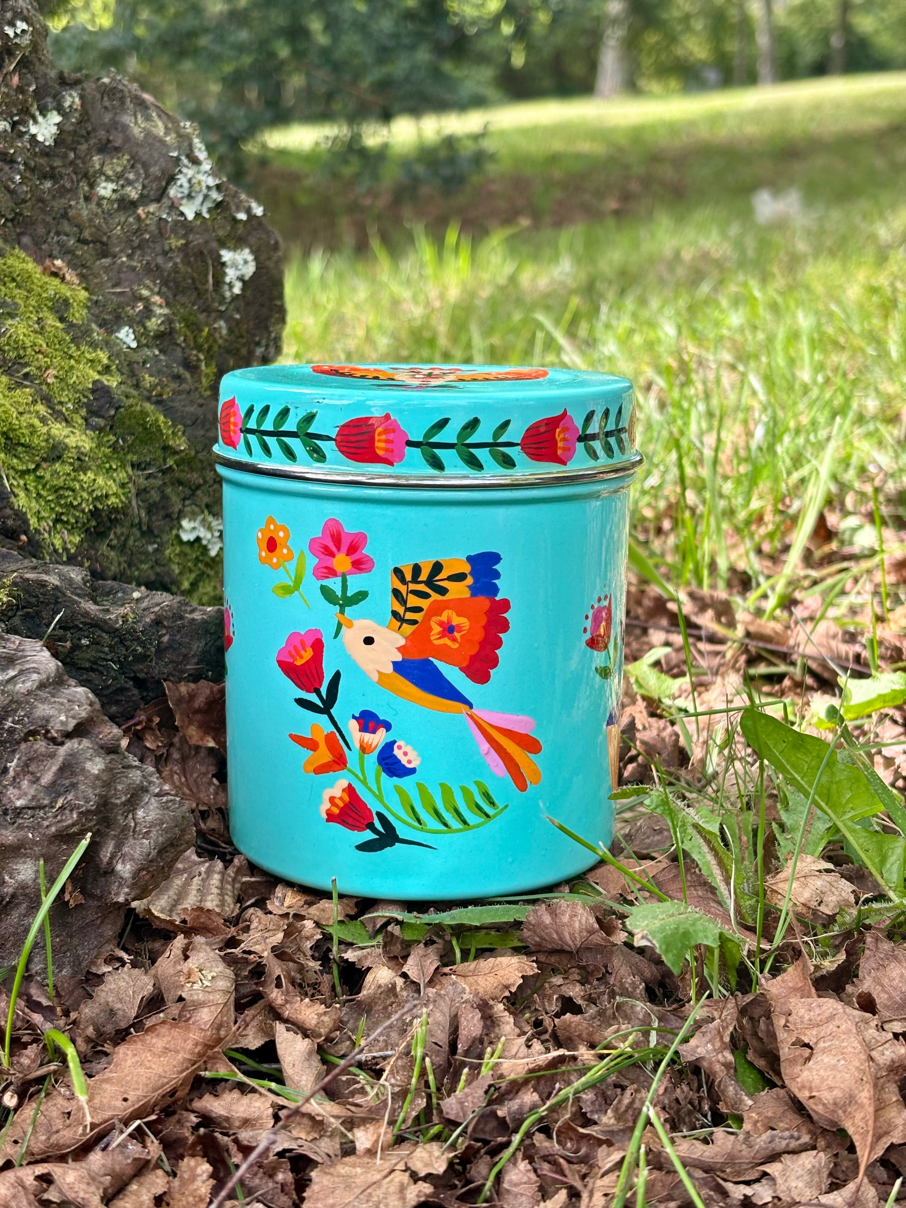 Cajitas redondas de acero inoxidable pintadas y esmaltadas a mano alzada por artesanos en la India, replicando la maravillosa ilustración de la artista nacional Pepa Espinoza.