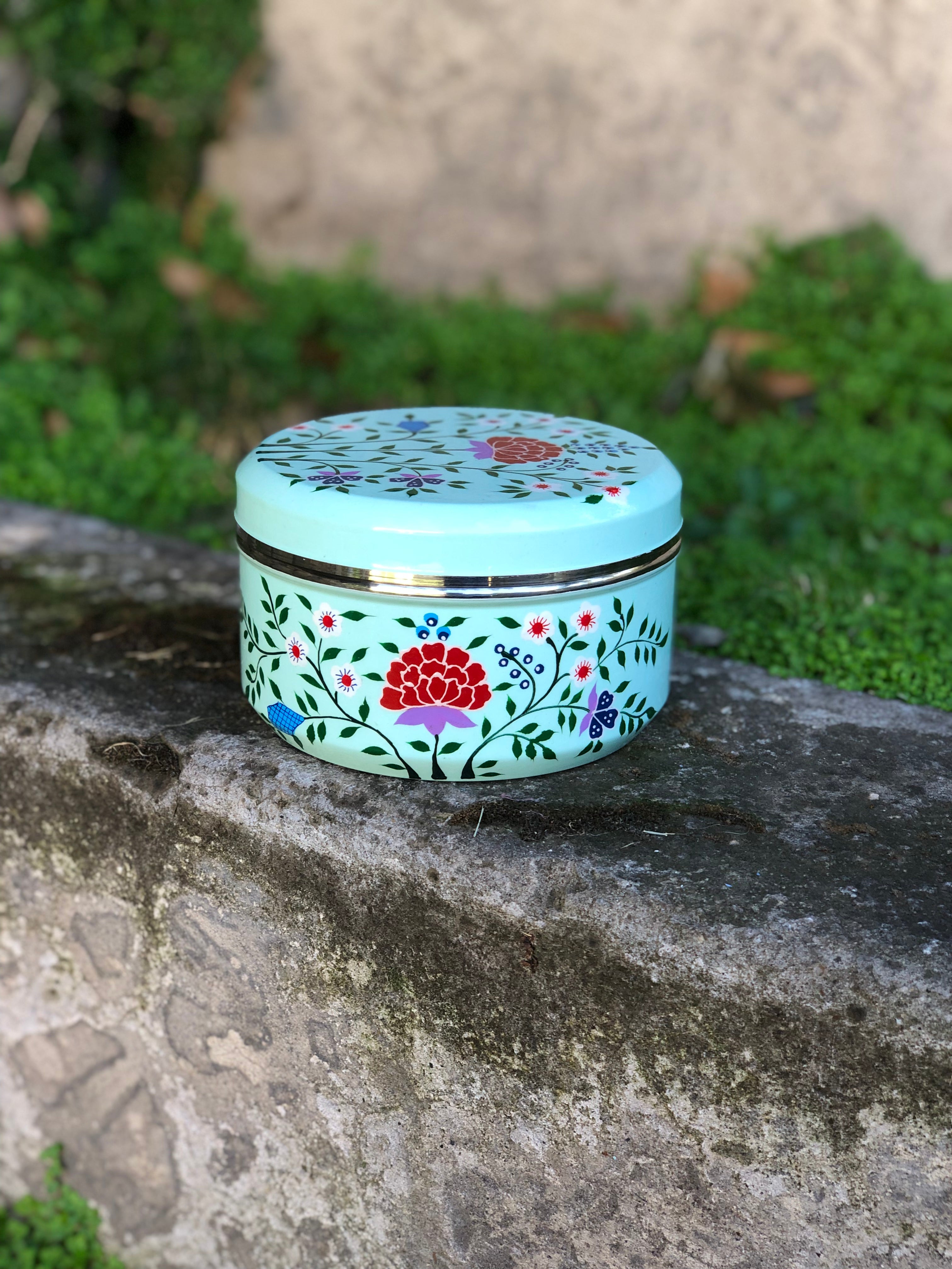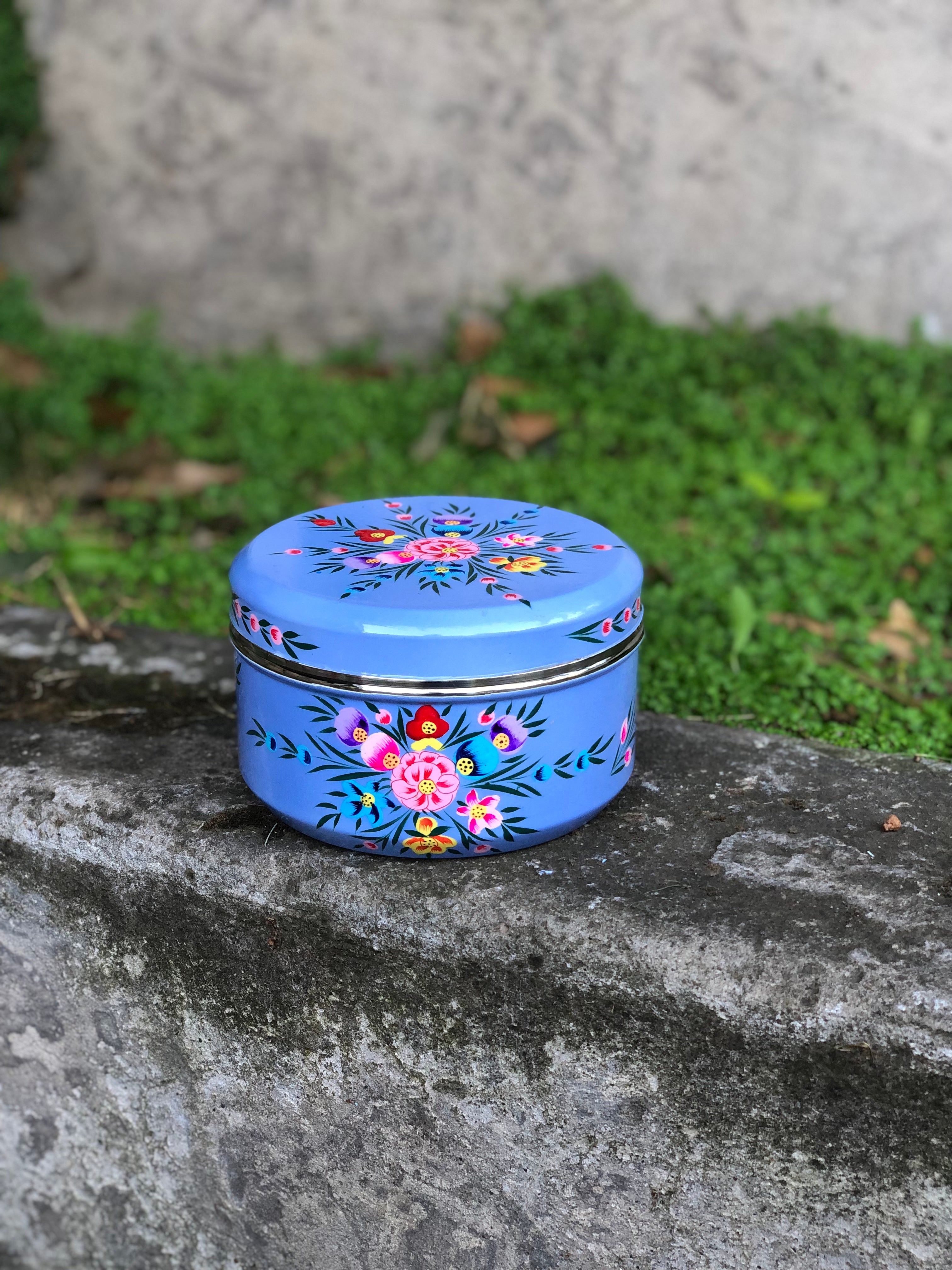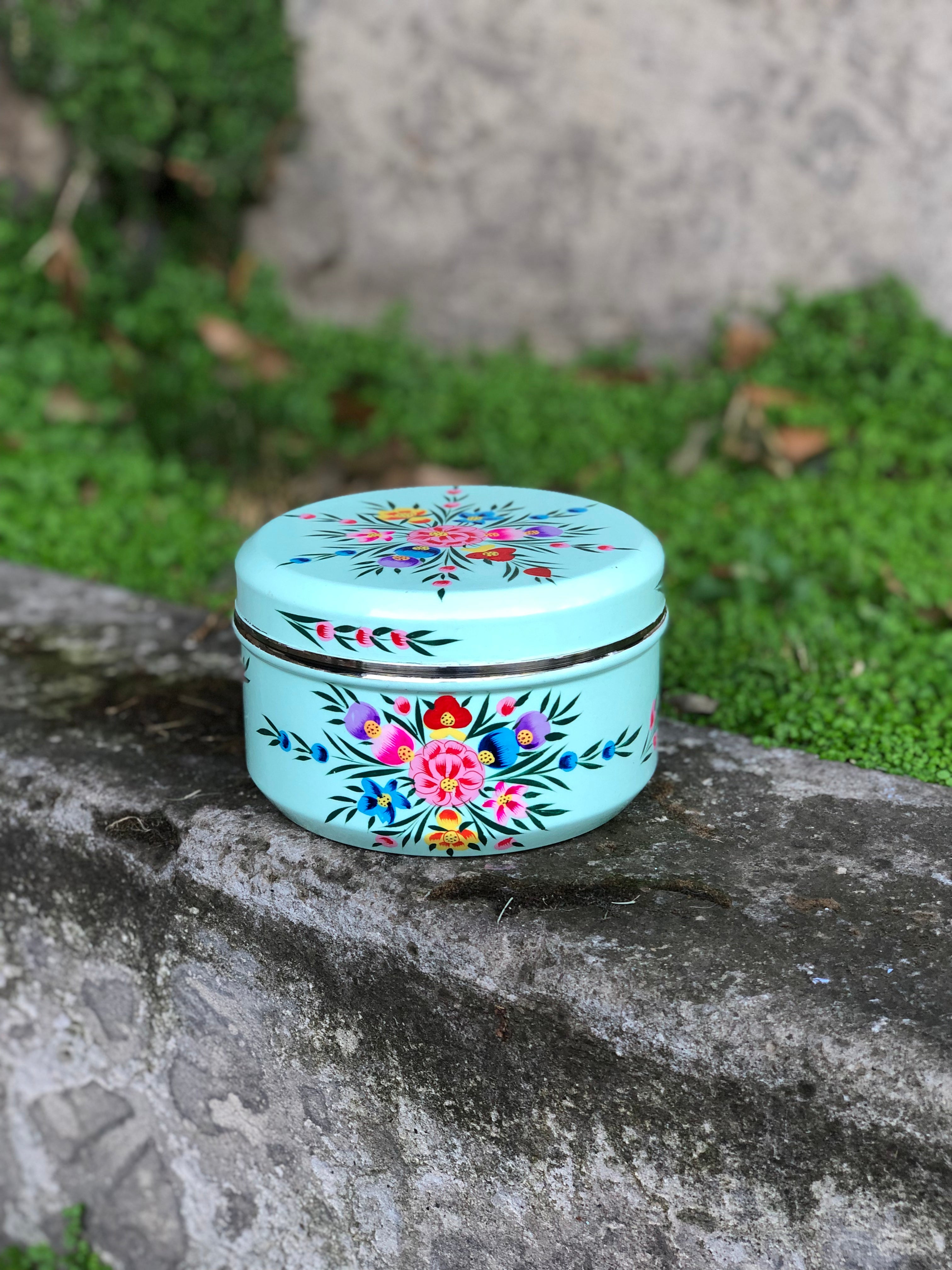 Cajitas redondas de acero inoxidable grueso y firme pintadas a mano y esmaltadas en la India.