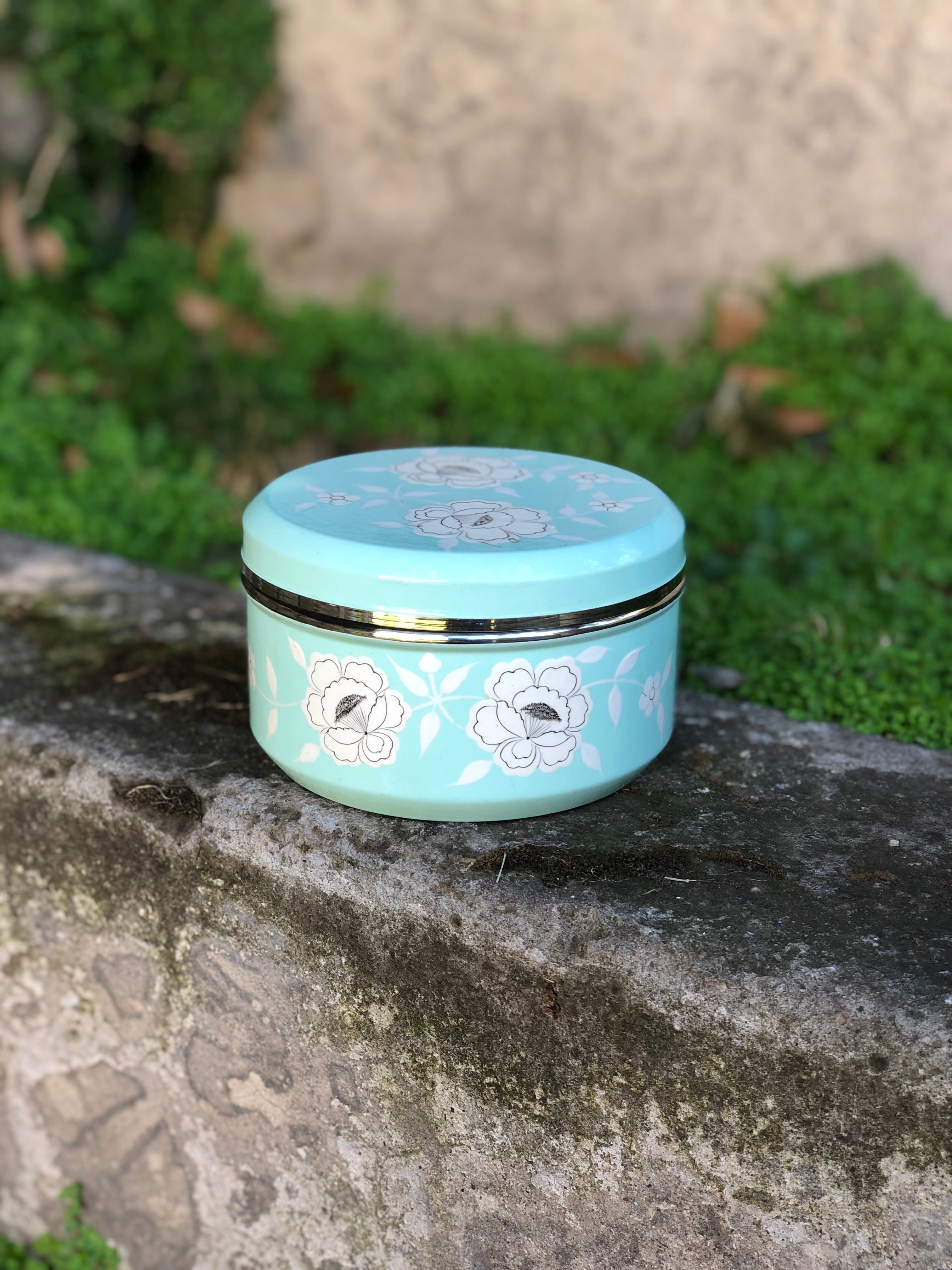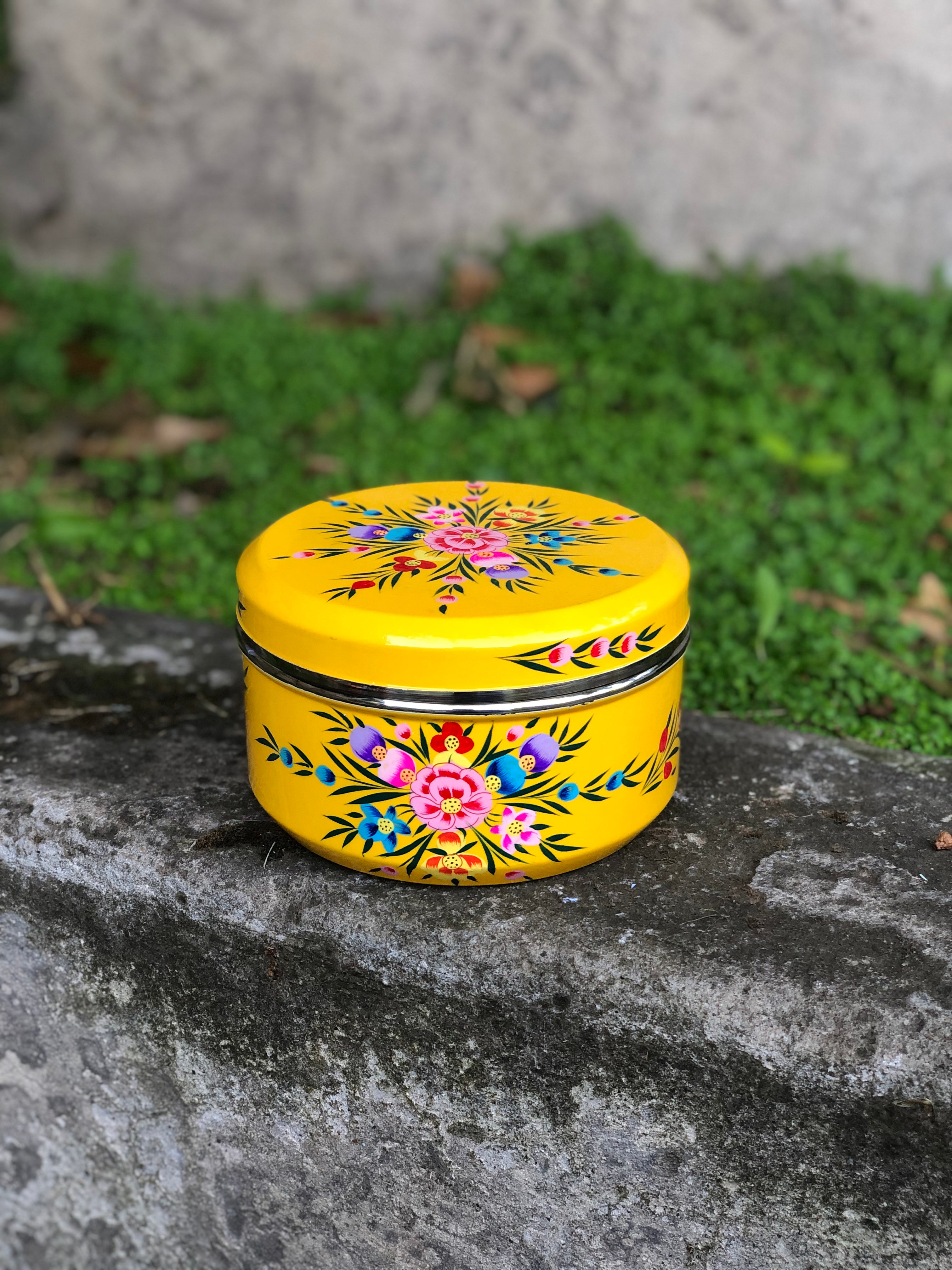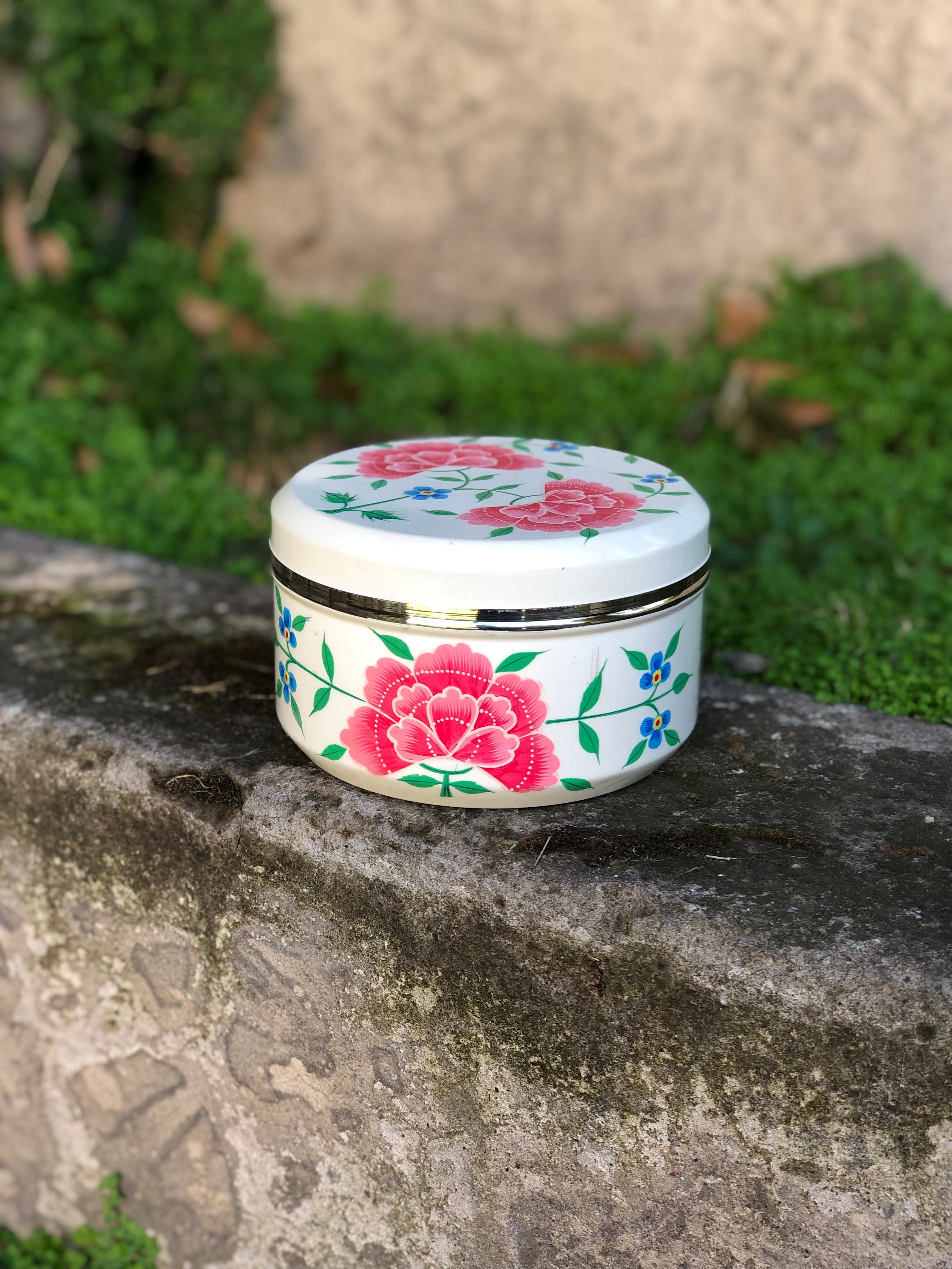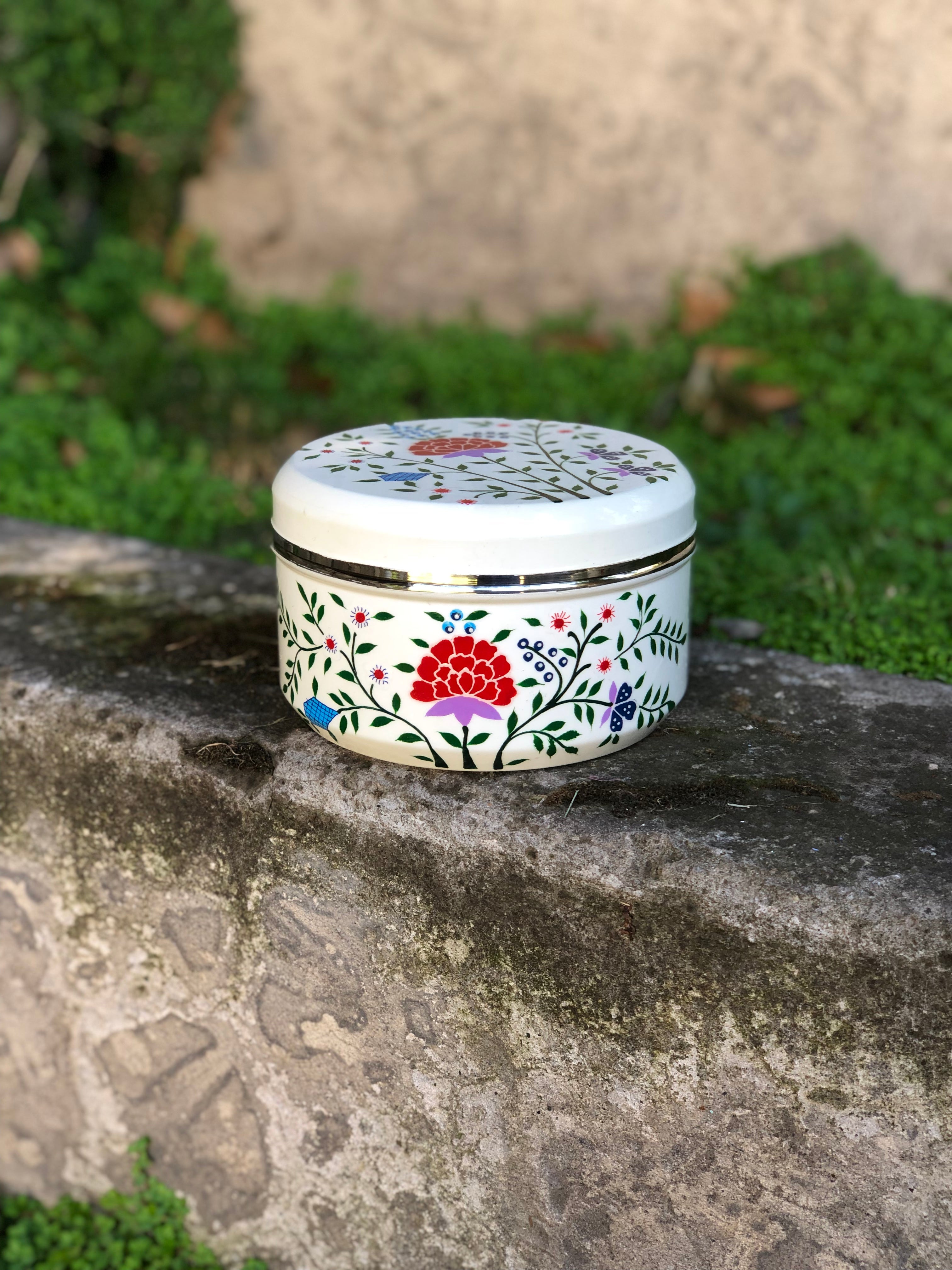 Cajitas redondas de acero inoxidable grueso y firme pintadas a mano y esmaltadas en la India.