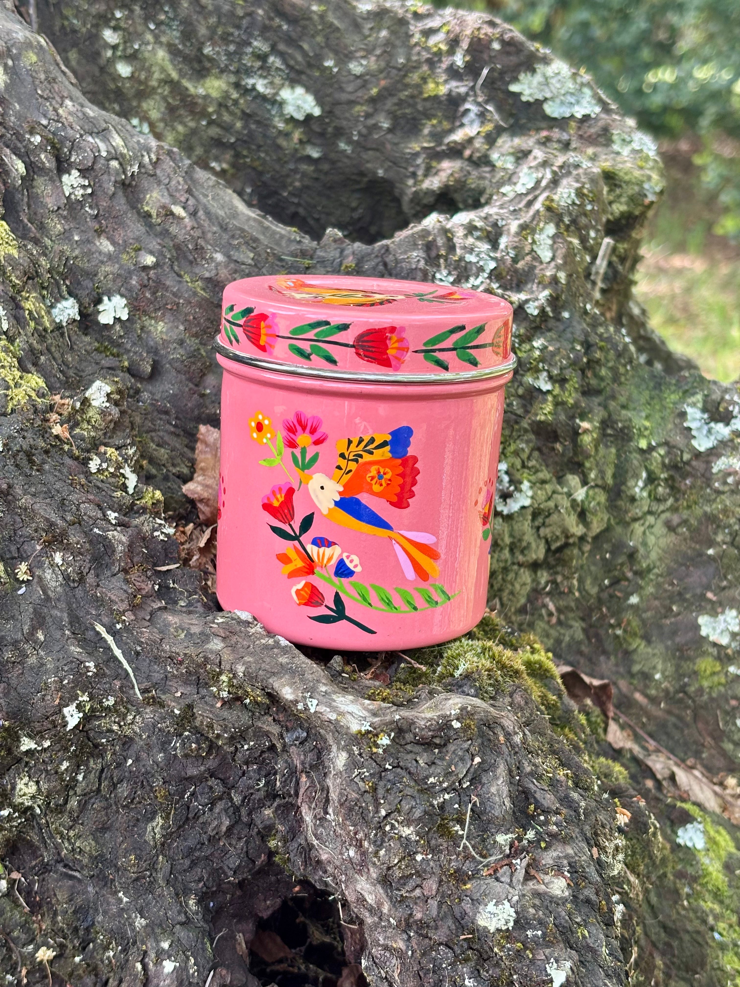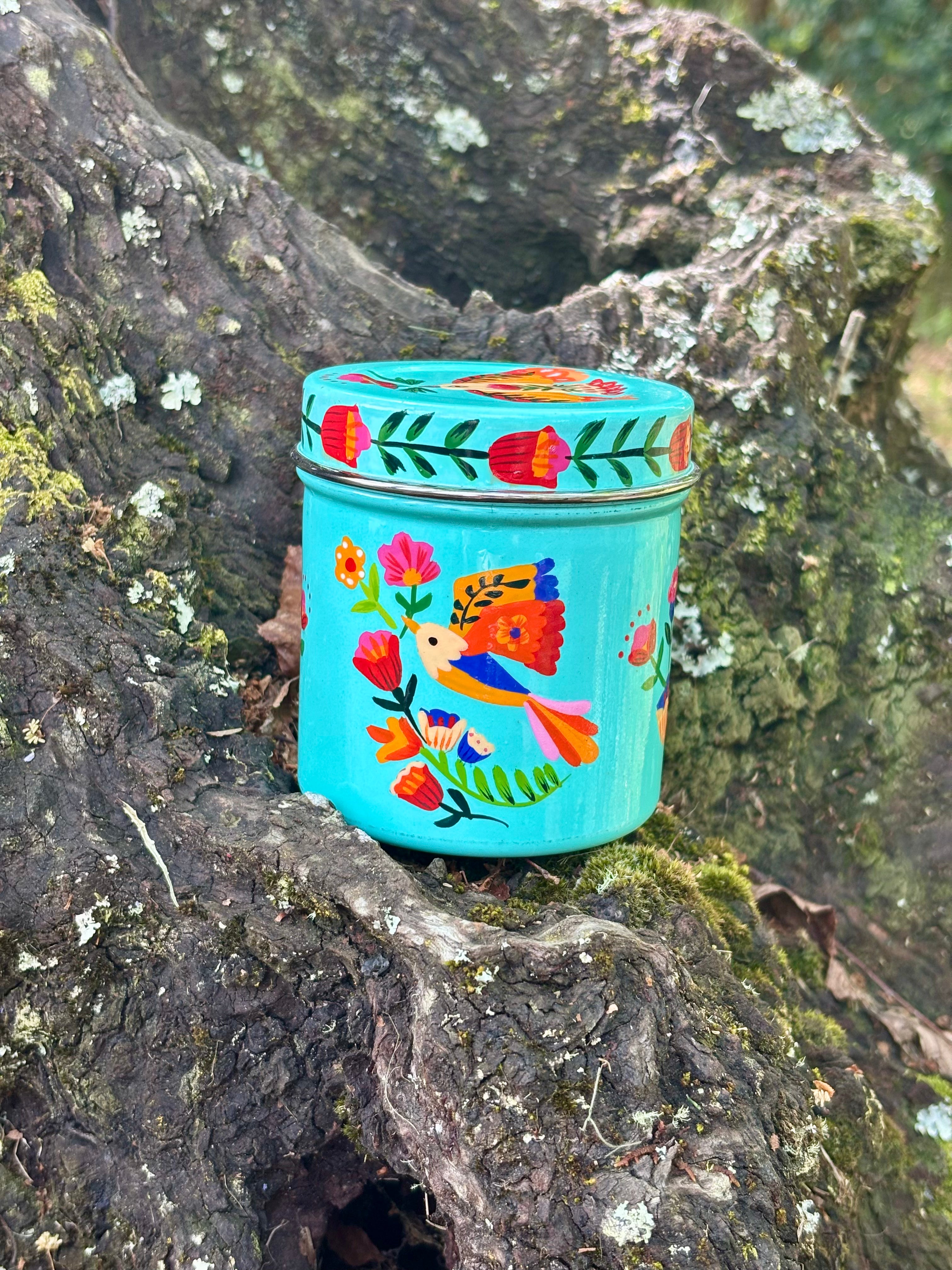 Cajitas redondas de acero inoxidable pintadas y esmaltadas a mano alzada por artesanos en la India, replicando la maravillosa ilustración de la artista nacional Pepa Espinoza.