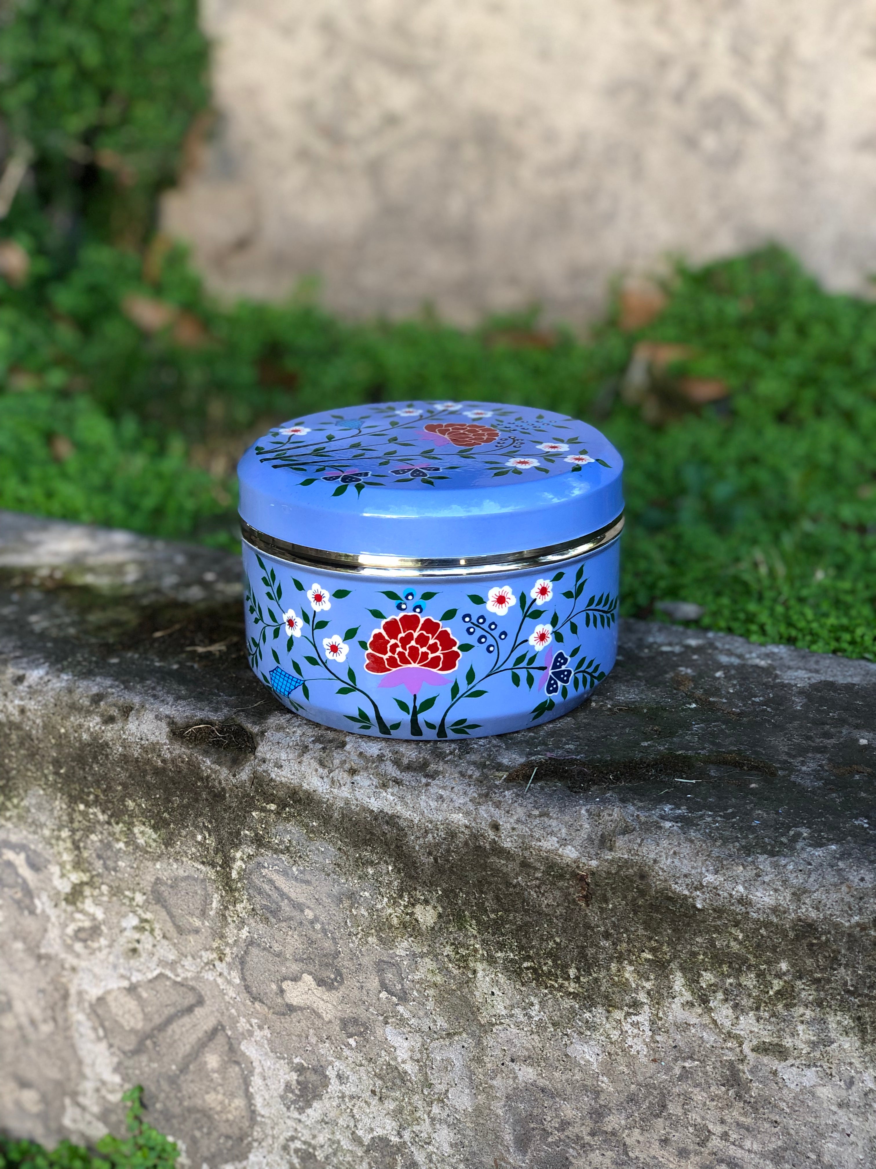 Cajitas de acero inoxidable grueso y firme pintadas y esmaltadas en la India.
