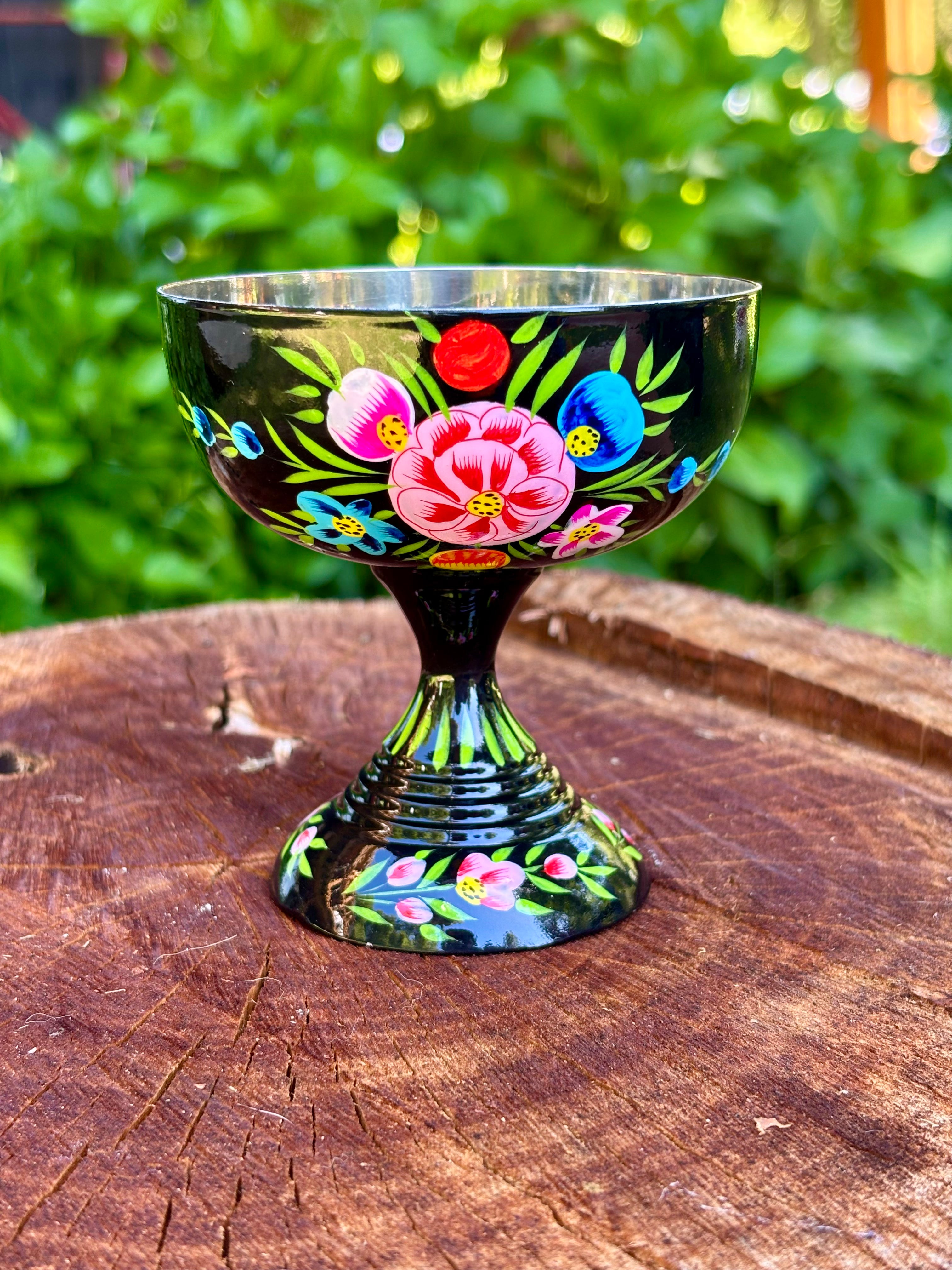 Copas de acero inoxidable pintadas a mano alzada y esmaltadas por artesanos en la India.