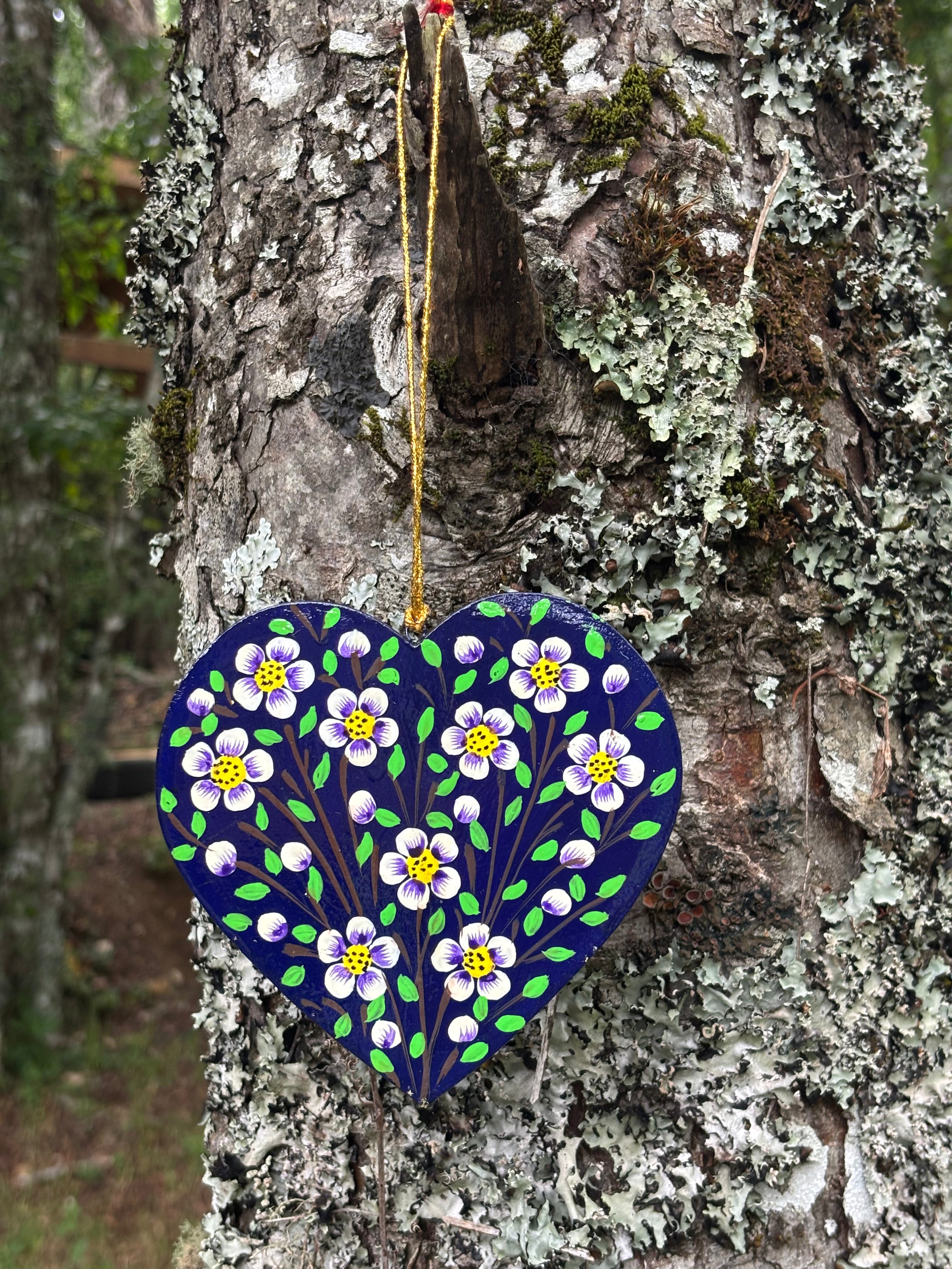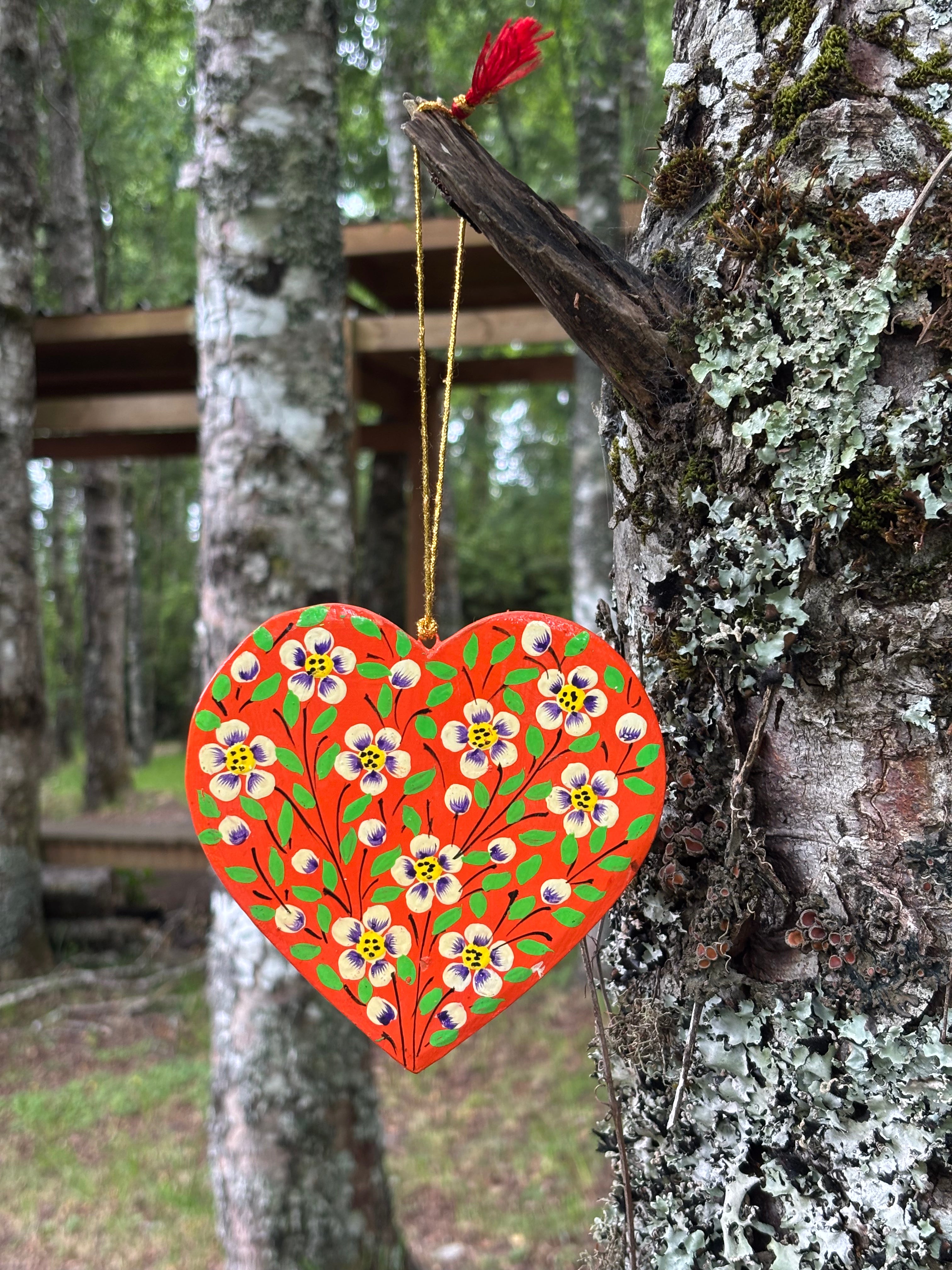 Corazones hechos a mano en madera delgada por artesanos en la India.