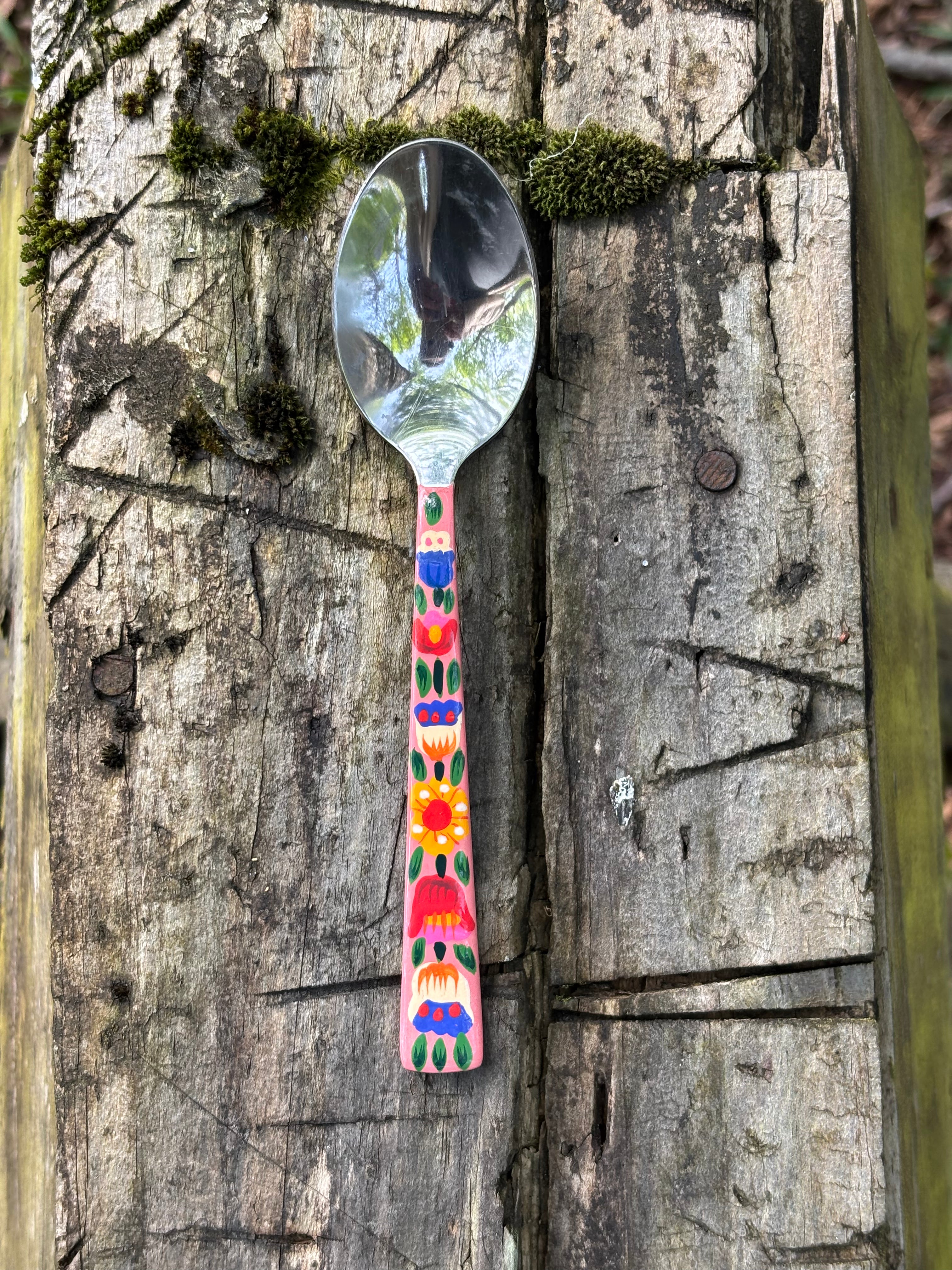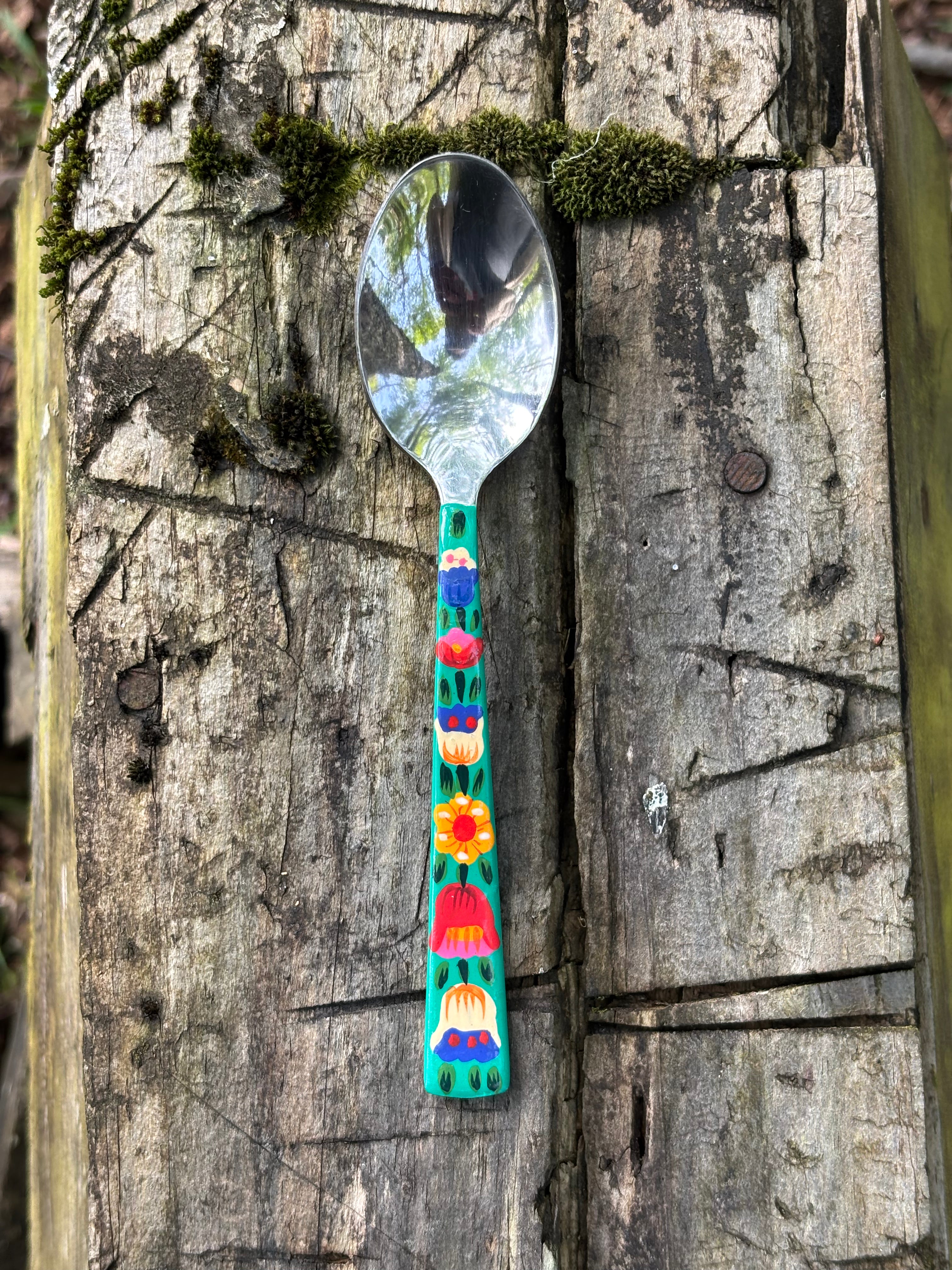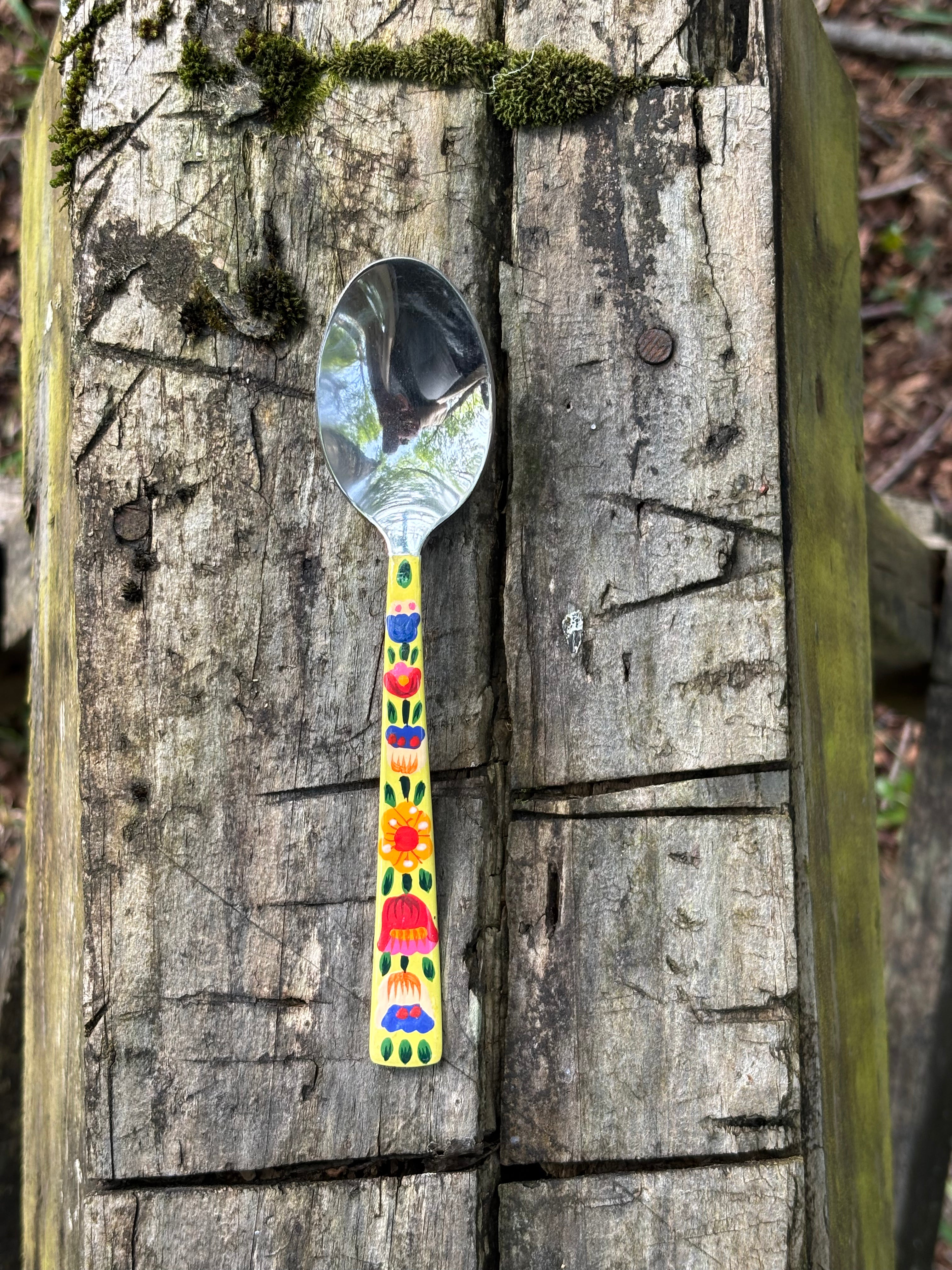 Cucharas de té de acero inoxidable pintadas y esmaltadas por artesanos en la India, replicando la ilustración de la artista nacional Pepa Espinoza.