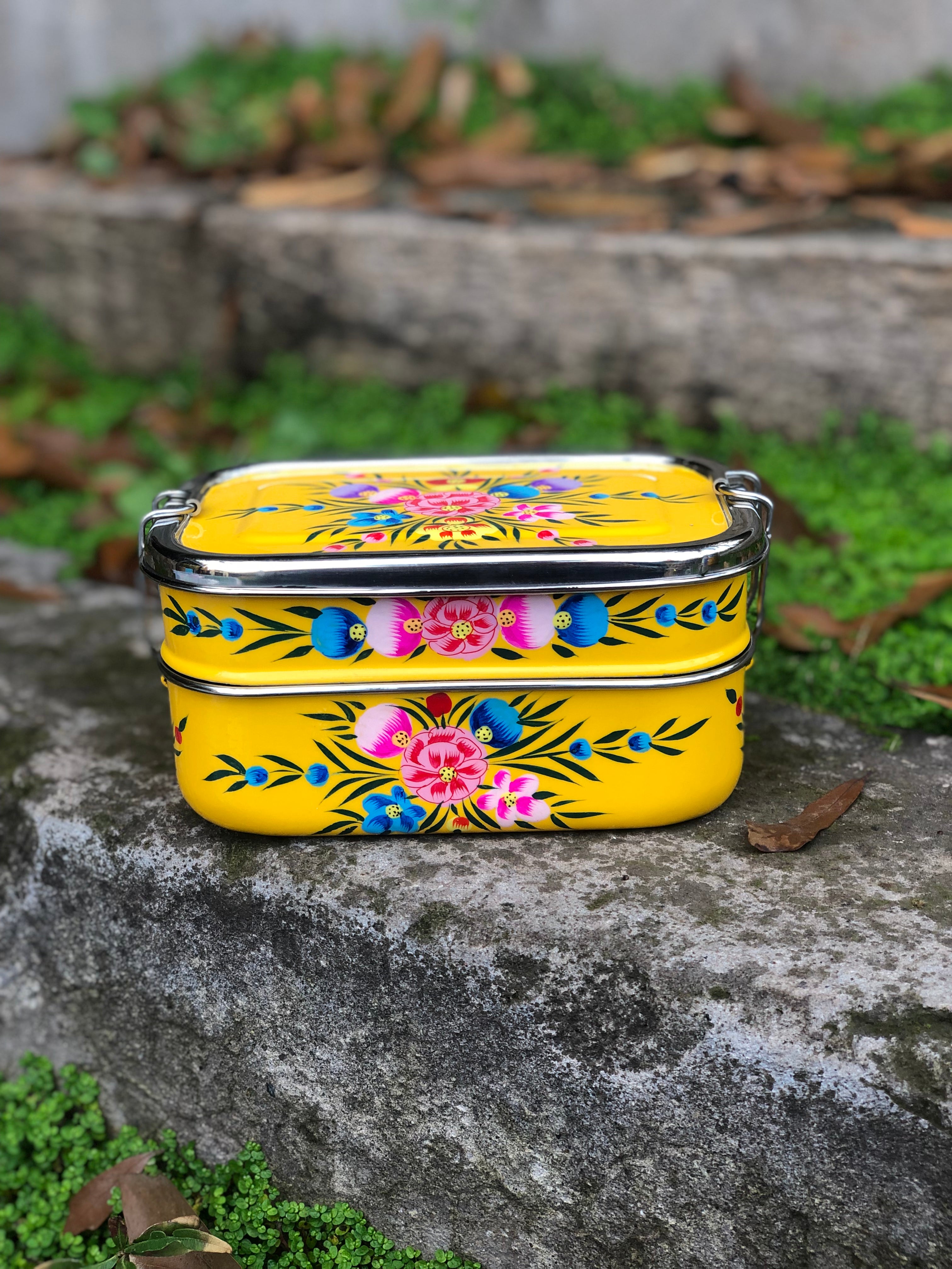 Loncheras de acero inoxidable pintadas a mano alzada por artesanos en la India.
