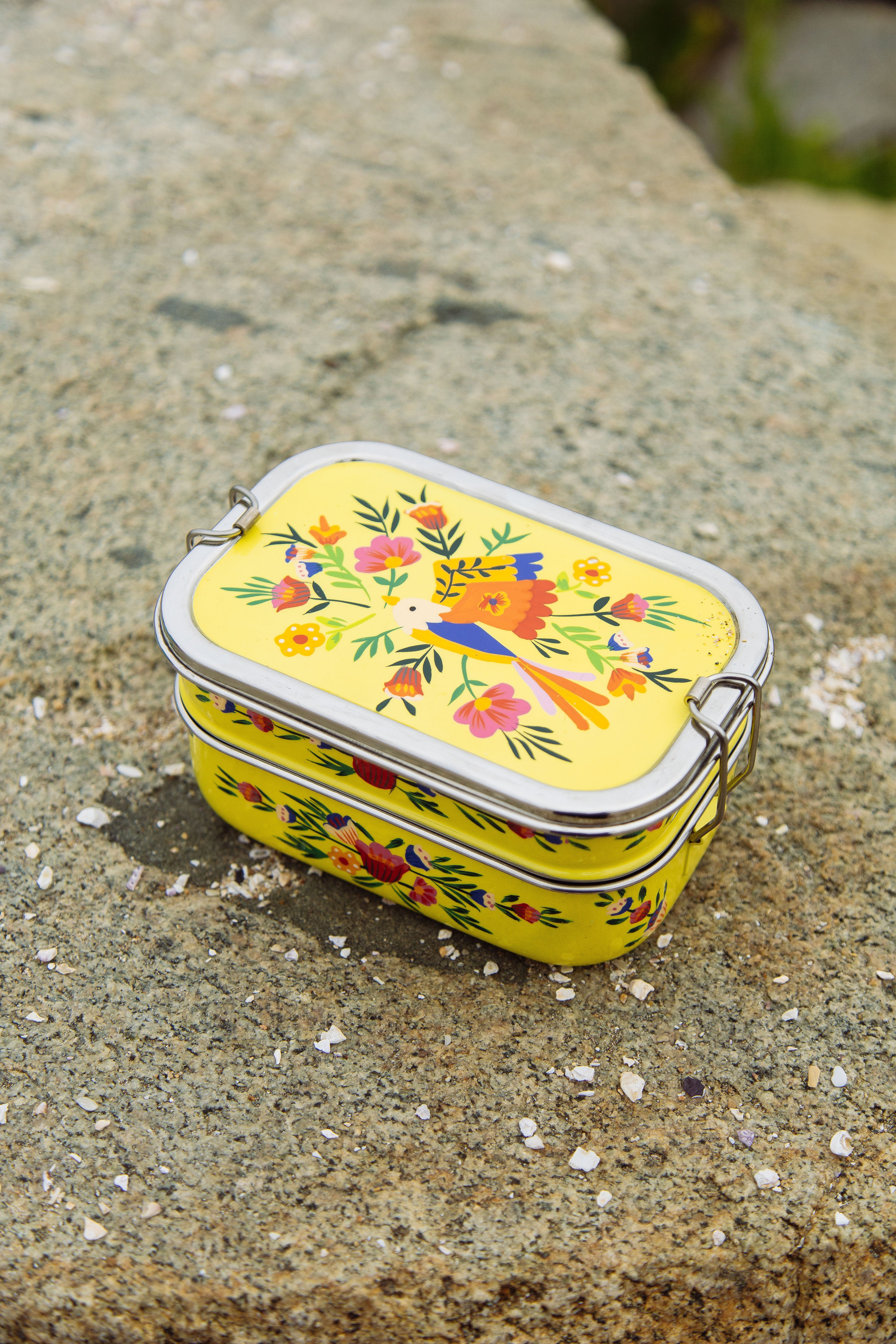 Loncheras de acero inoxidable pintadas a mano alzada por artesanos en la India, replicando la maravillosa ilustración de la artista nacional Pepa Espinoza.
