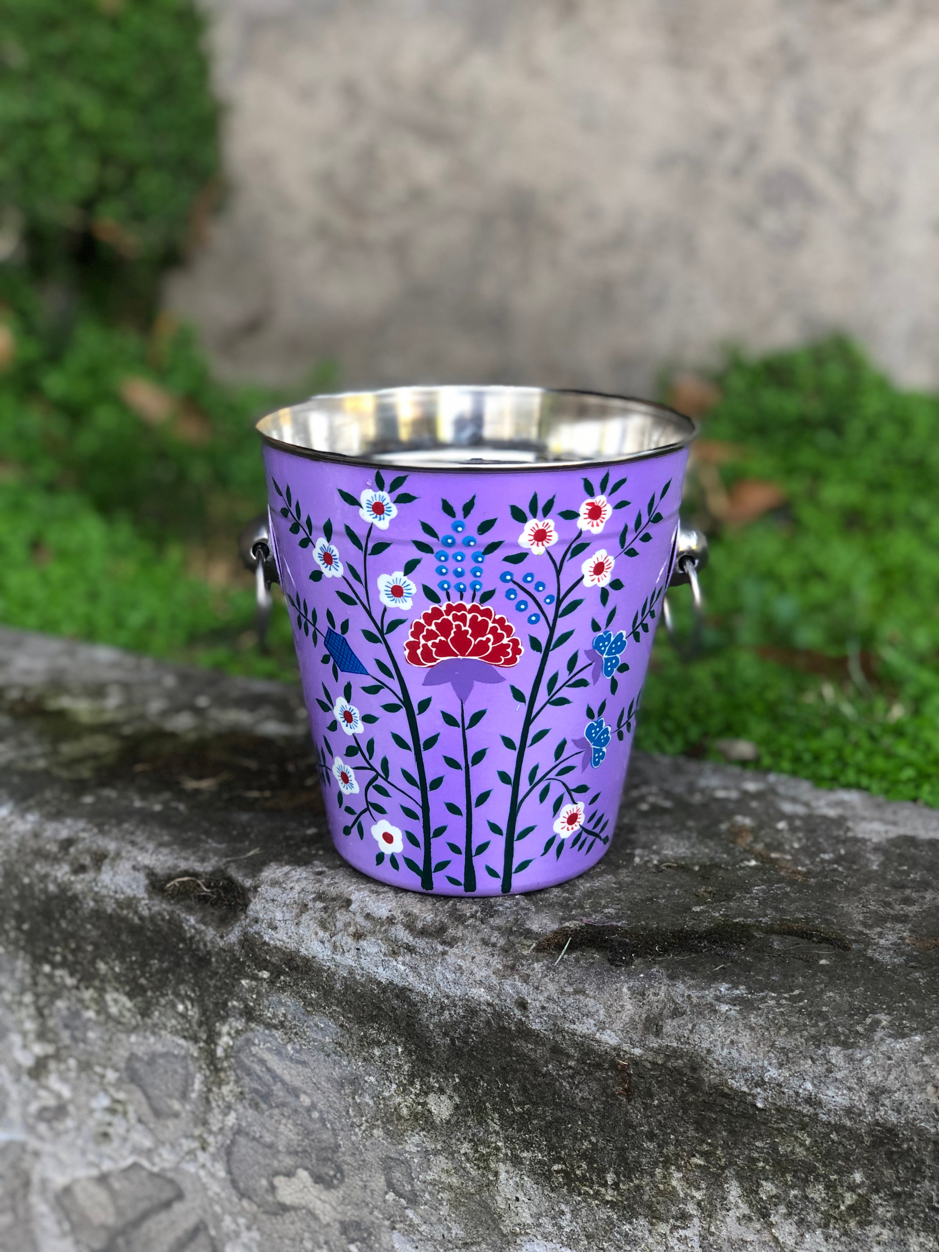 Hieleras de acero inoxidable pintadas a mano alzada con diseños florales en la India. 14 cms de diametro y 14,5 cms de alto. Ideales para llenarlas de hielo y servir en la mesa.
