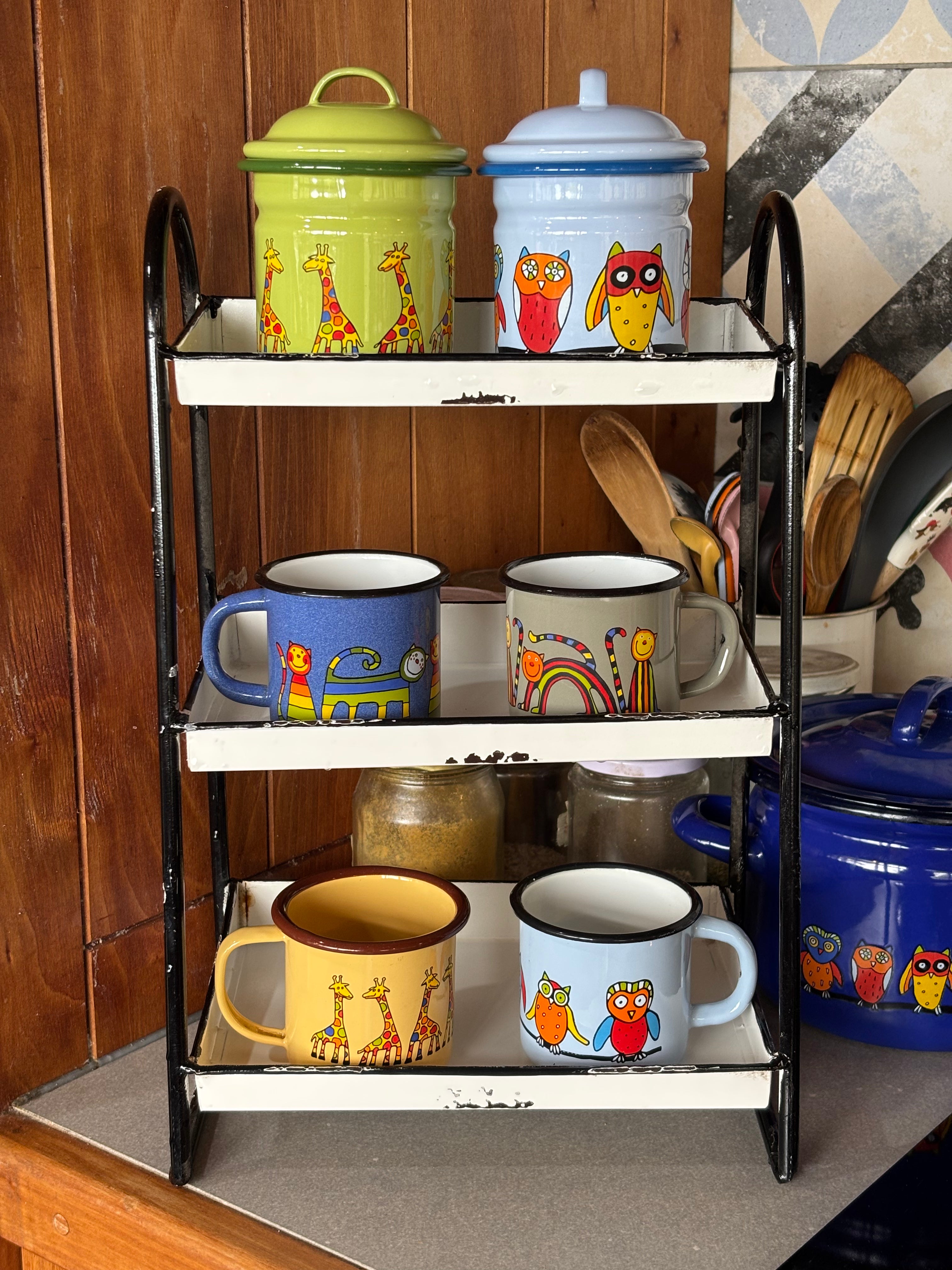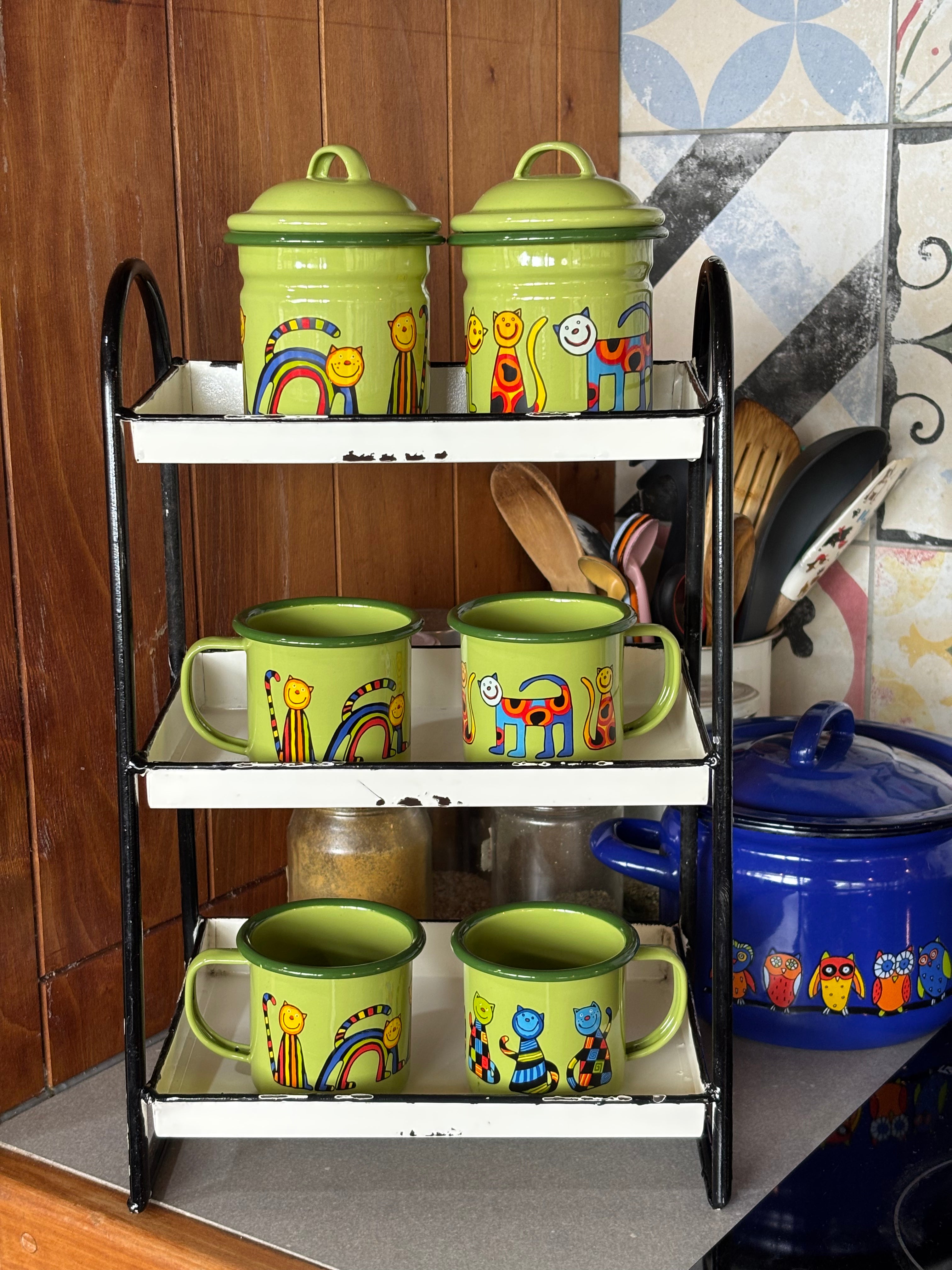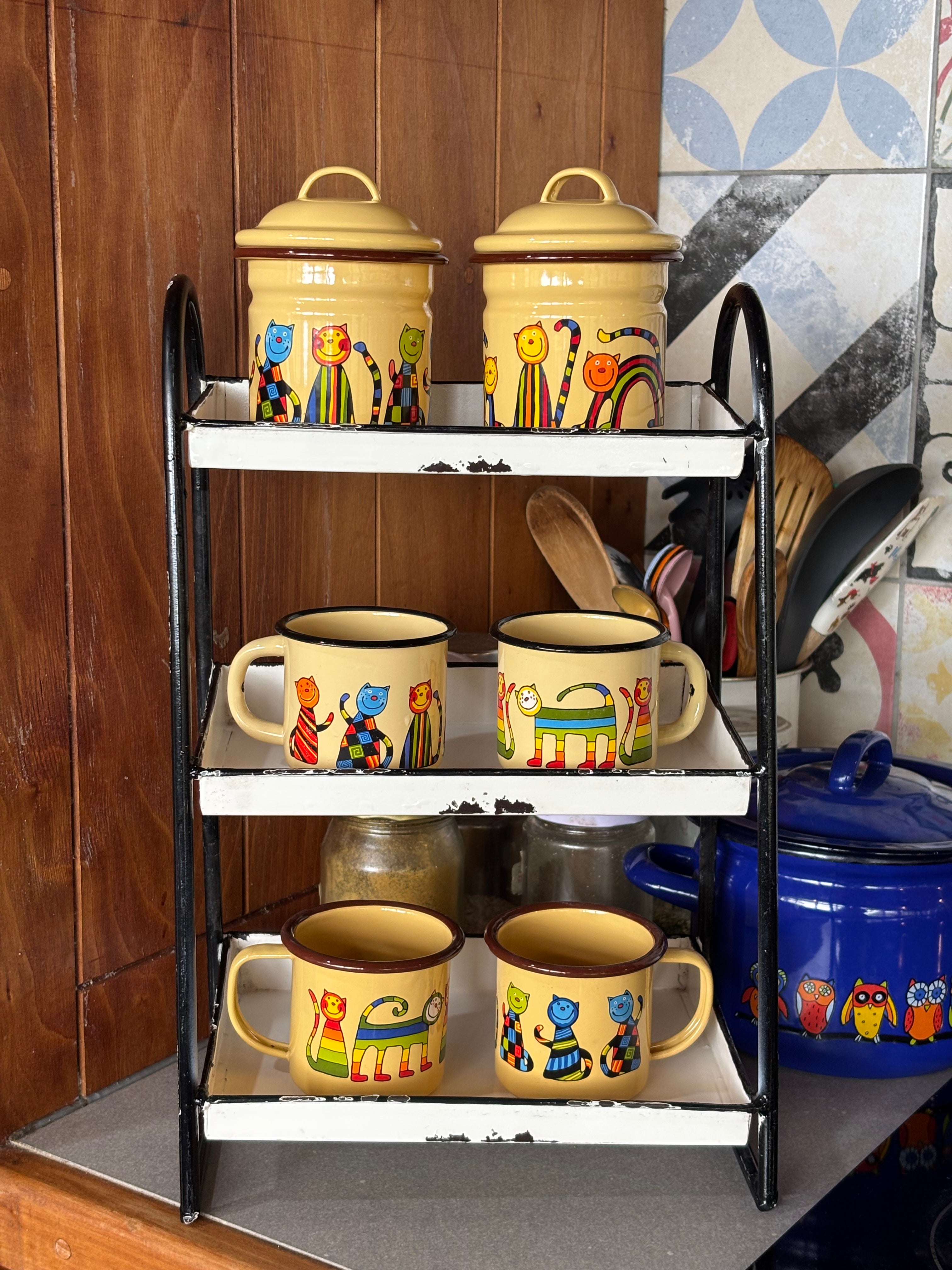 Set 2 azucareros y 4 tazones enlozados con diseño de animales.