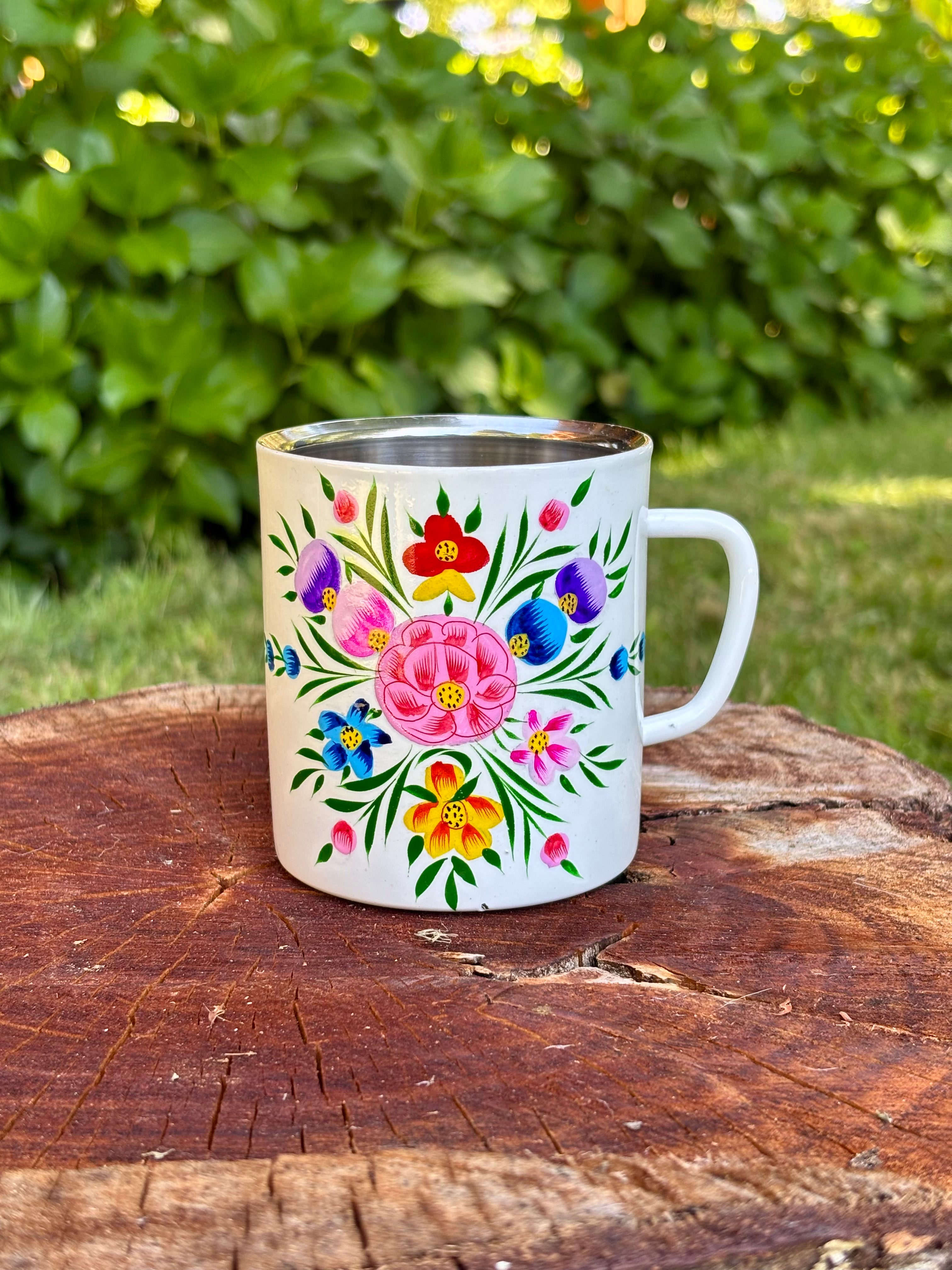 Tazones de doble acero inoxidable pintados a mano alzada y esmaltados por artesanos en la India.