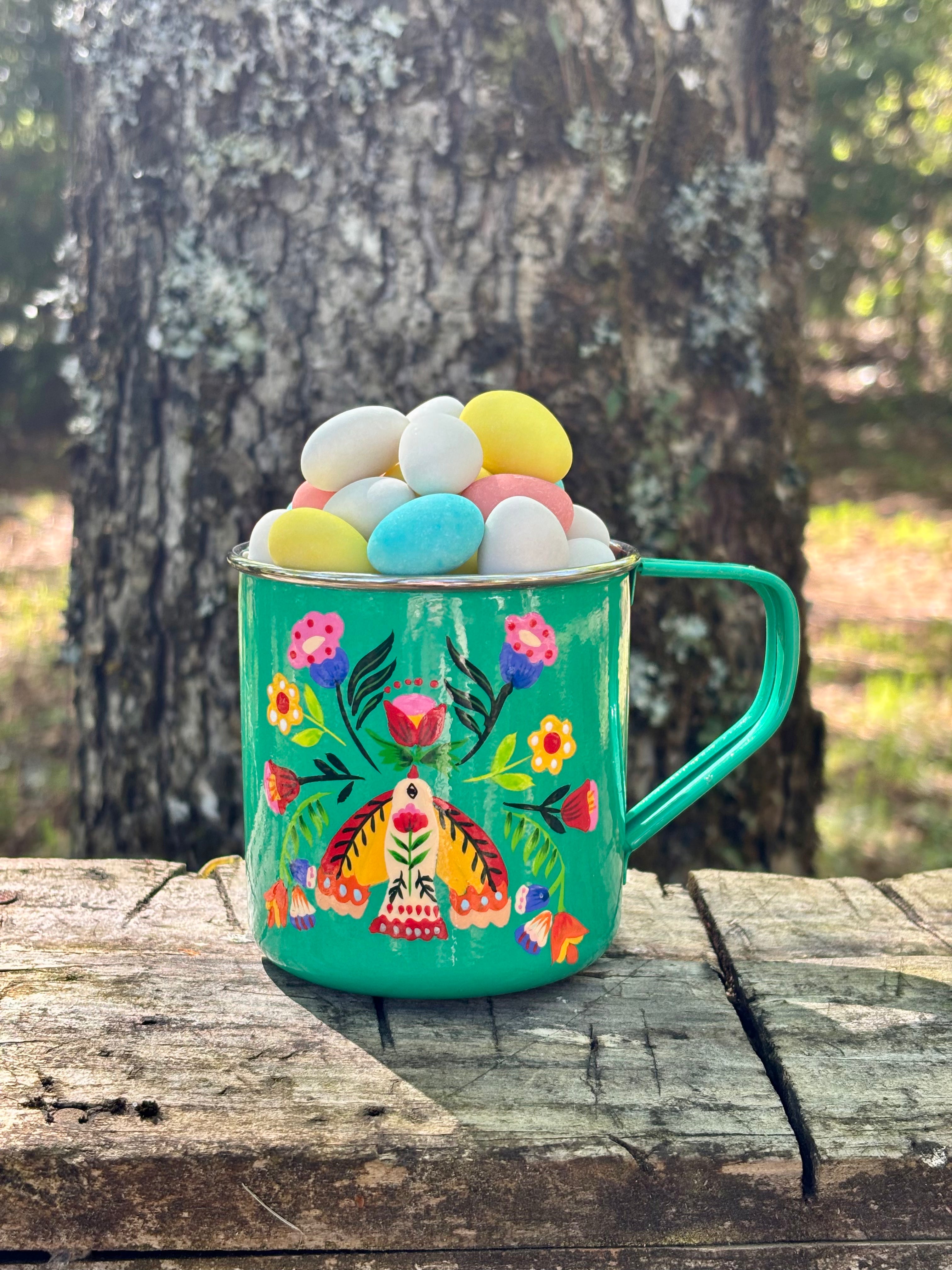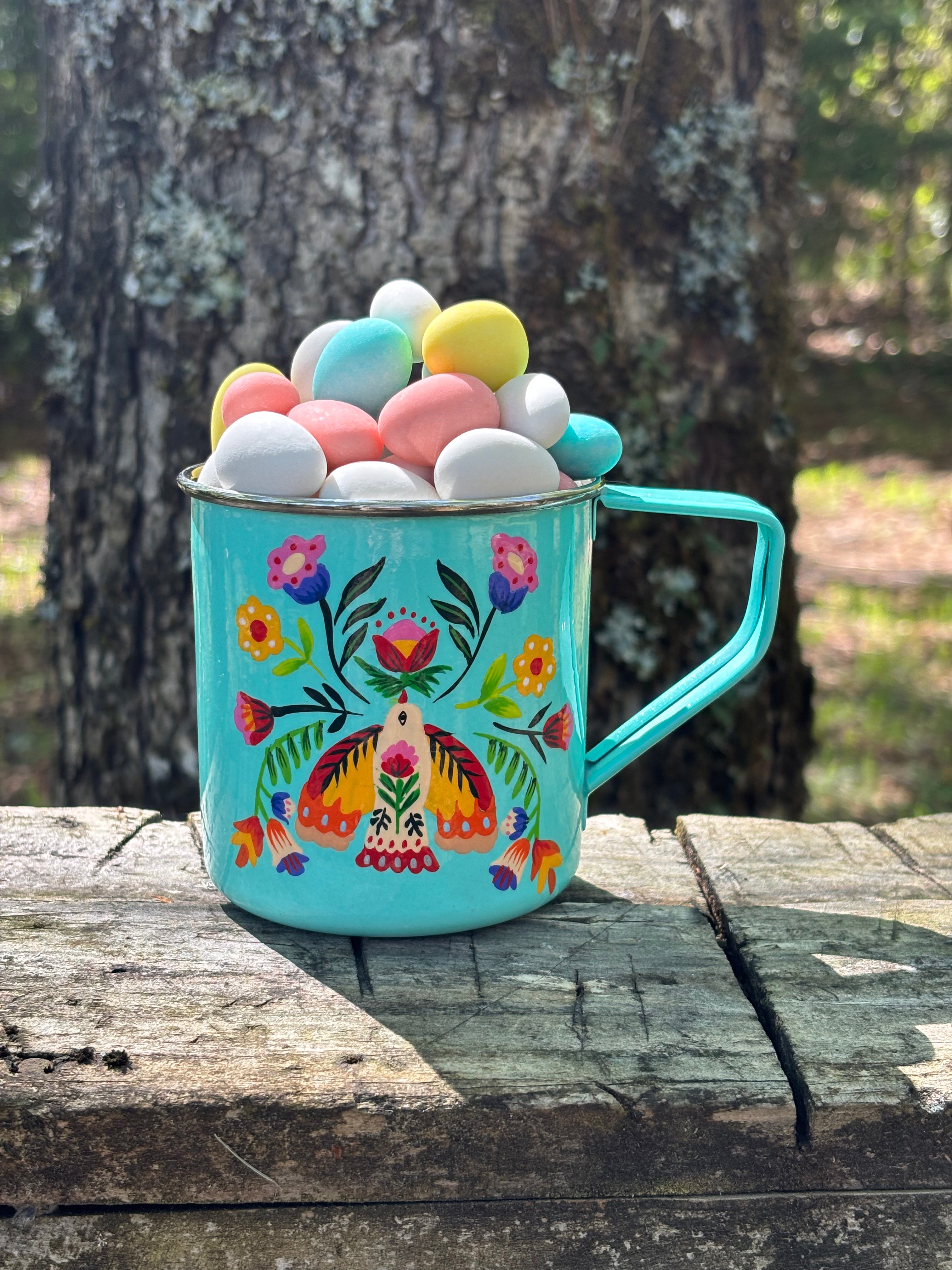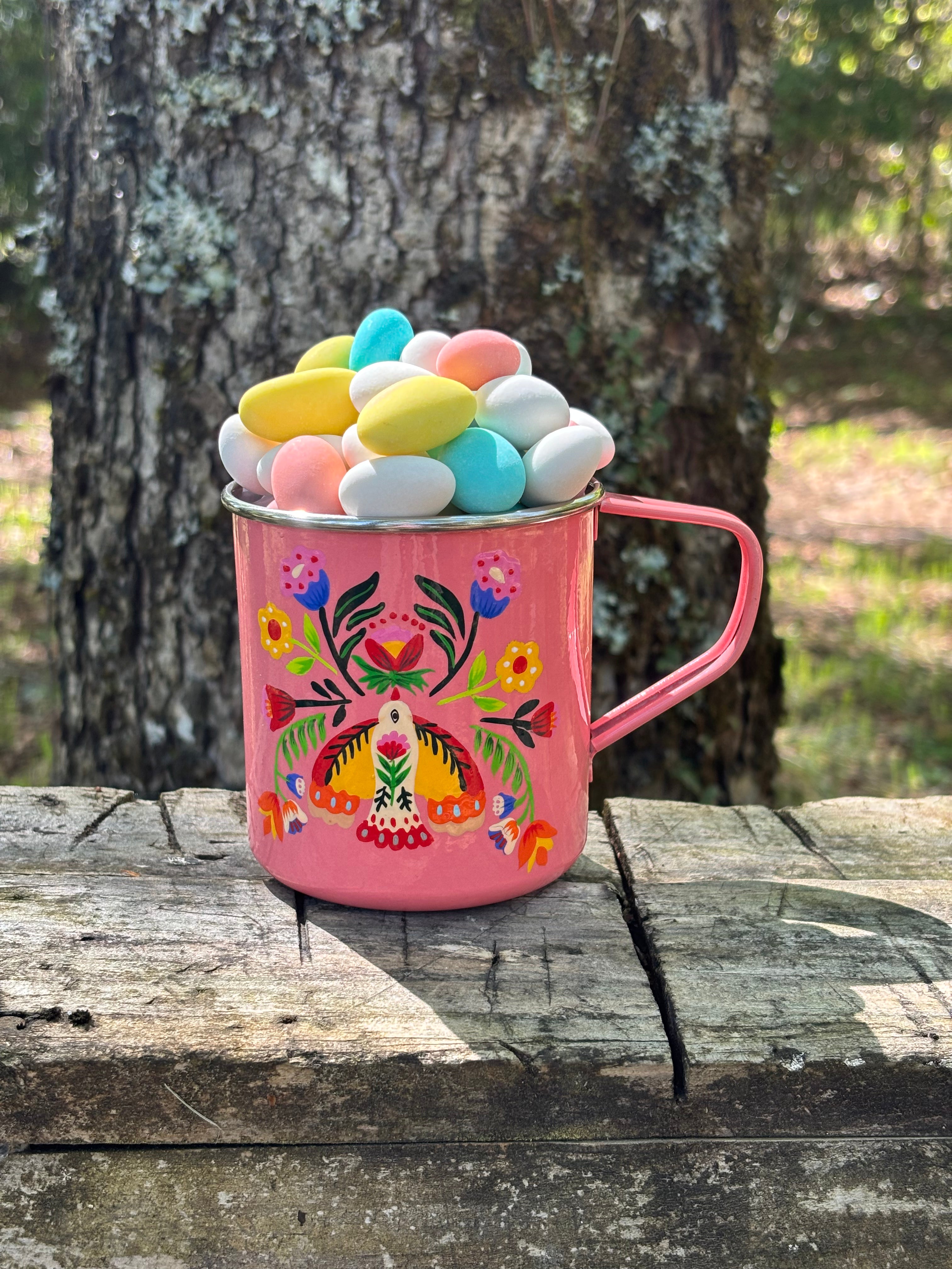 Tazones de acero inoxidable pintados y esmaltados por artesanos en la India , uno a uno, replicando la maravillosa ilustración de la artista nacional Pepa Espinoza.