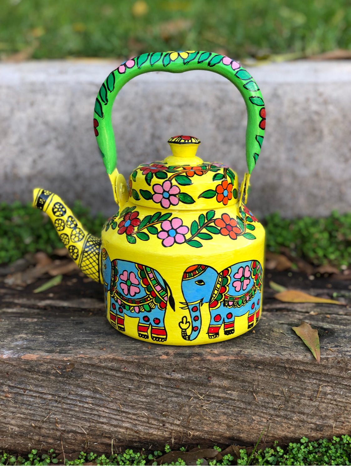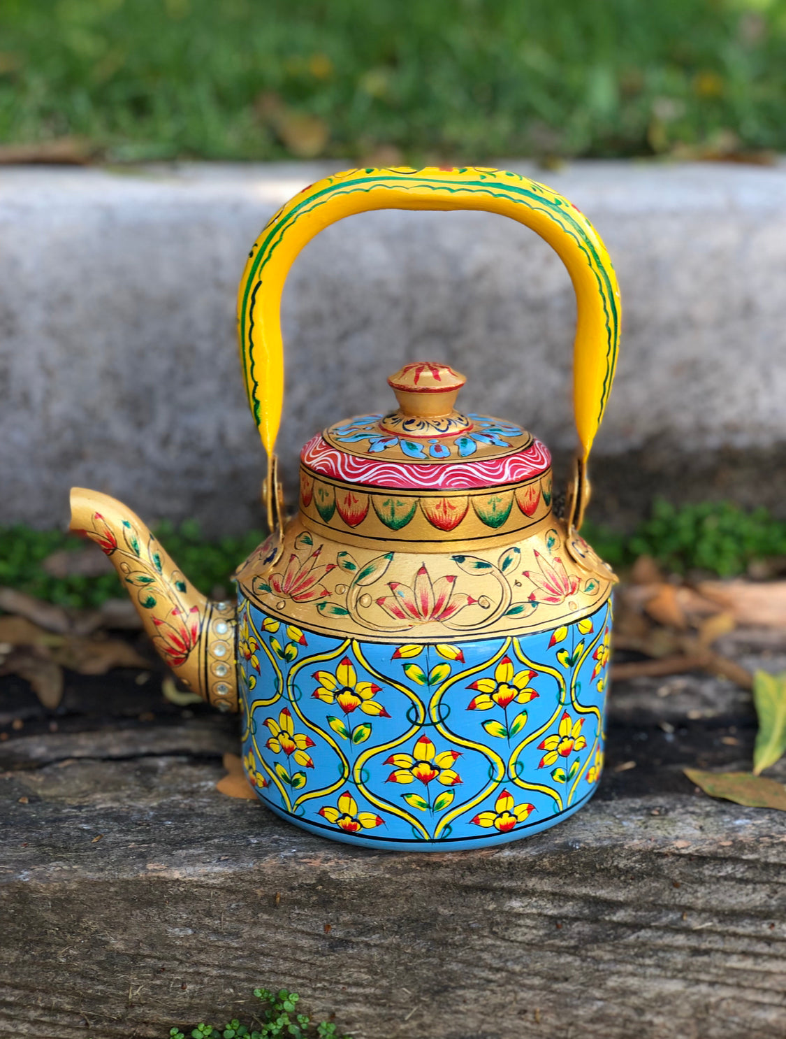 Tetera de acero inoxidable pintada a mano alzada con delicados detalles por artesanos en la India.