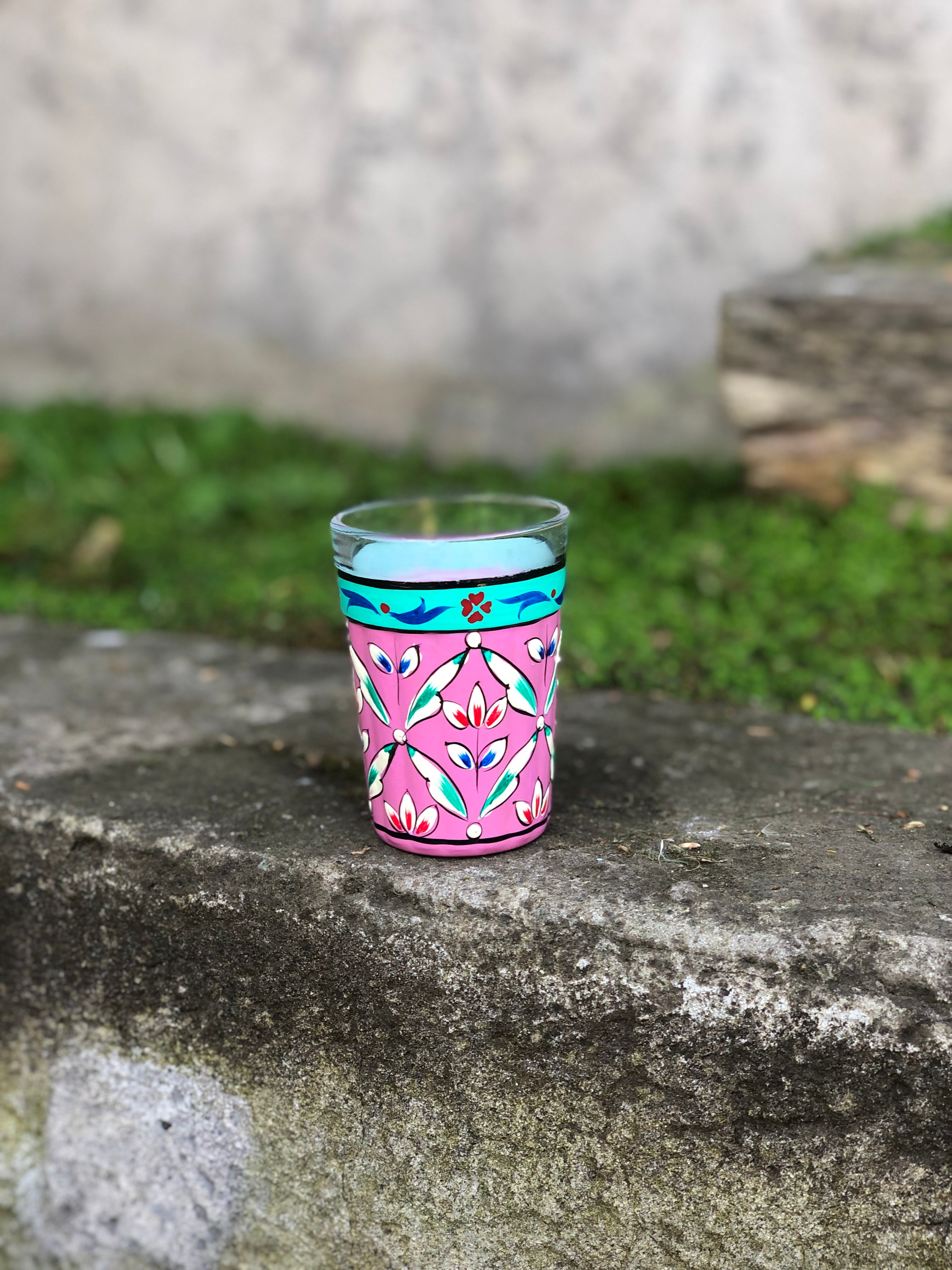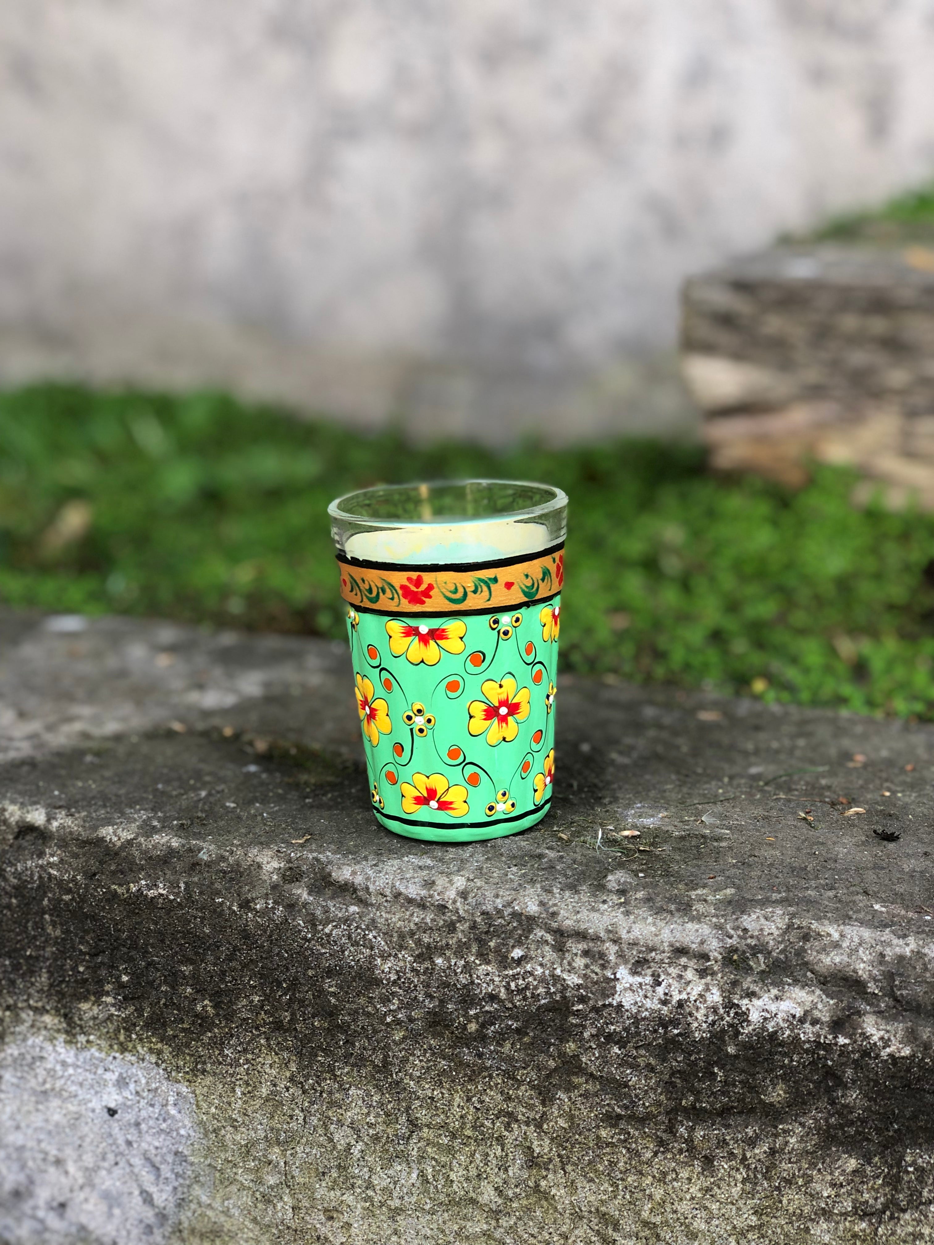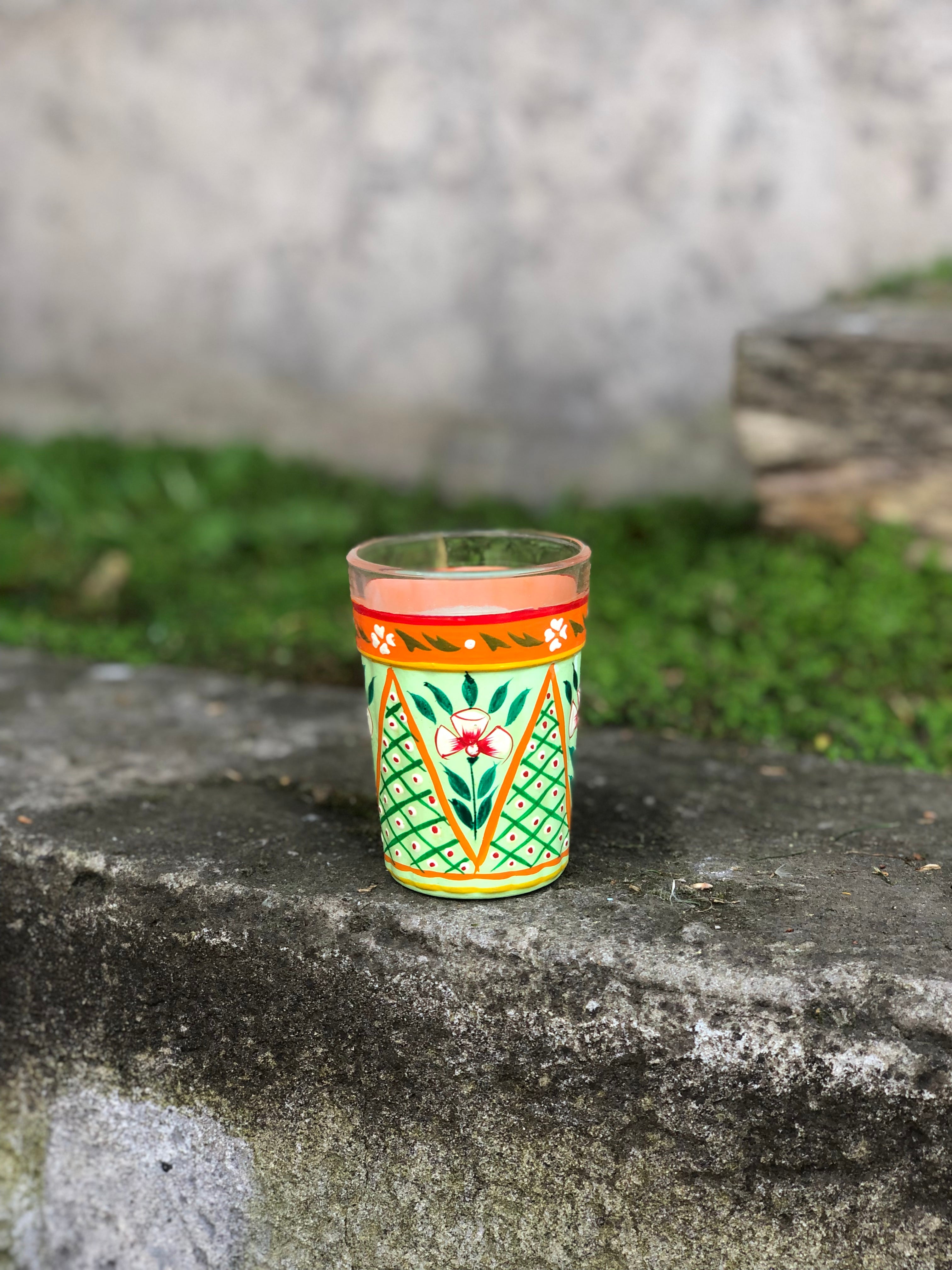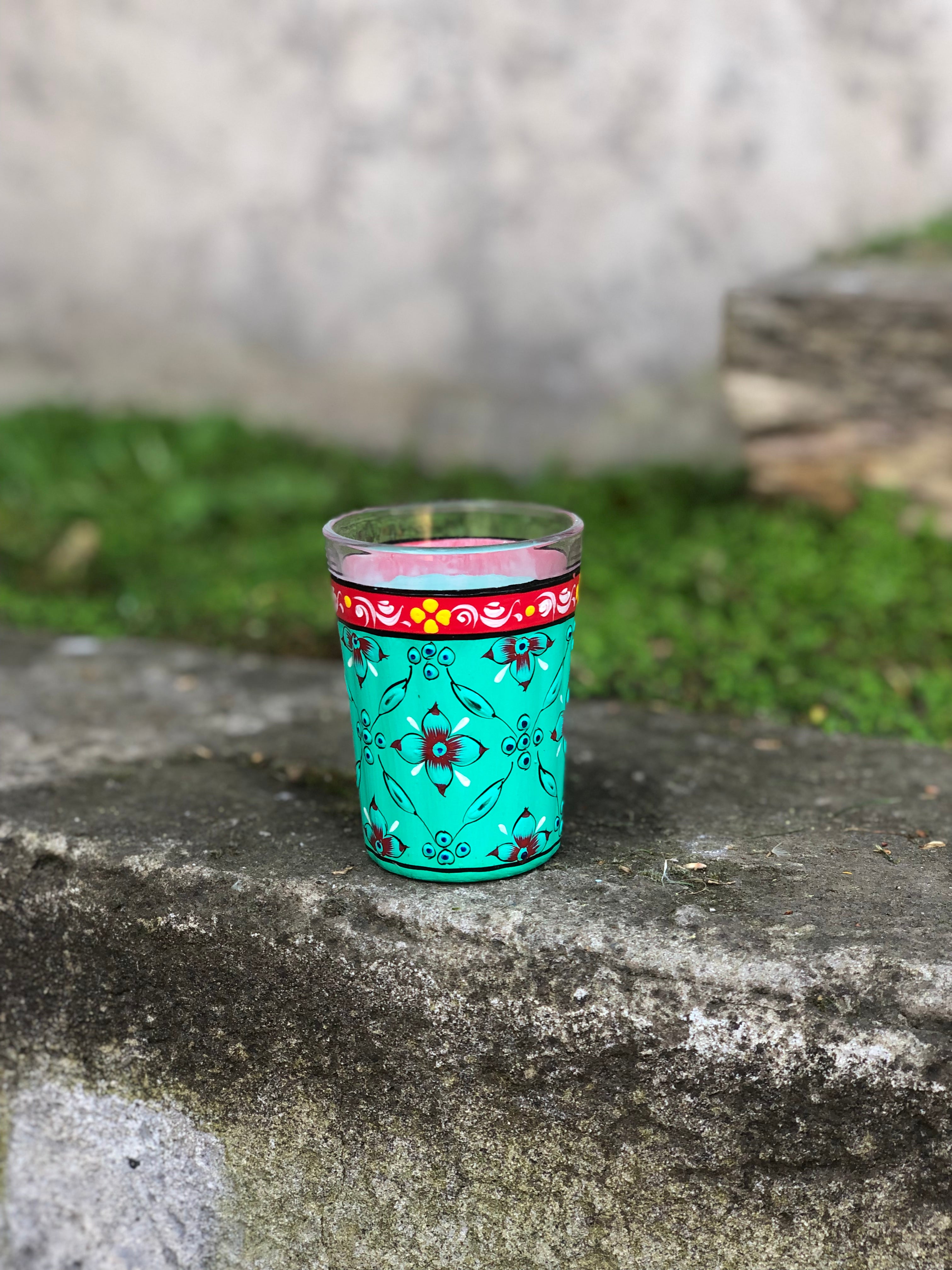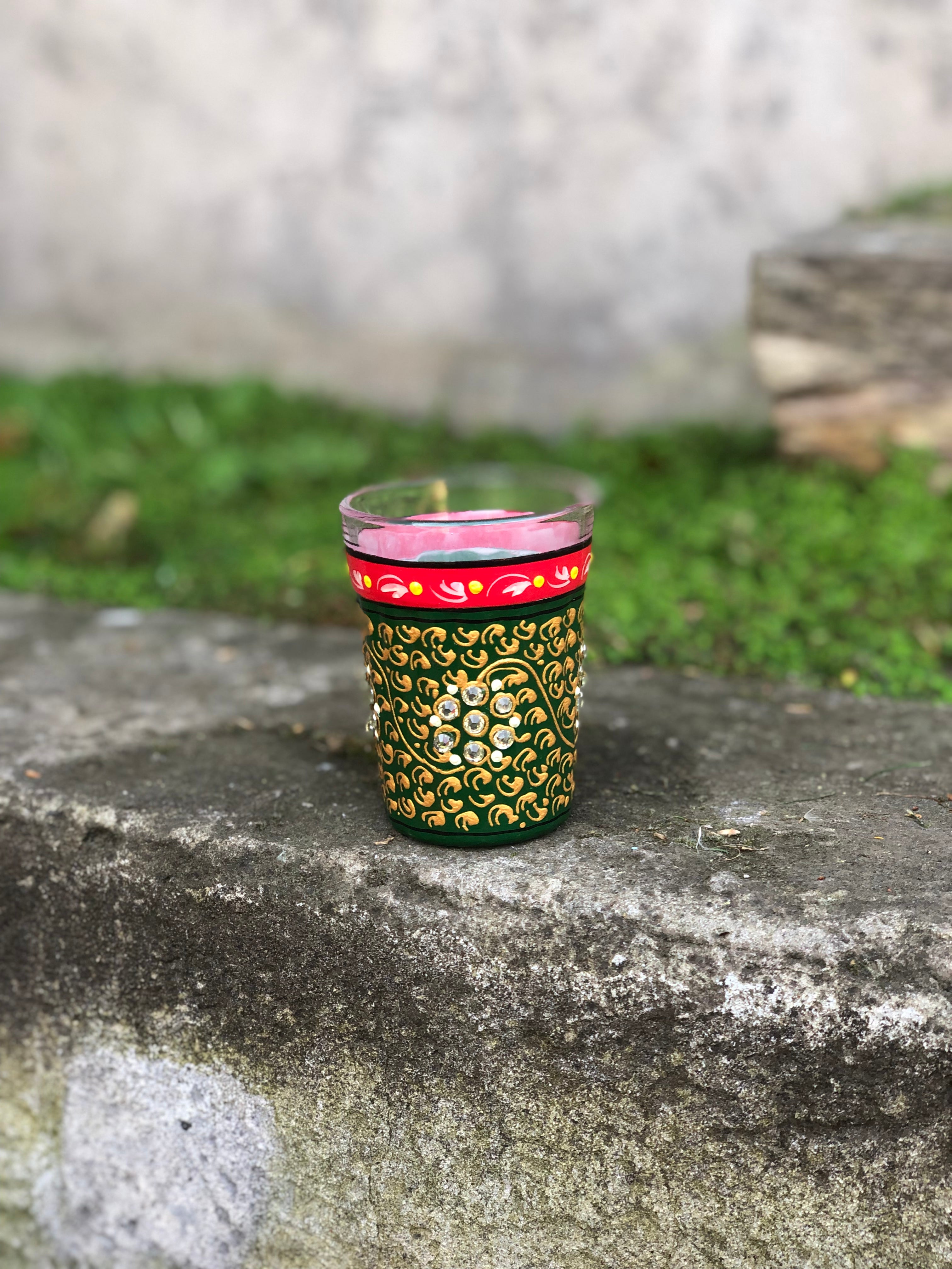 Vasitos de vidrio pintados a mano y esmaltados por artesanos en la India.