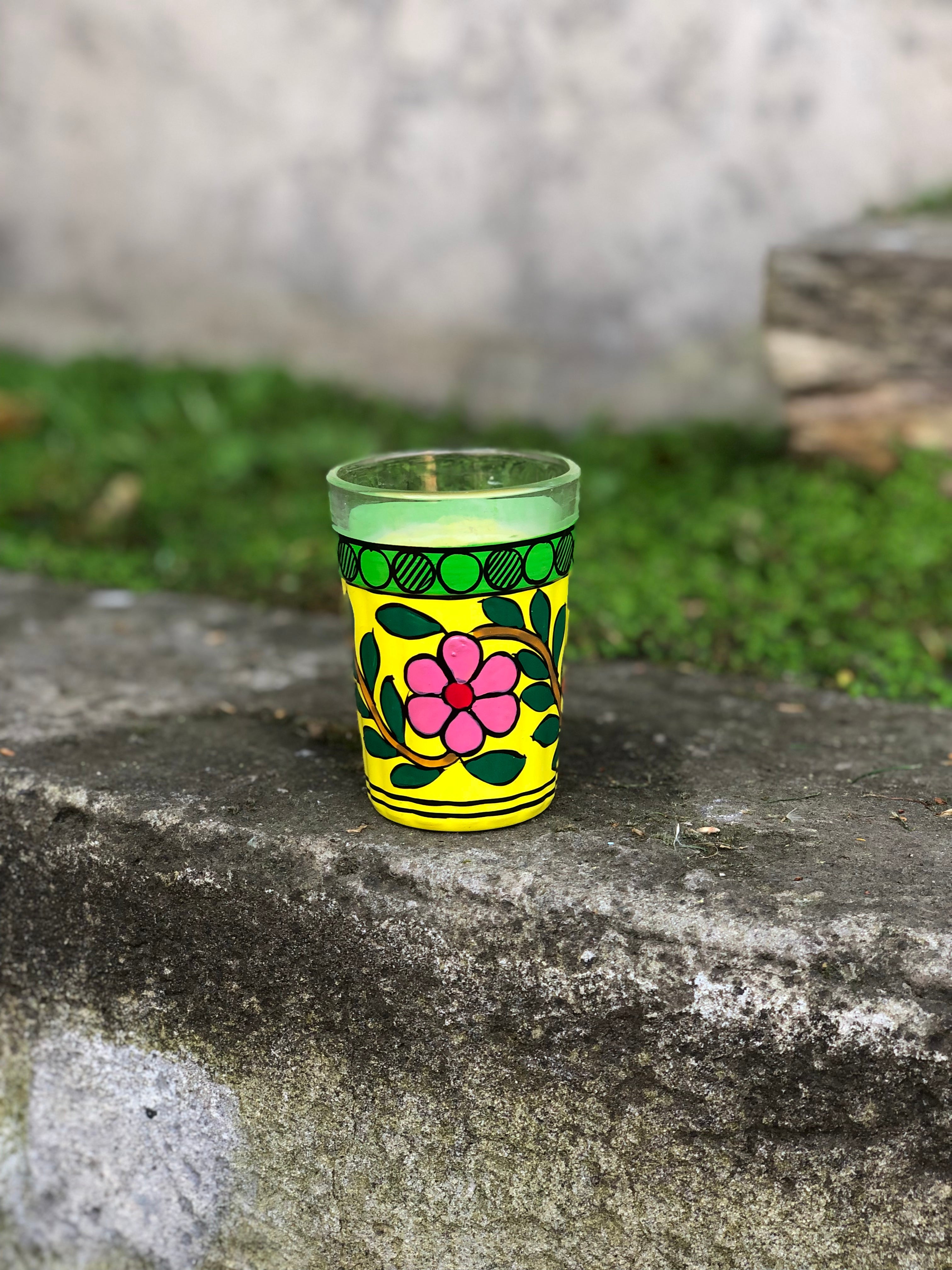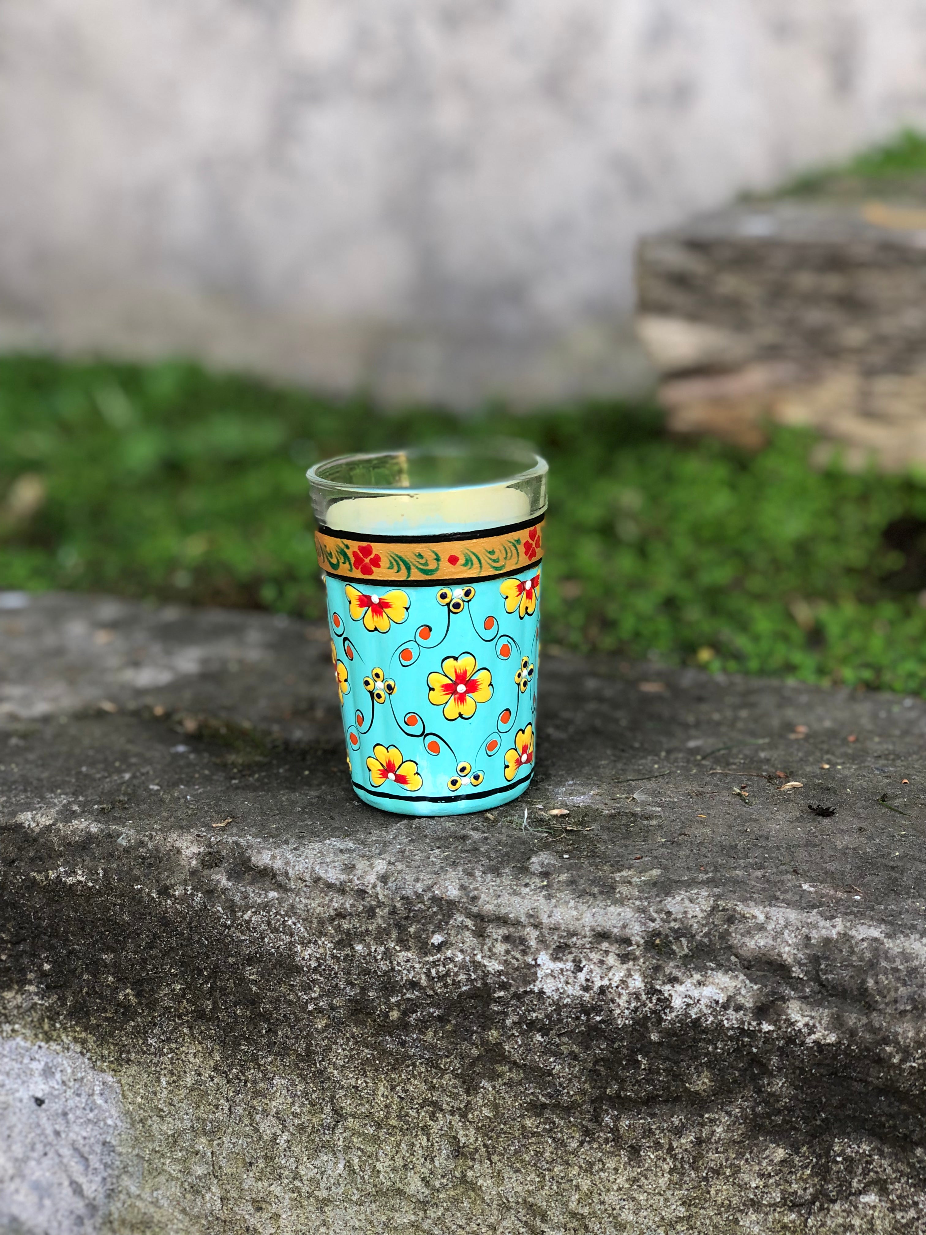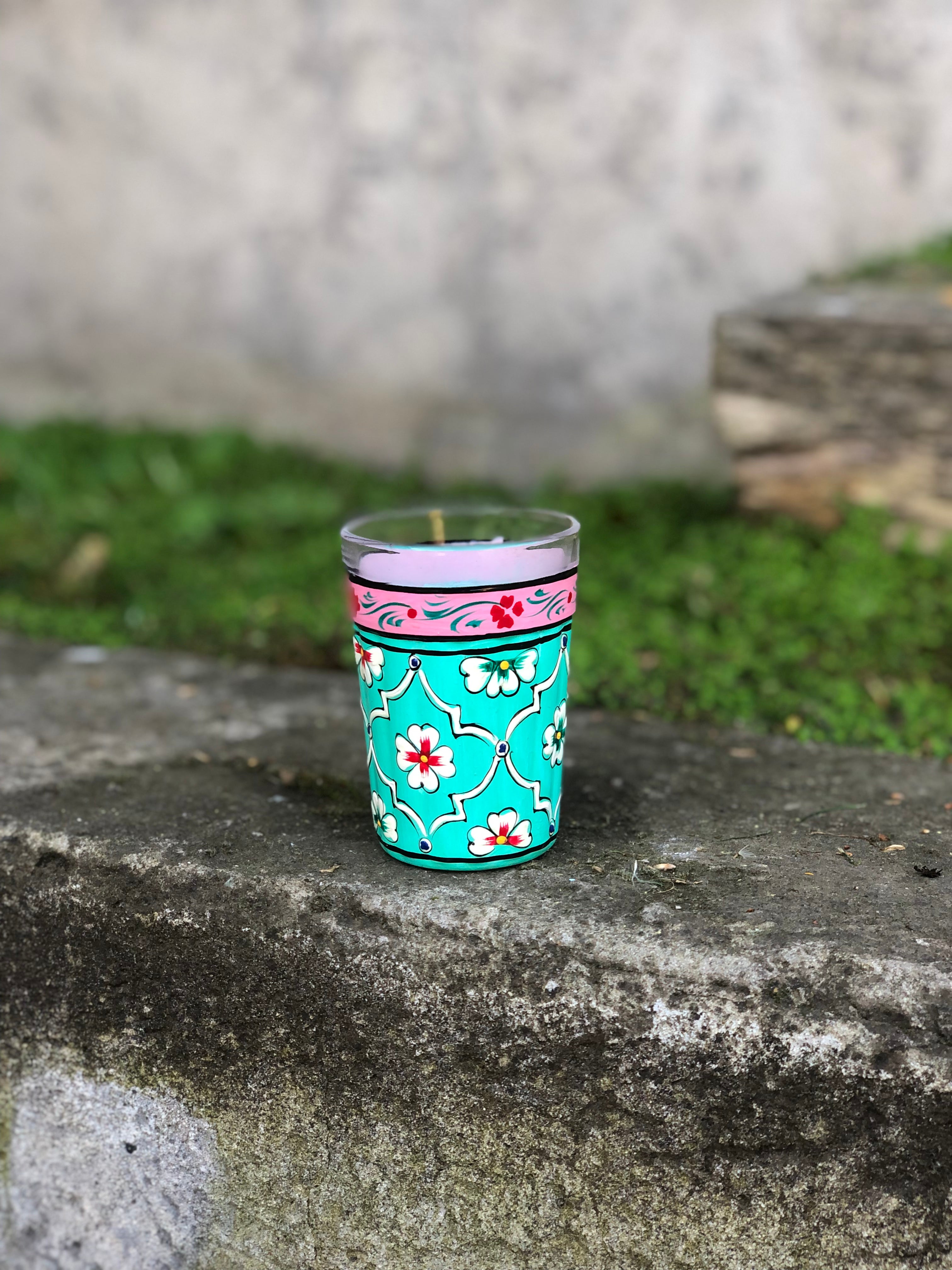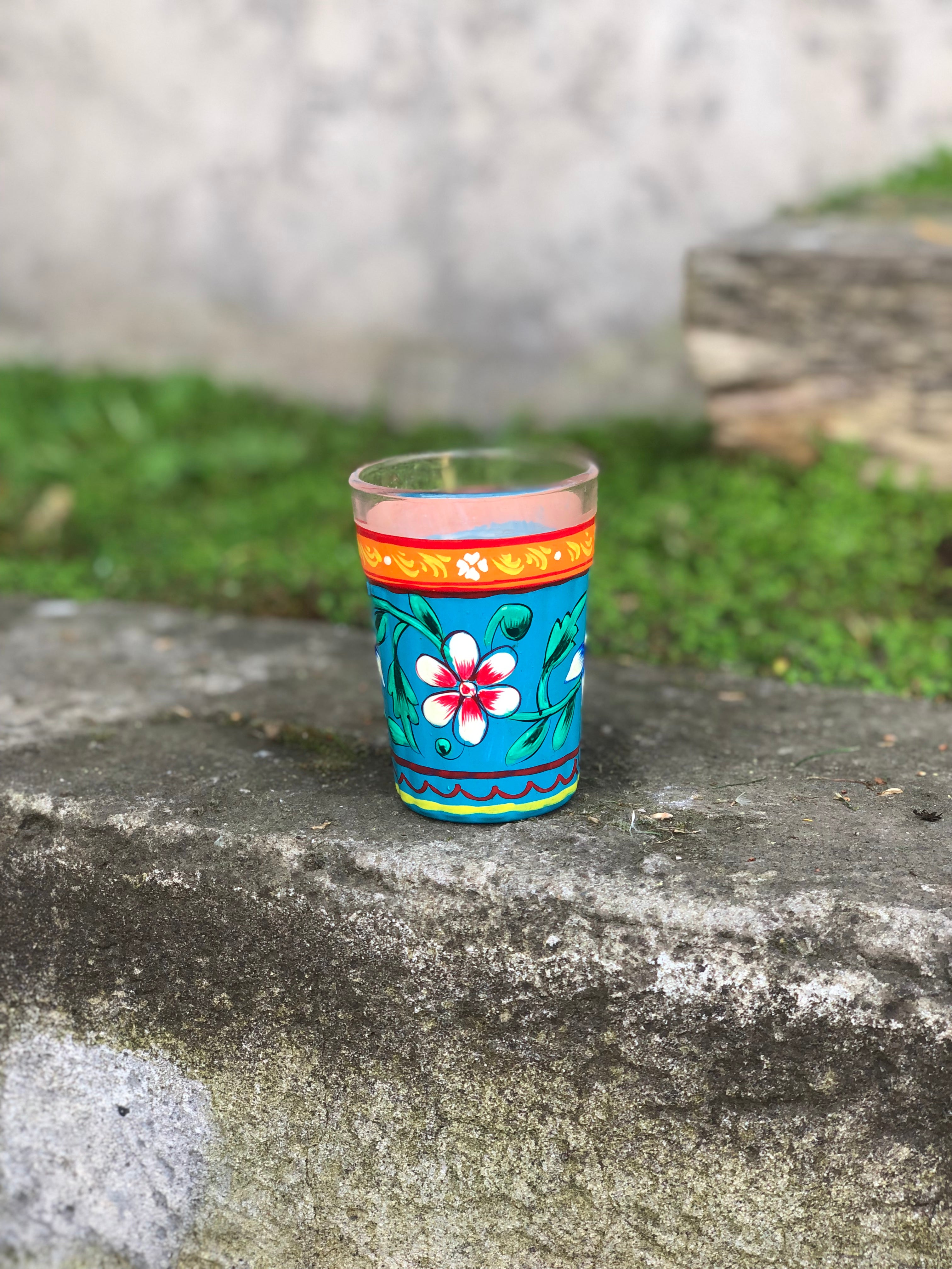 Vasitos de vidrio pintados a mano y esmaltados por artesanos en la India.