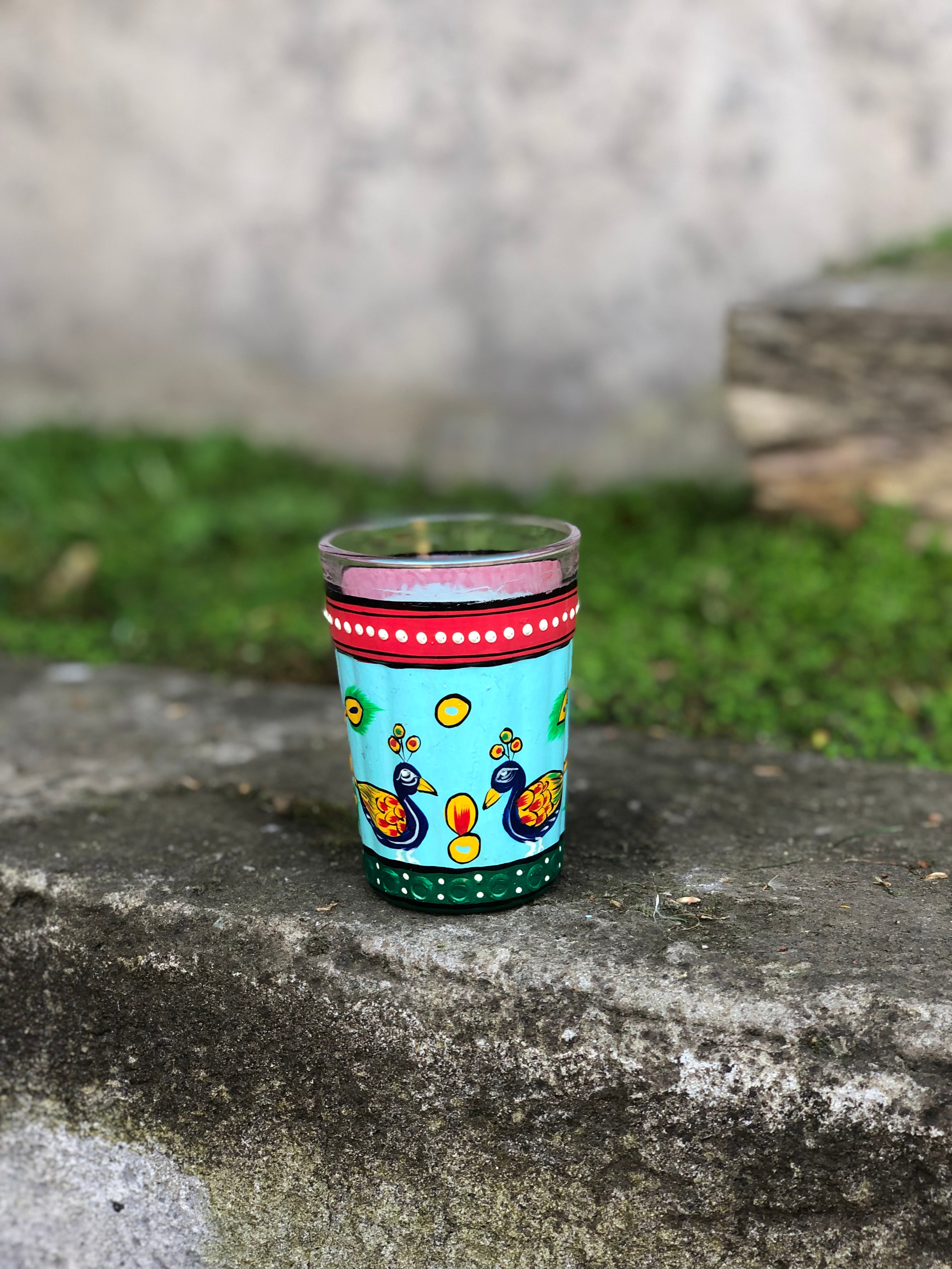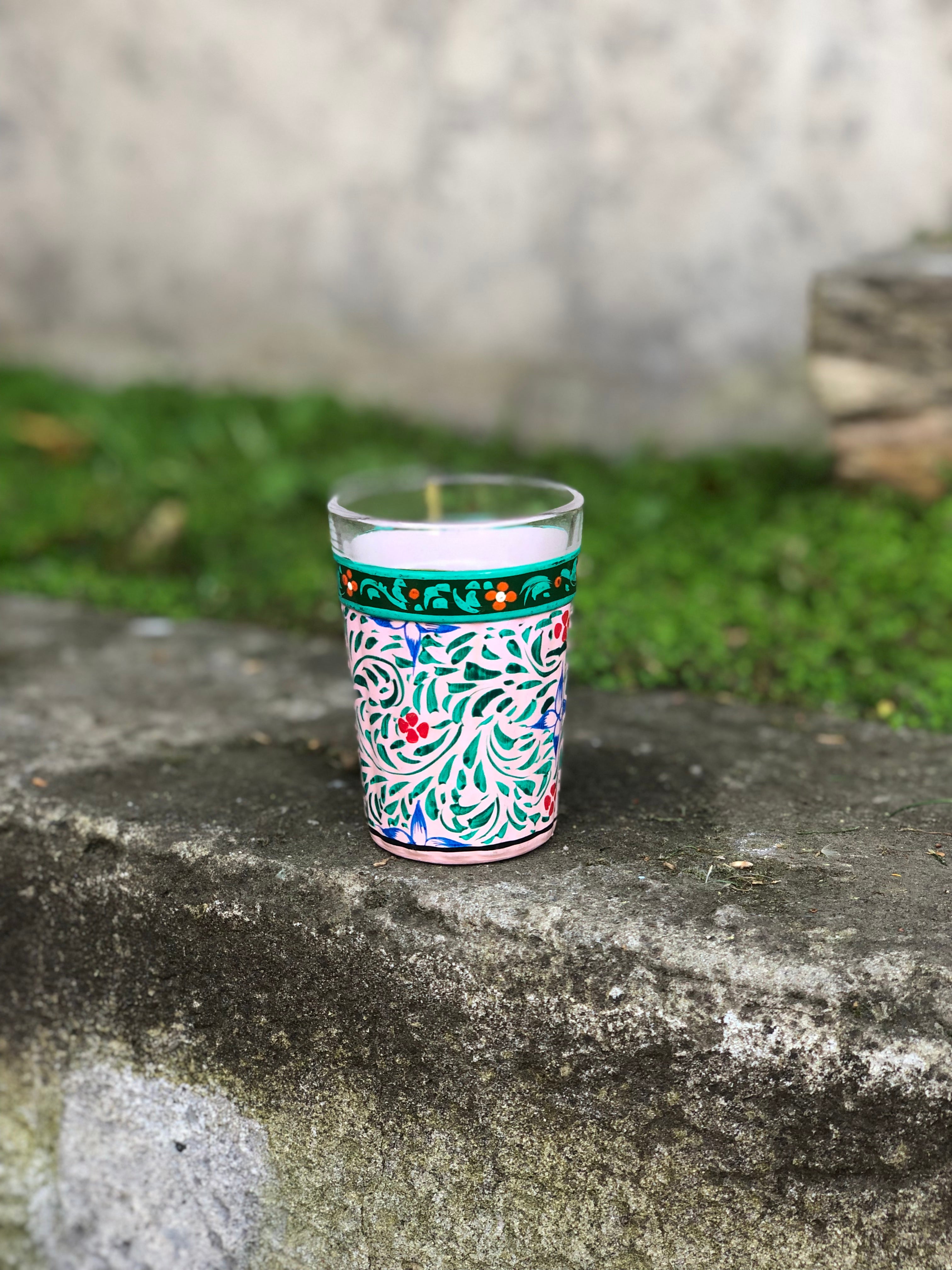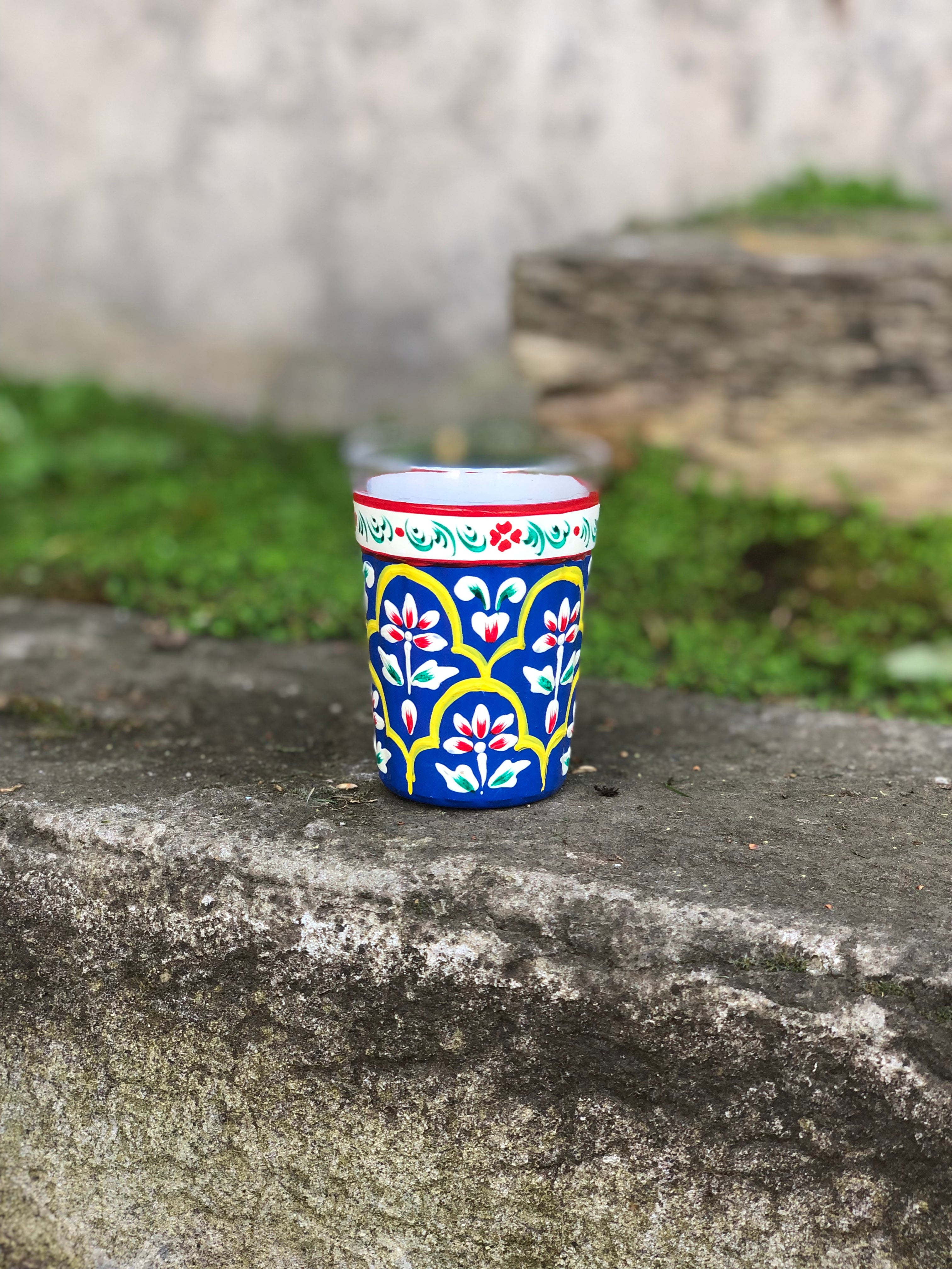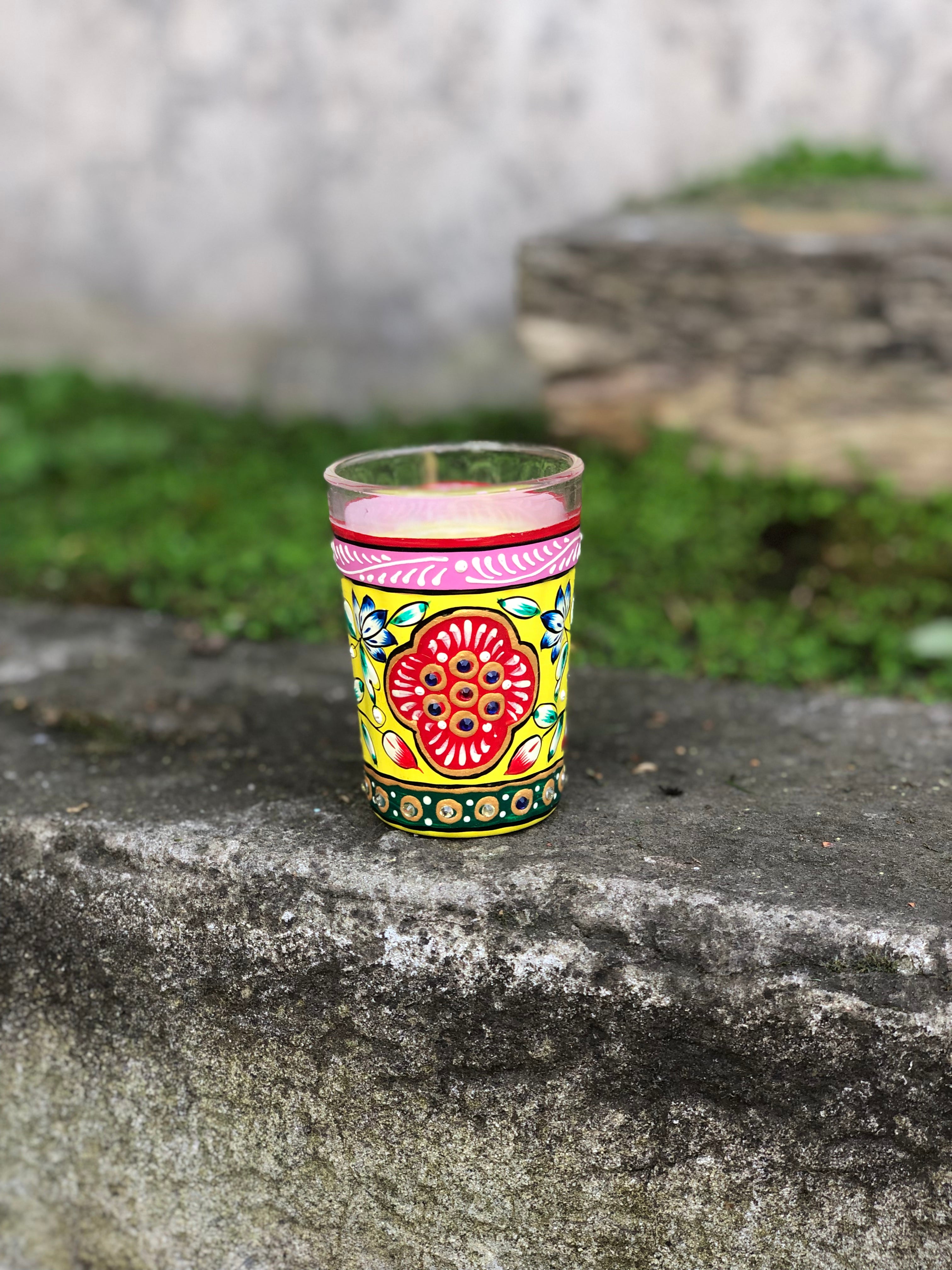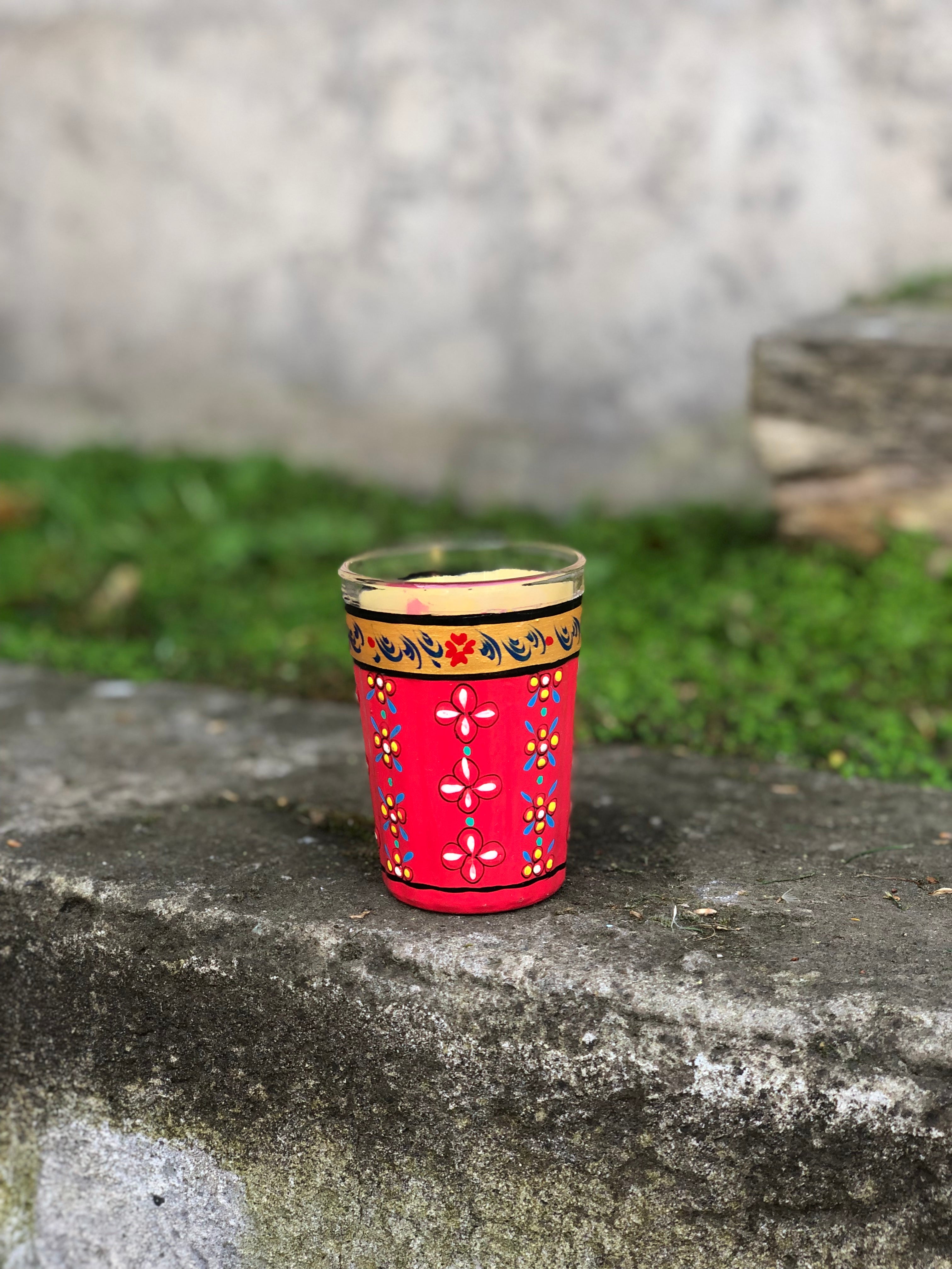 Vasitos de vidrio pintados a mano y esmaltados por artesanos en la India.