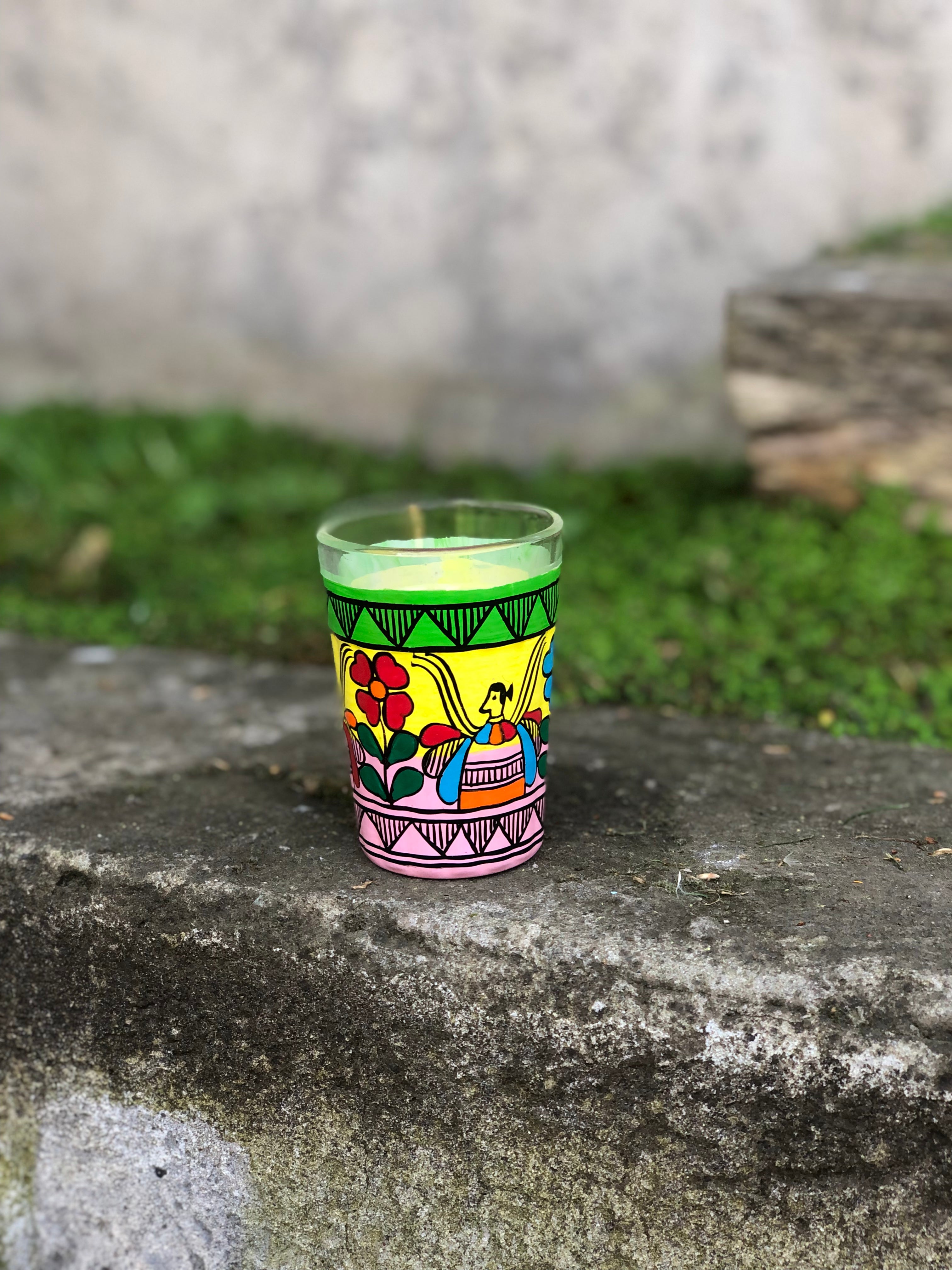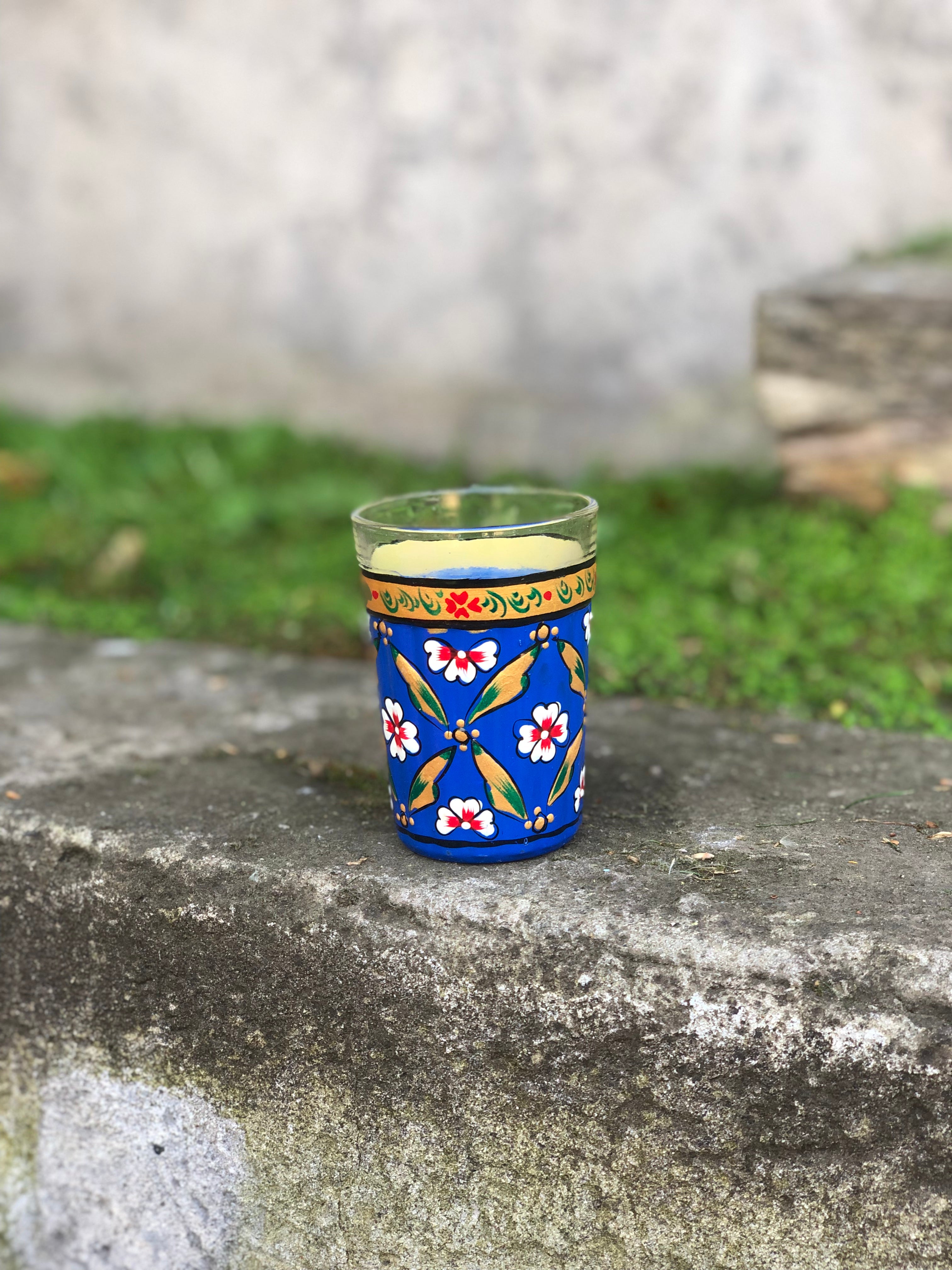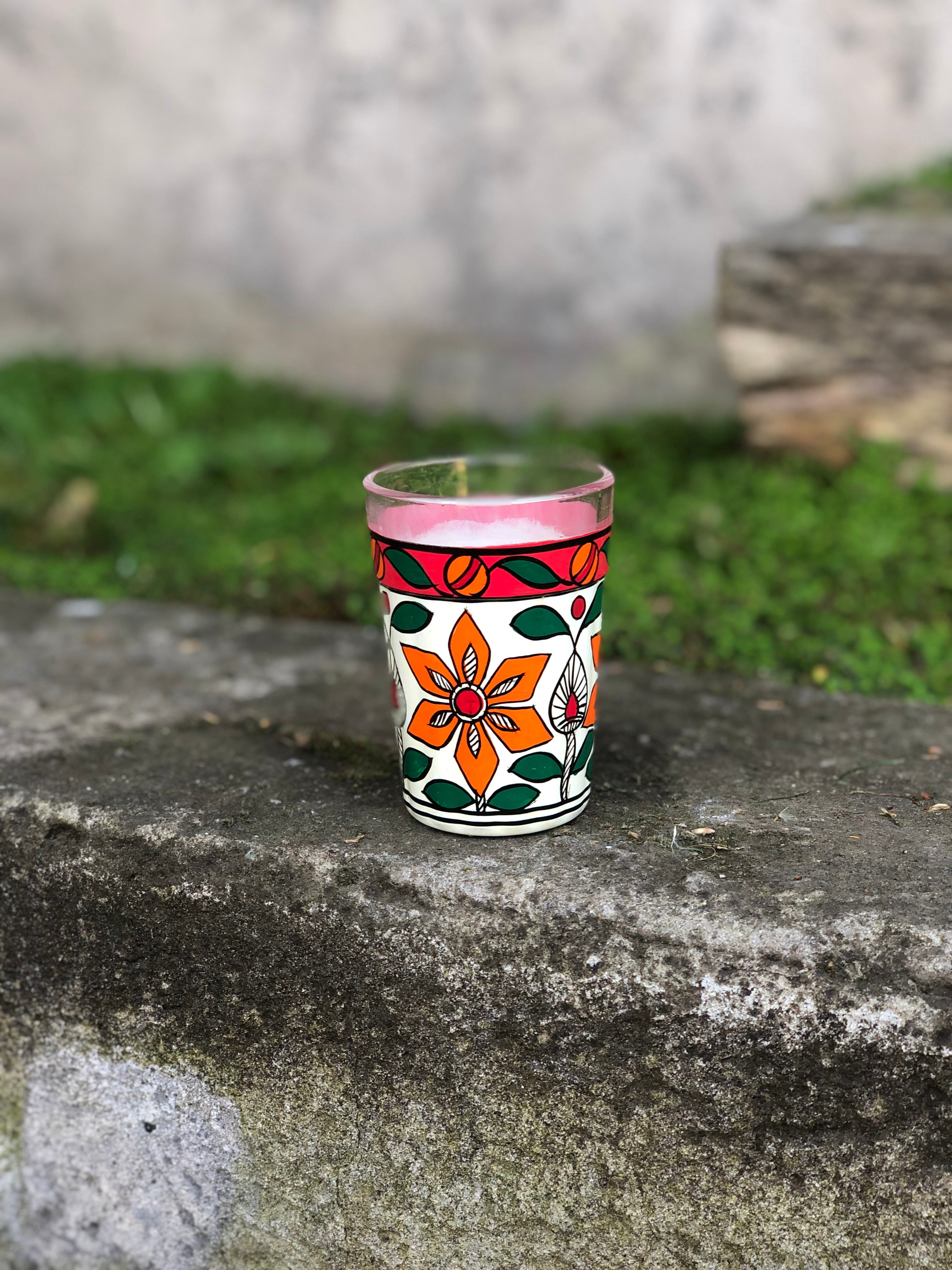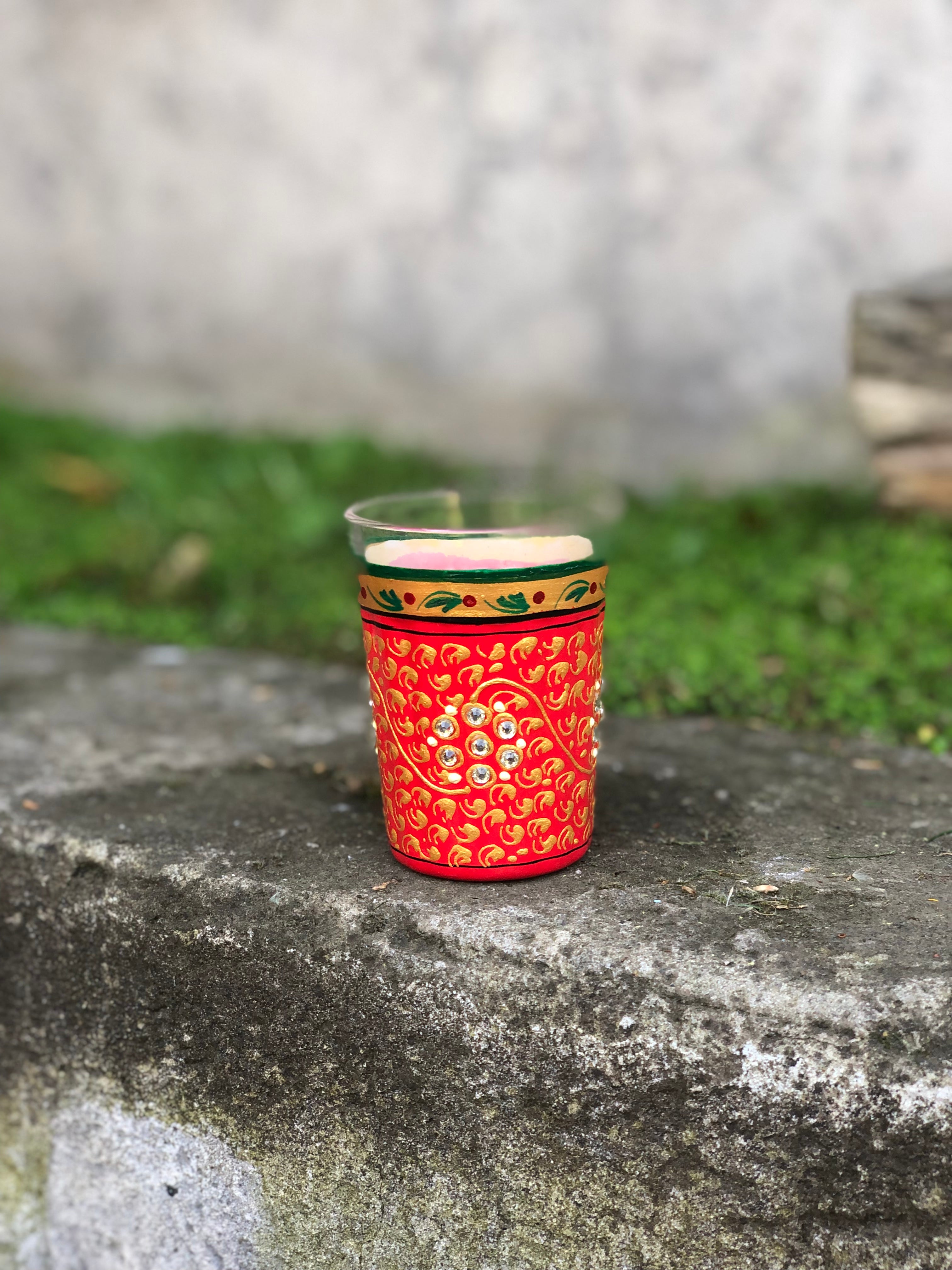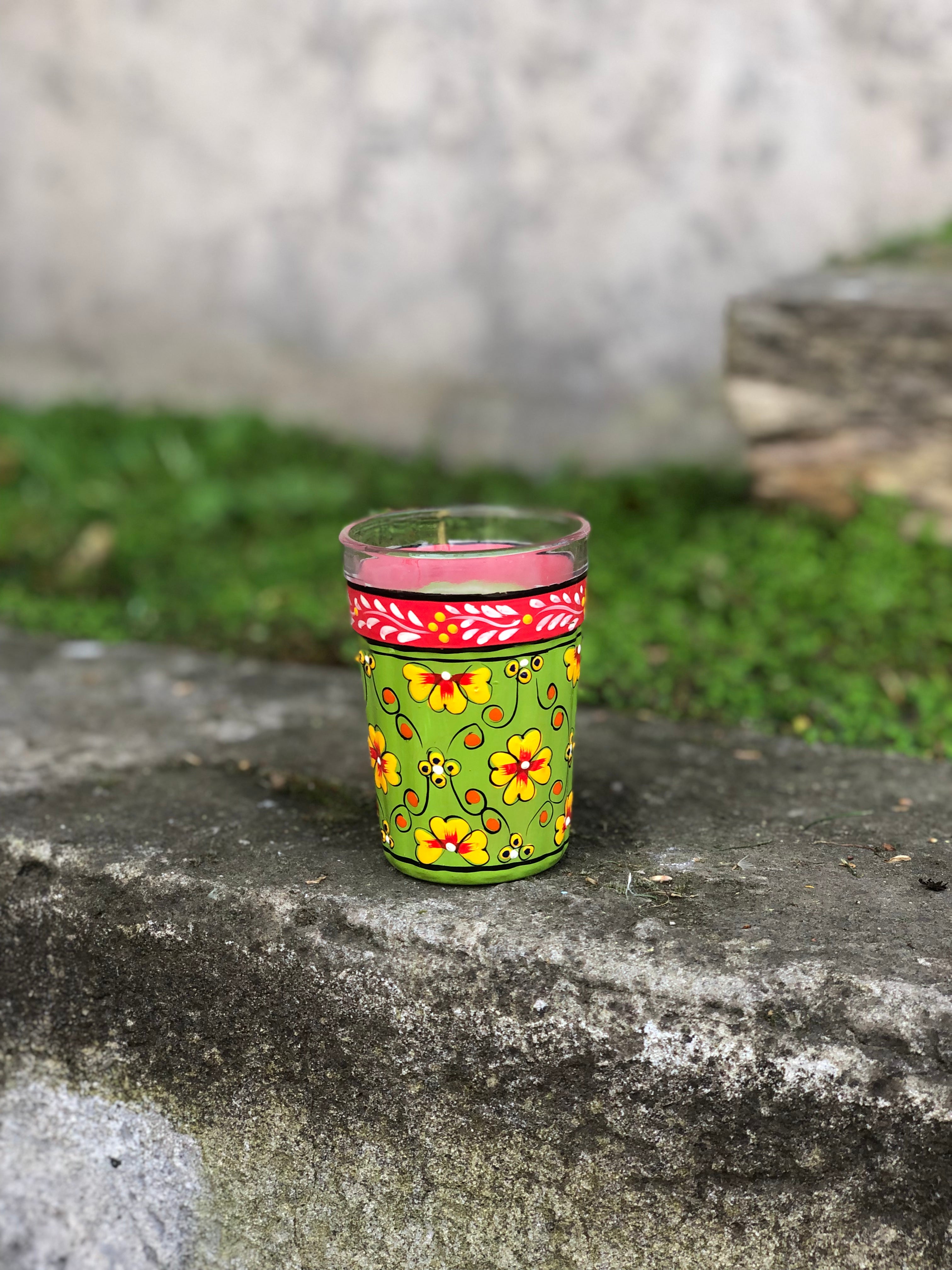 Vasitos de vidrio pintados a mano y esmaltados por artesanos en la India.
