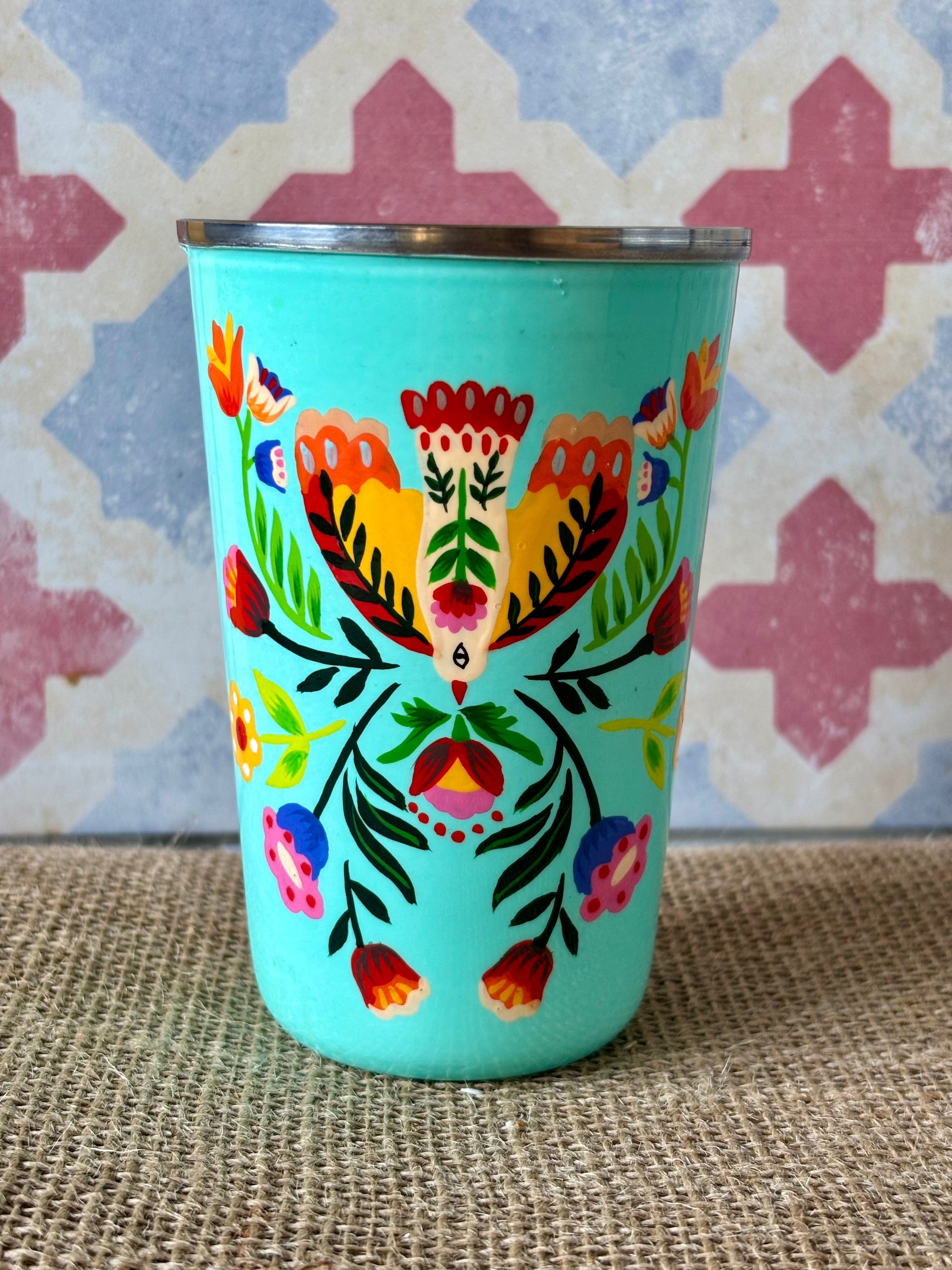 Vasos de acero inoxidable pintados a mano alzada por artesanos en la India, replicando una maravillosa ilustración de la artista Pepa Espinoza.