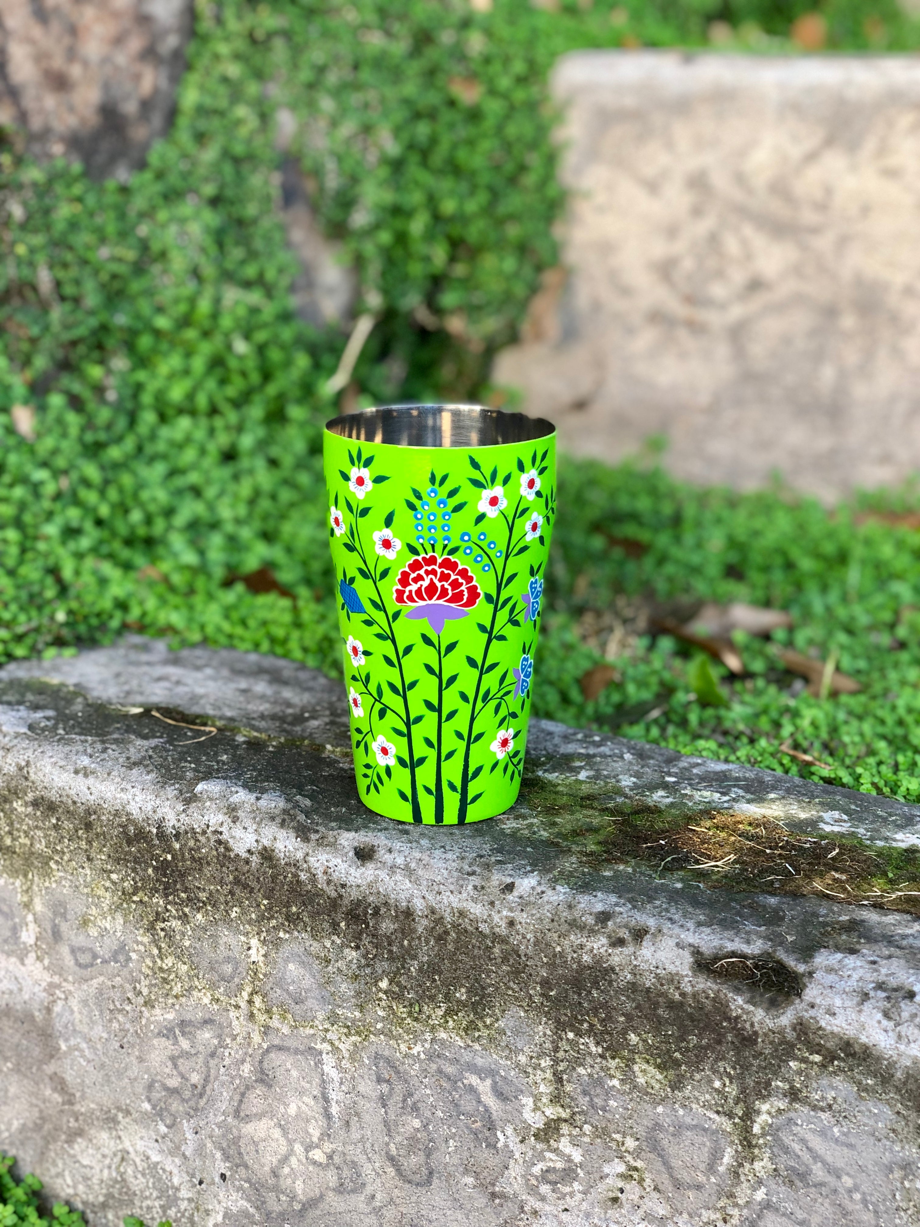 Vasos XL de acero inoxidable pintados a mano alzada y esmaltados por artesanas en la India.
