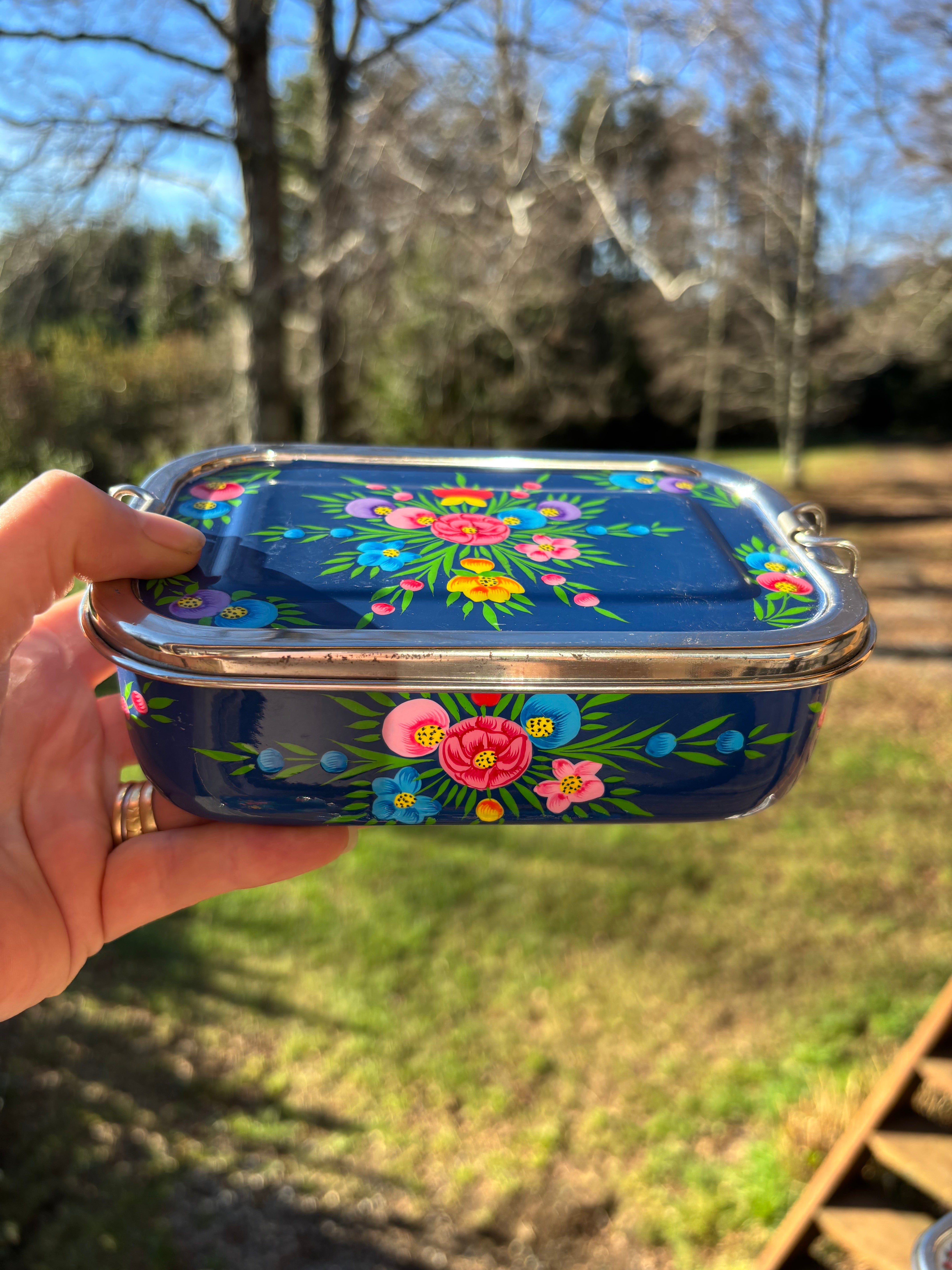 Viandas 1 nivel de acero inoxidable pintadas y esmaltadas por artesanos en la India.