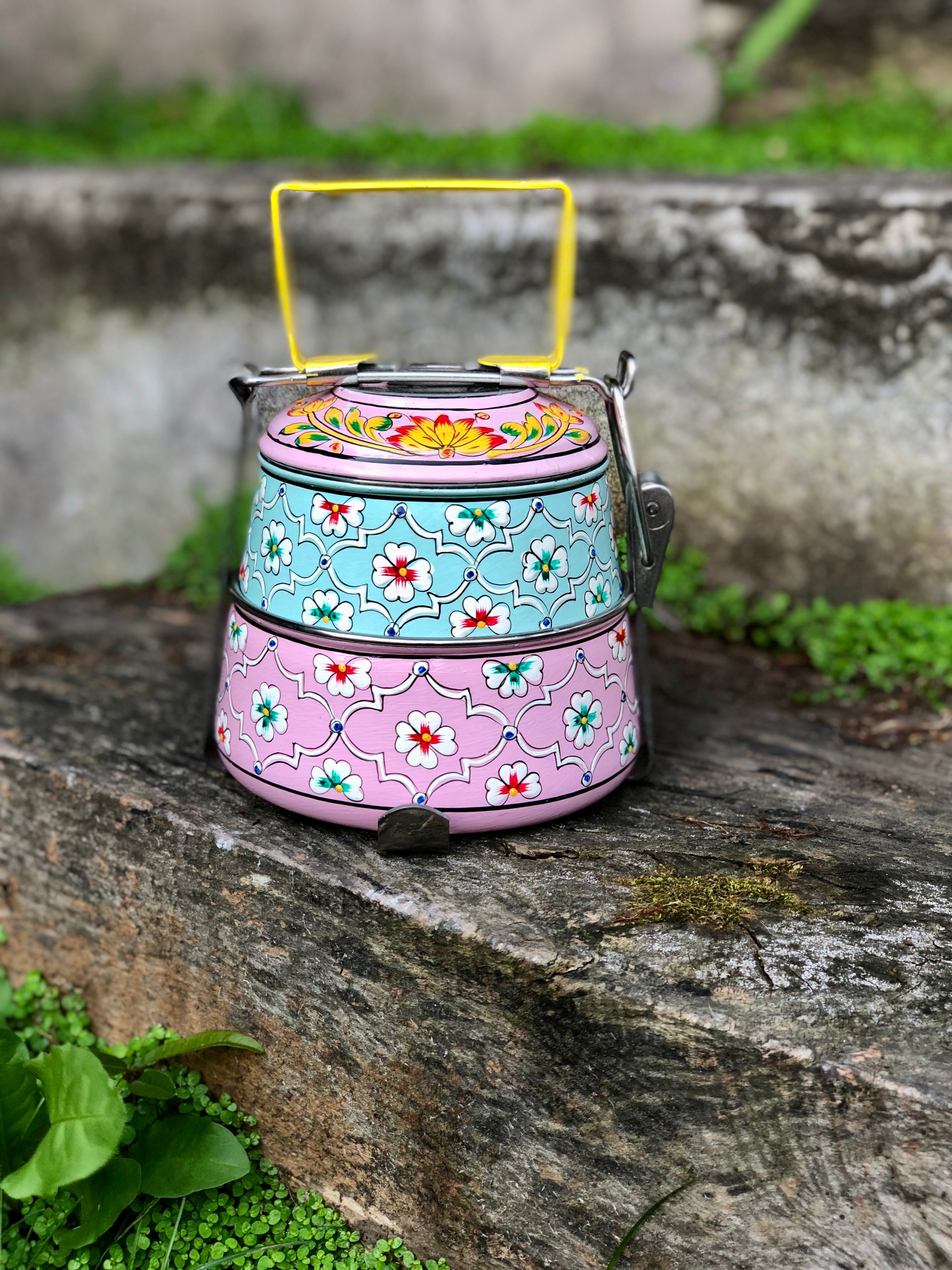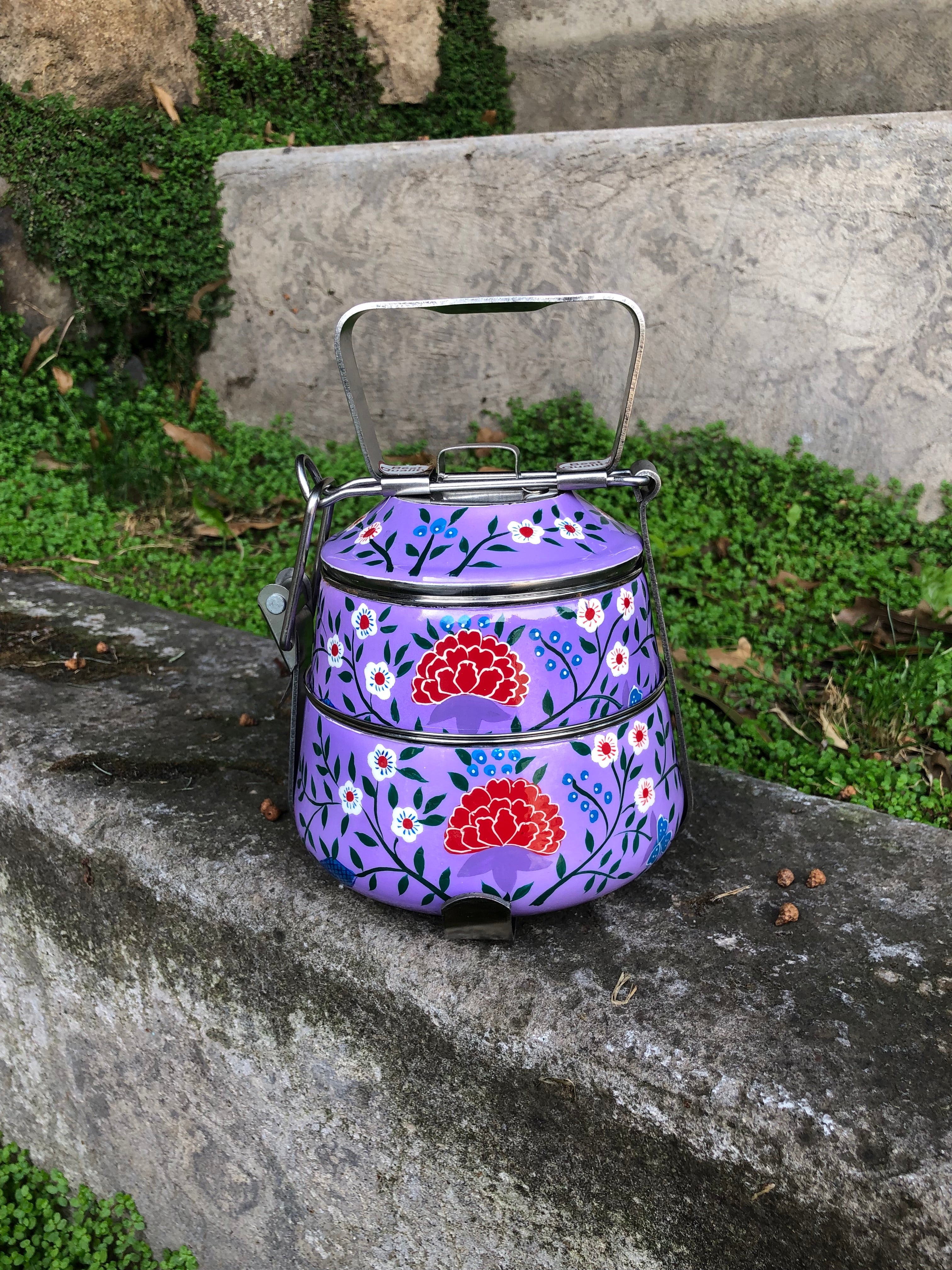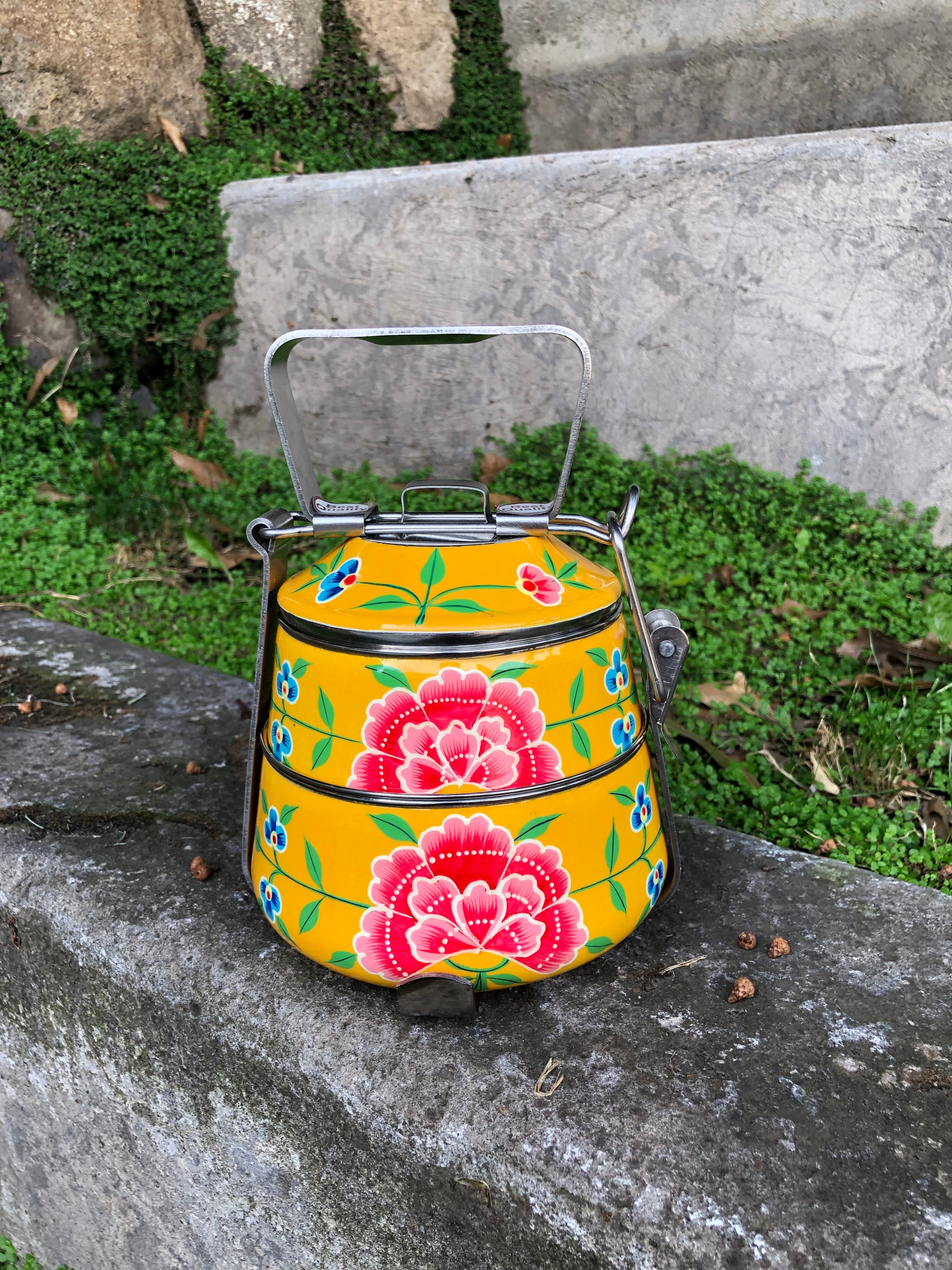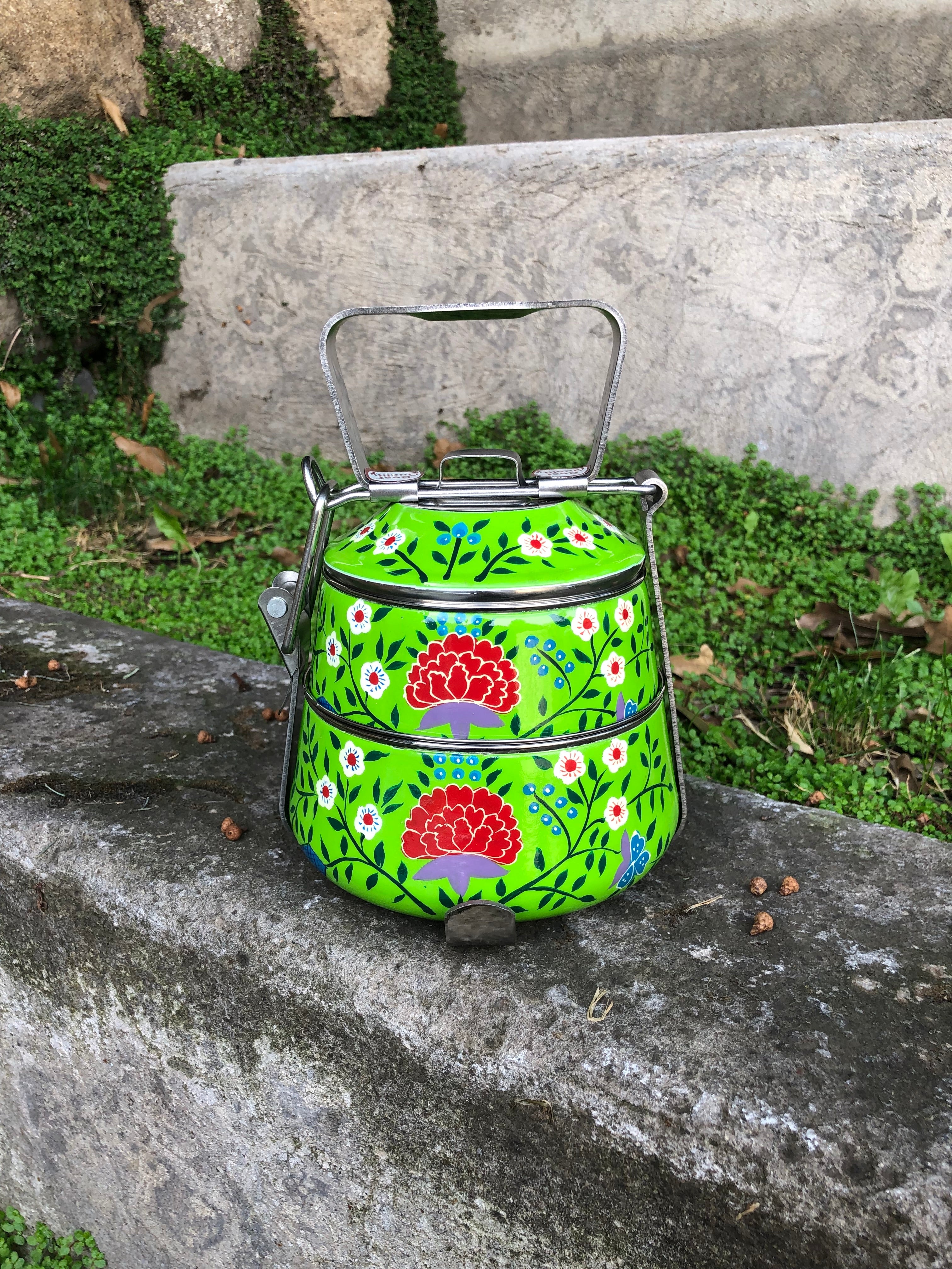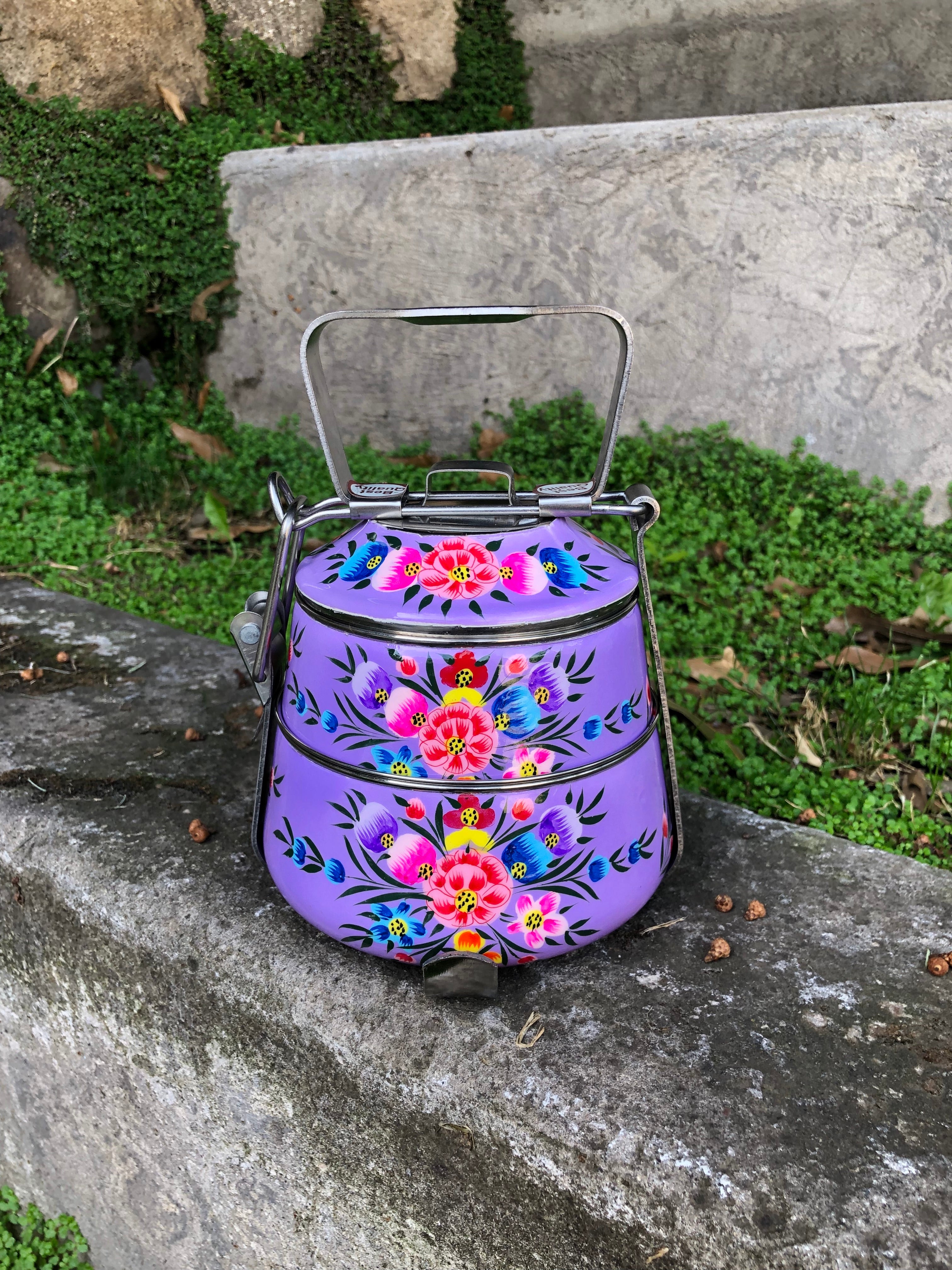 Viandas de acero inoxidable pintadas a mano alzada con diseños florales en la India.