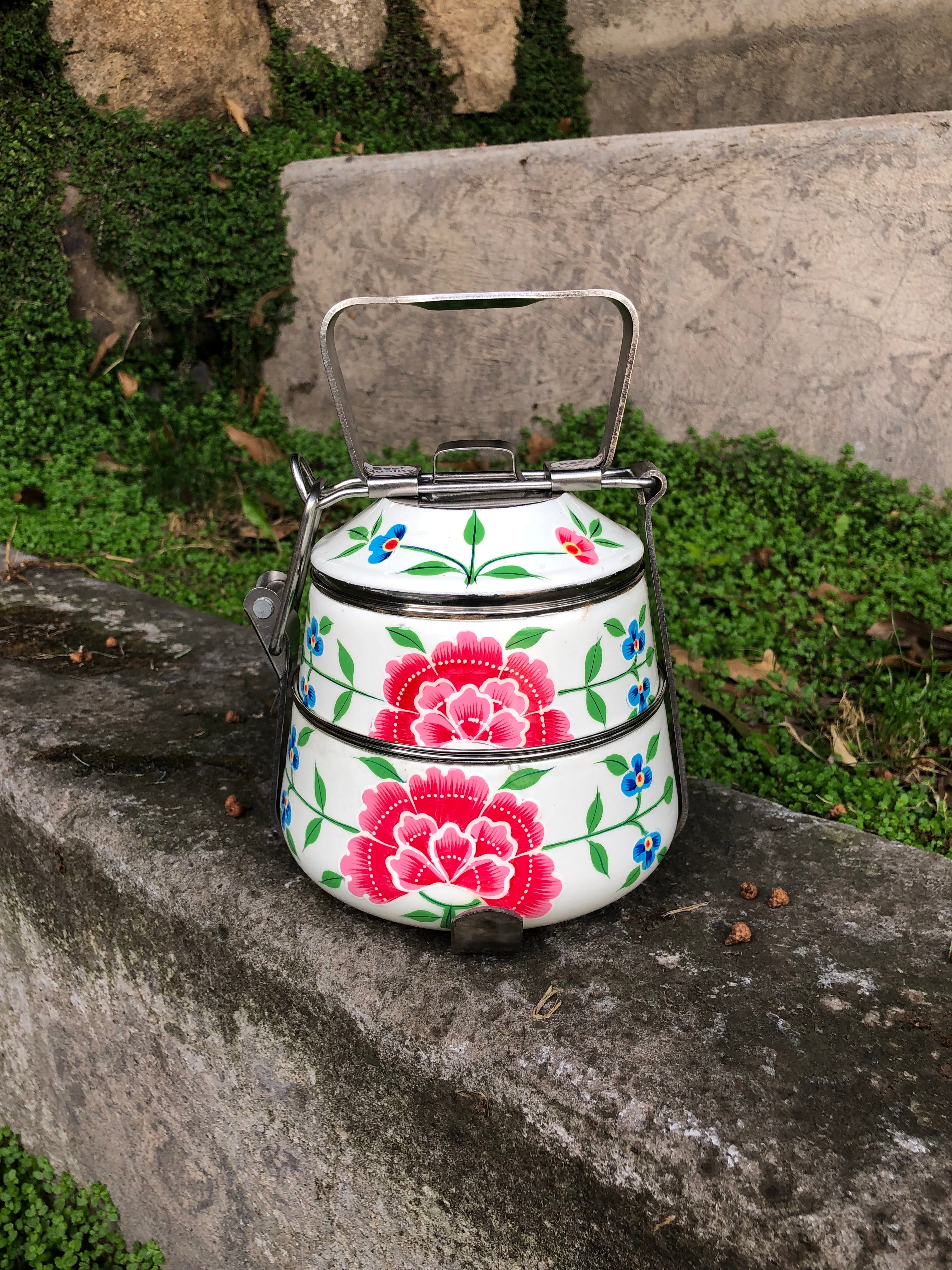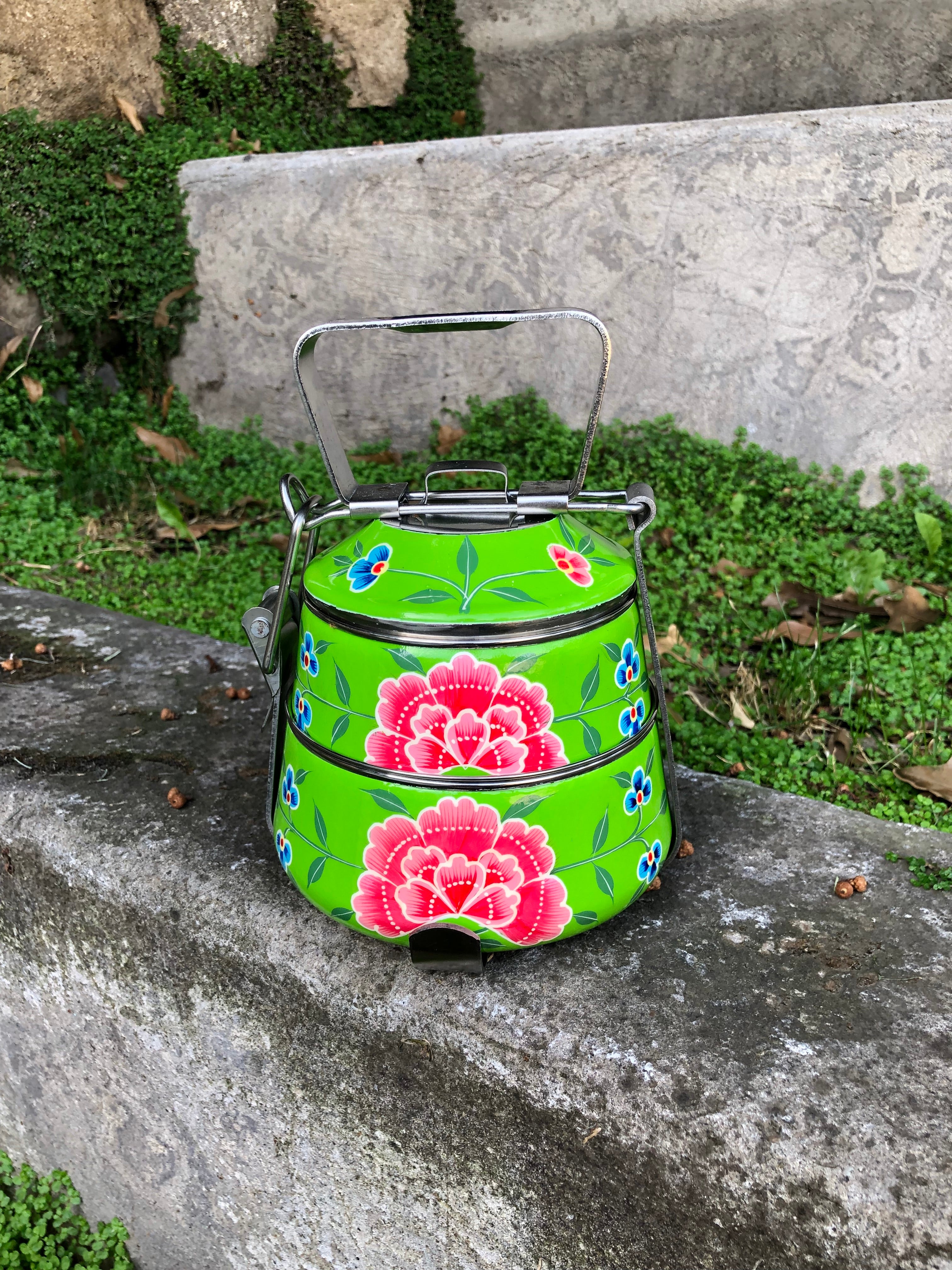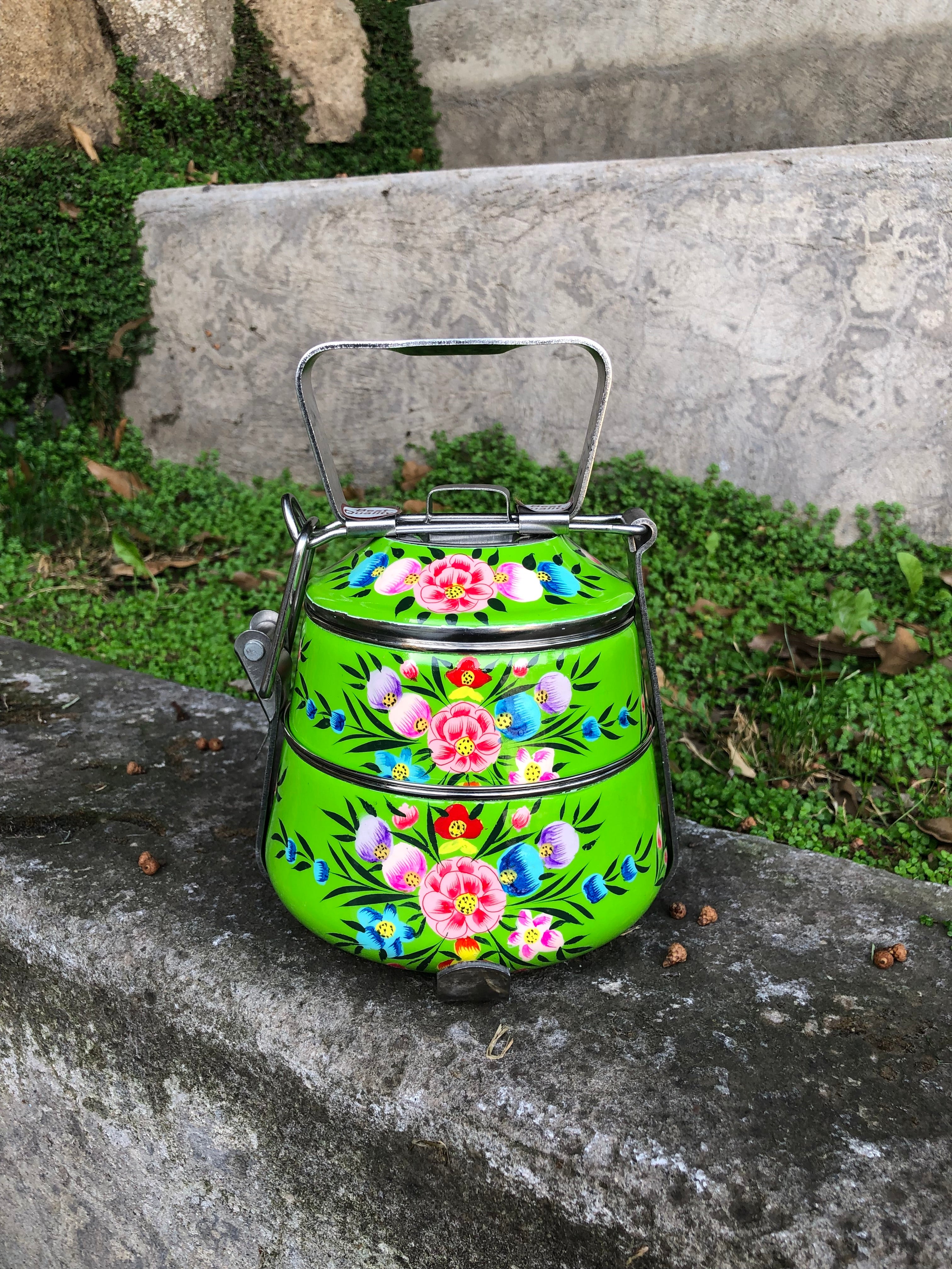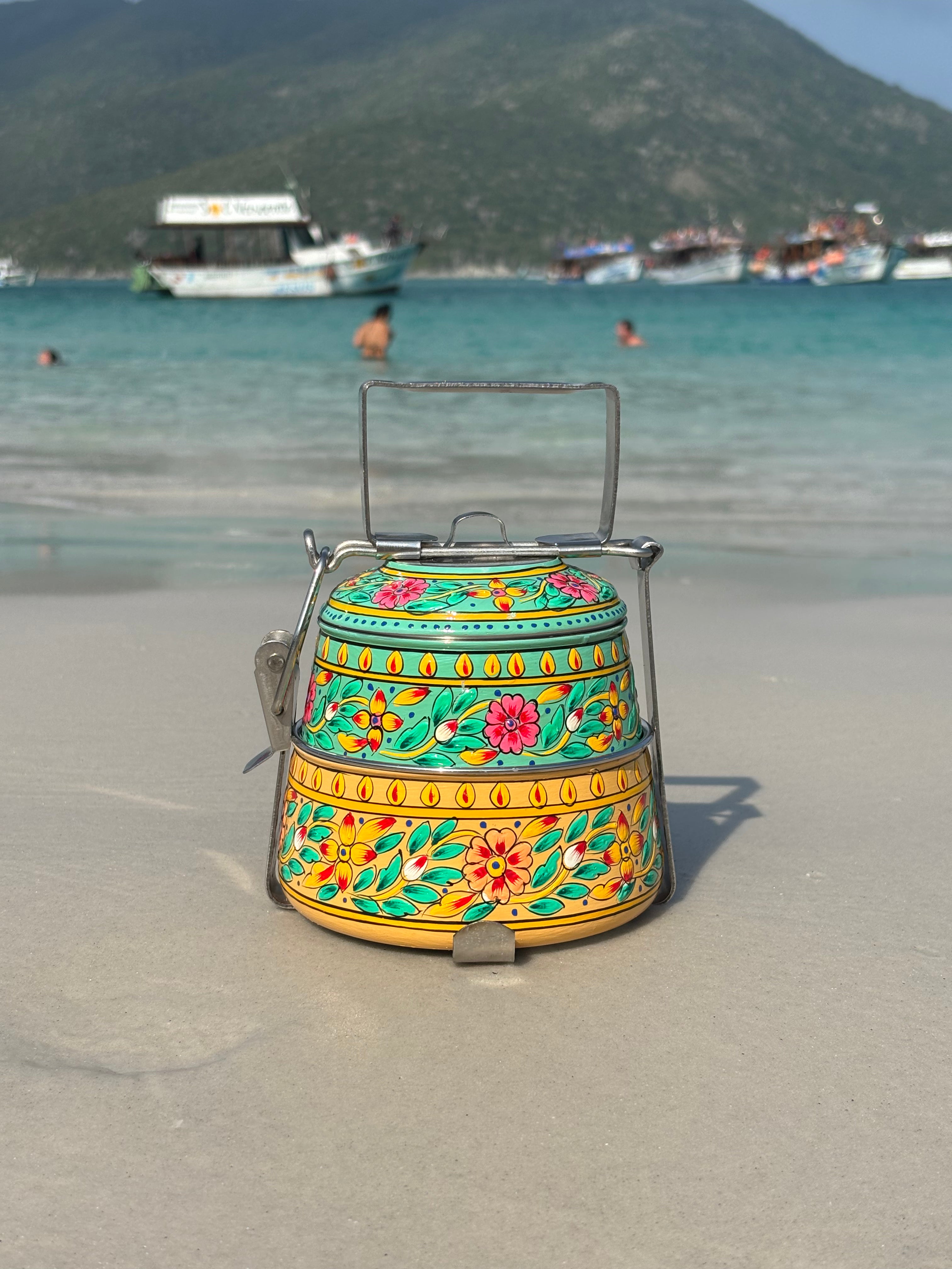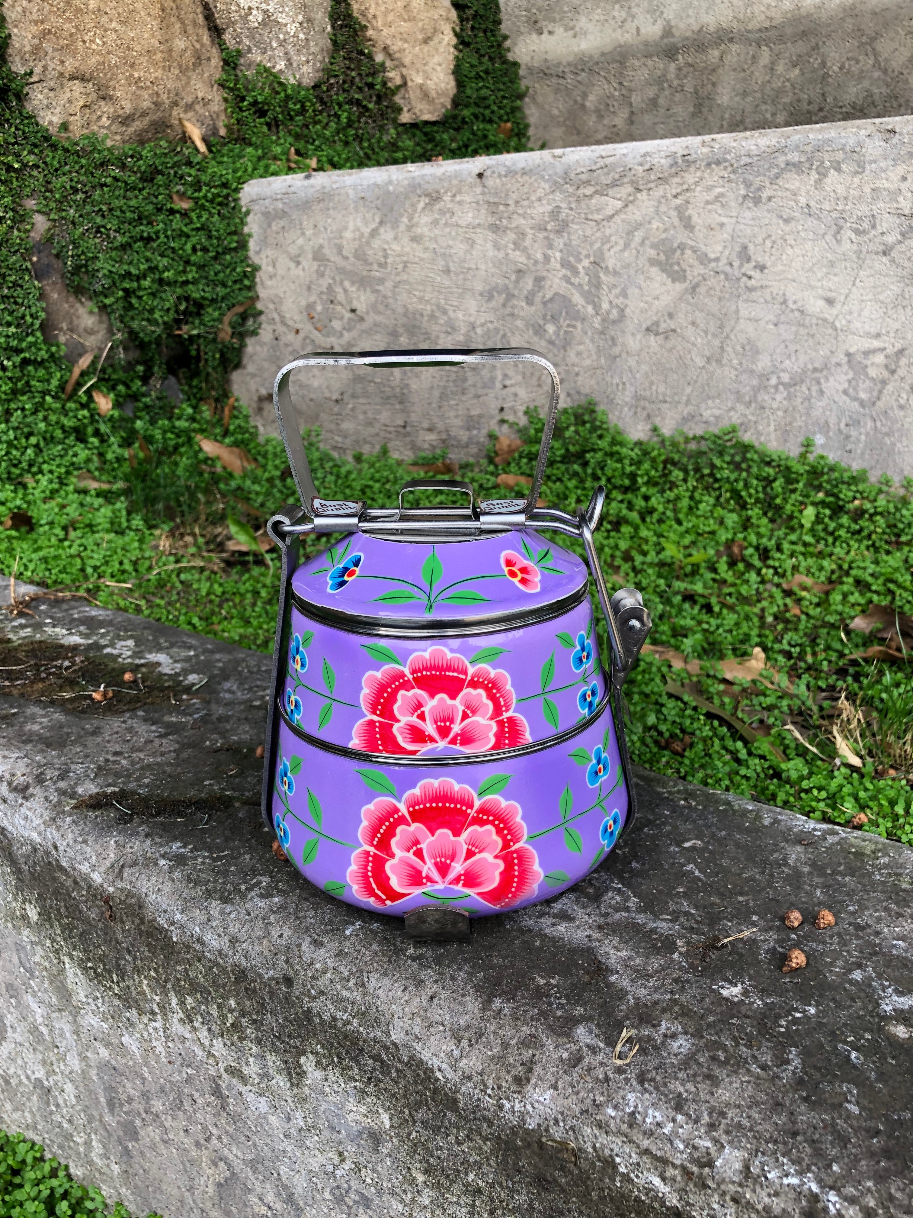 Viandas de acero inoxidable pintadas a mano alzada con diseños florales en la India.